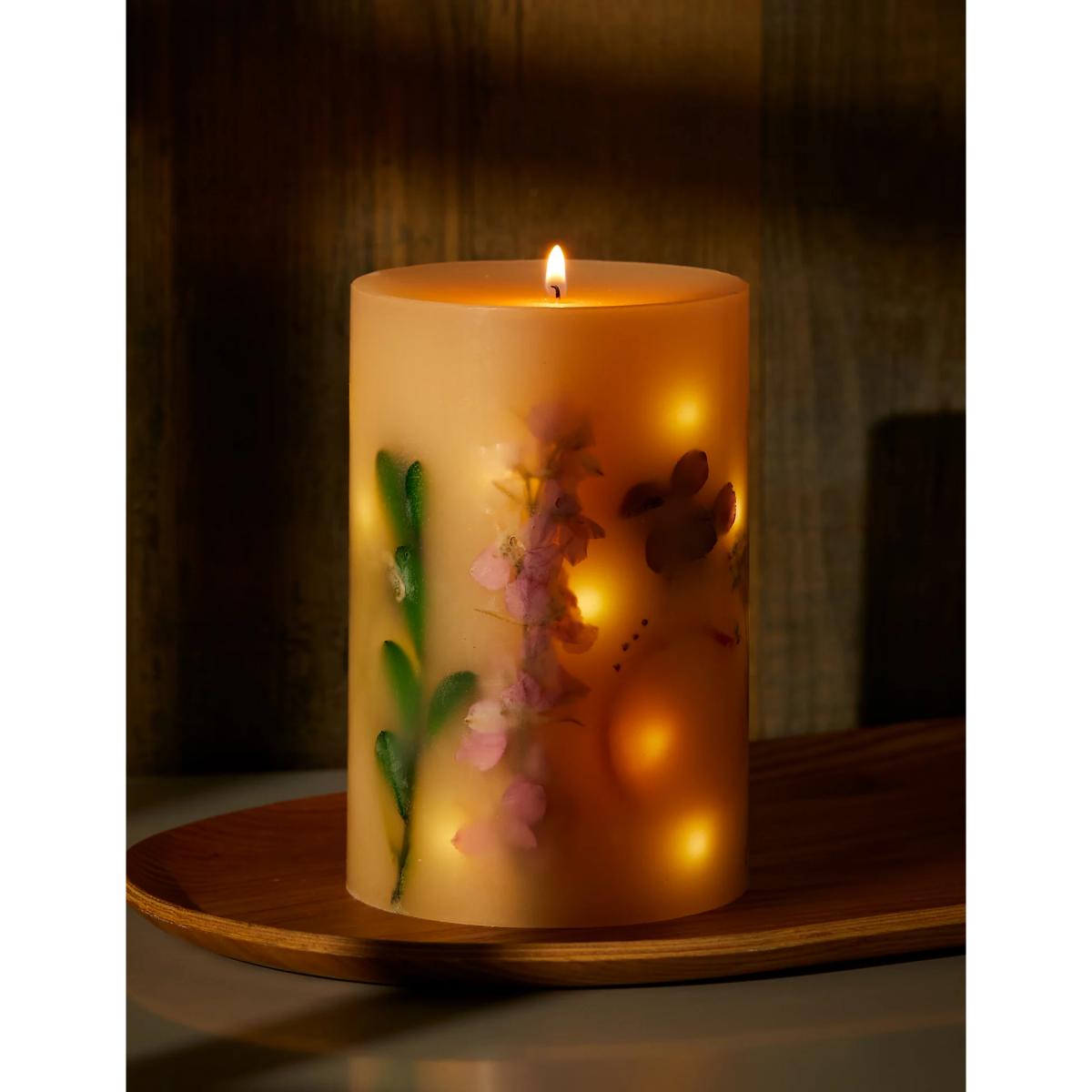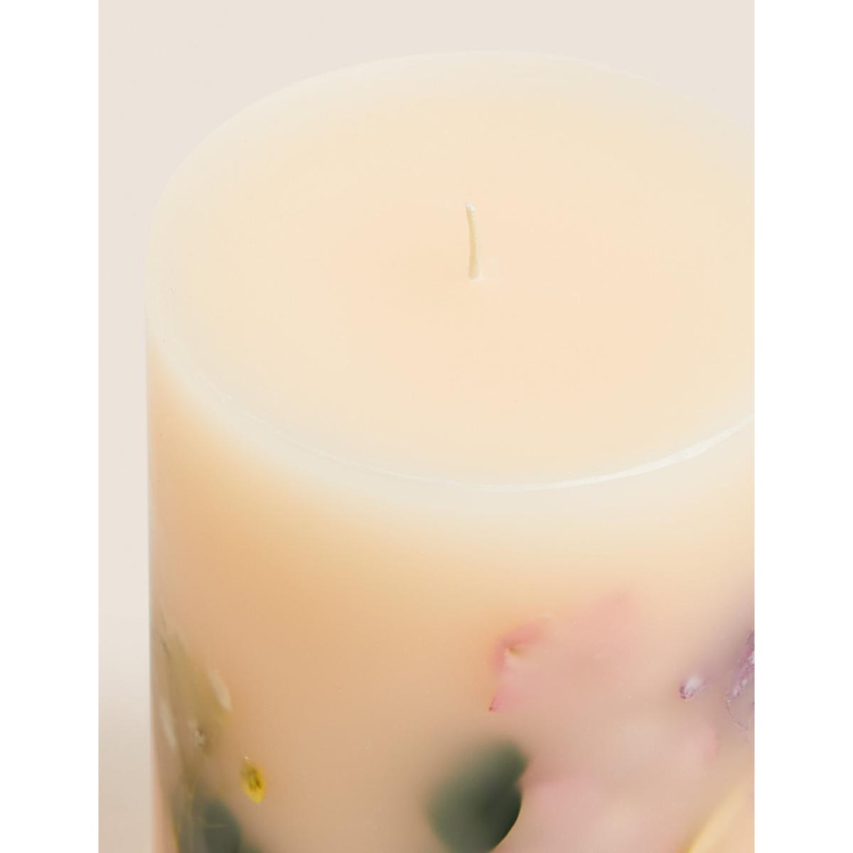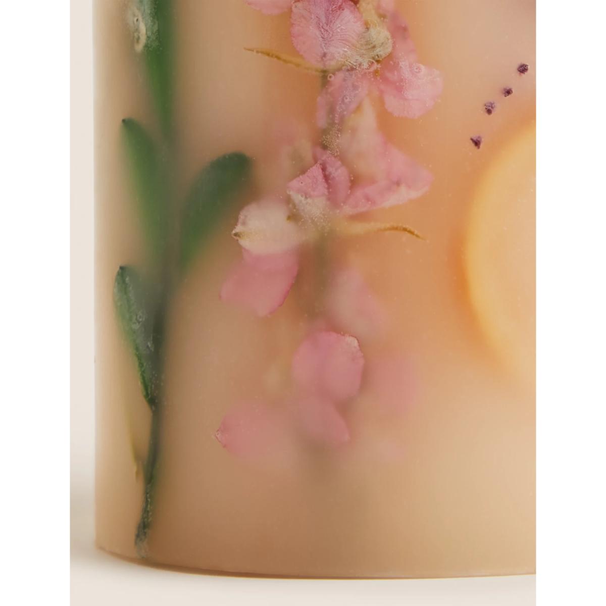 Infused with our Spring Meadows scent, this large botanical candle brings a fresh aroma into your space. Sweet notes of pear, peony and patchouli combine to make up the distinctive fragrance. LED lights are incorporated into the wax and illuminate when the wick is lit for an eye-catching effect.