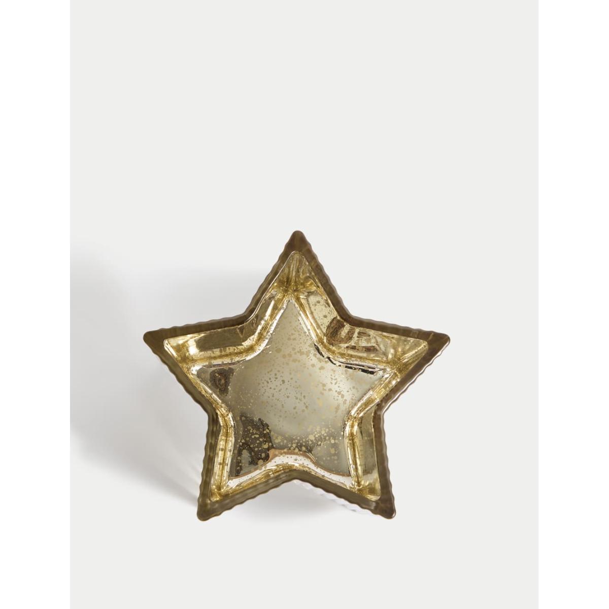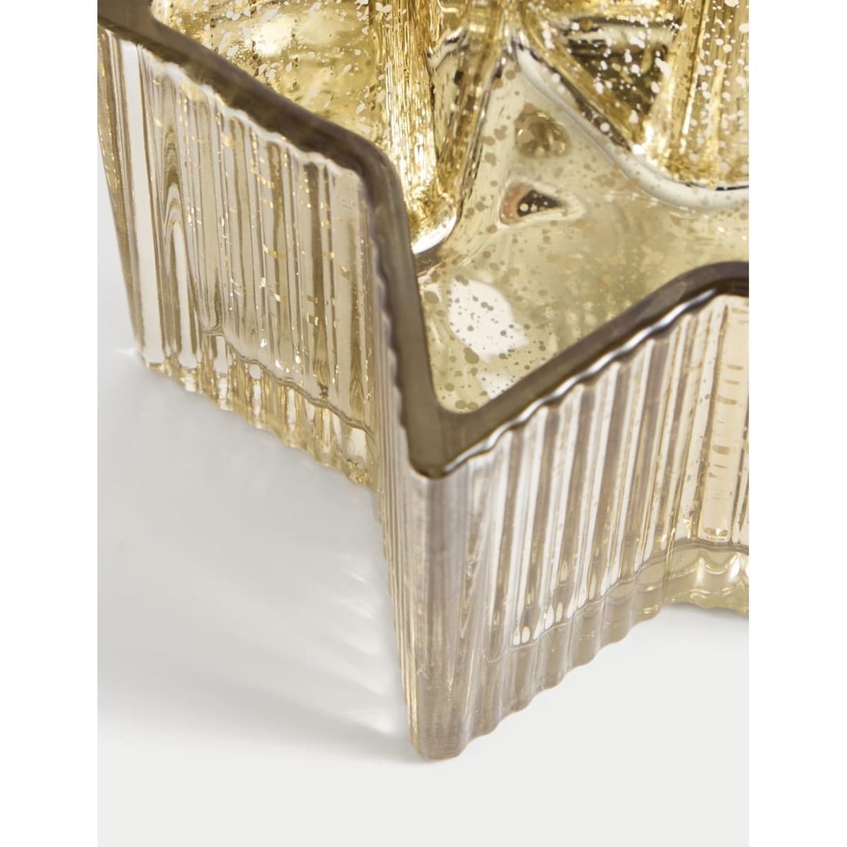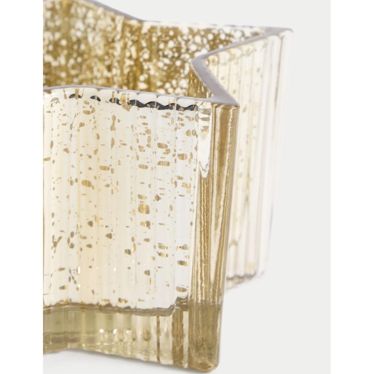 This large star-shaped candle holder has an elegantly festive look. It's made from ridged glass with a gold-toned finish to enhance the flame's twinkling effect.