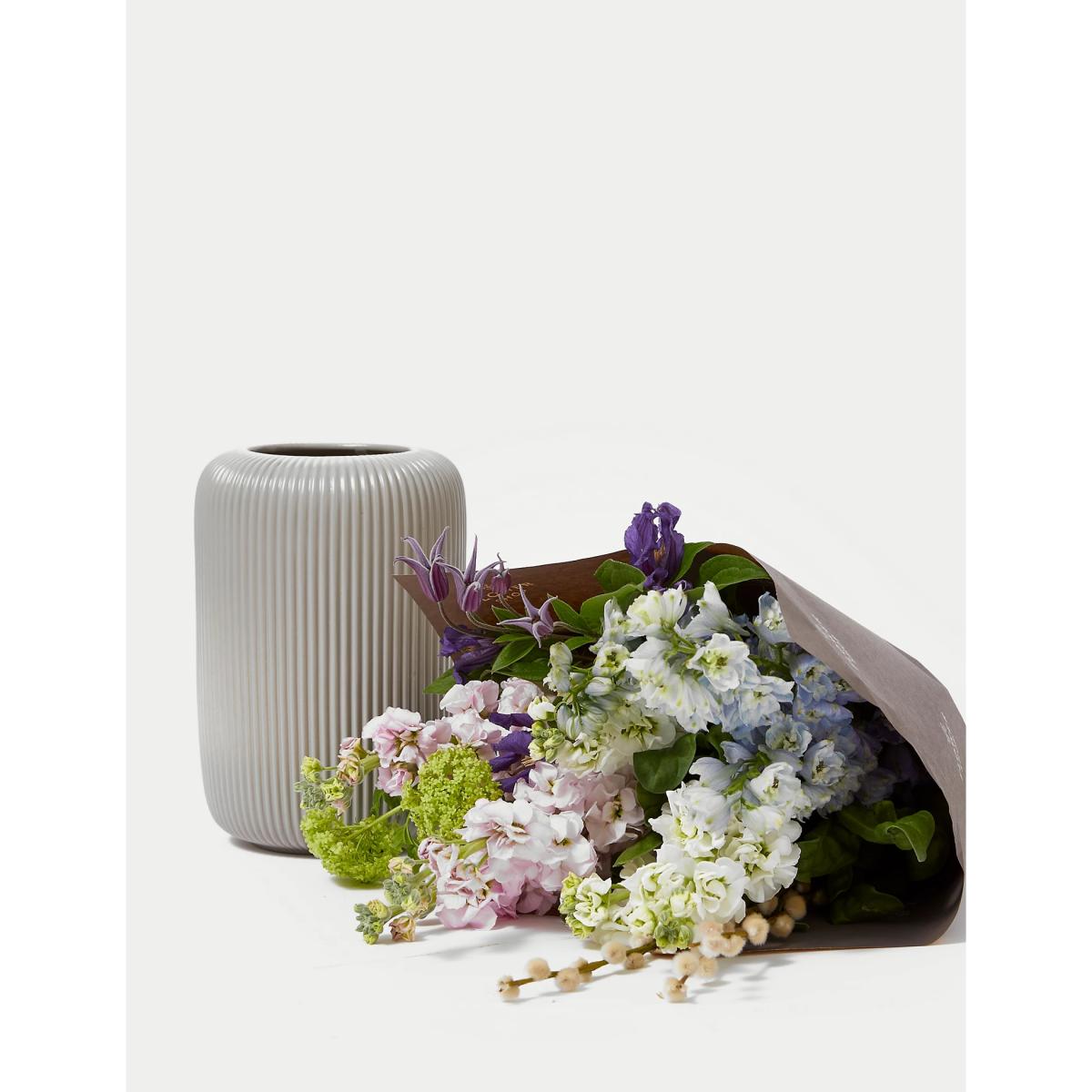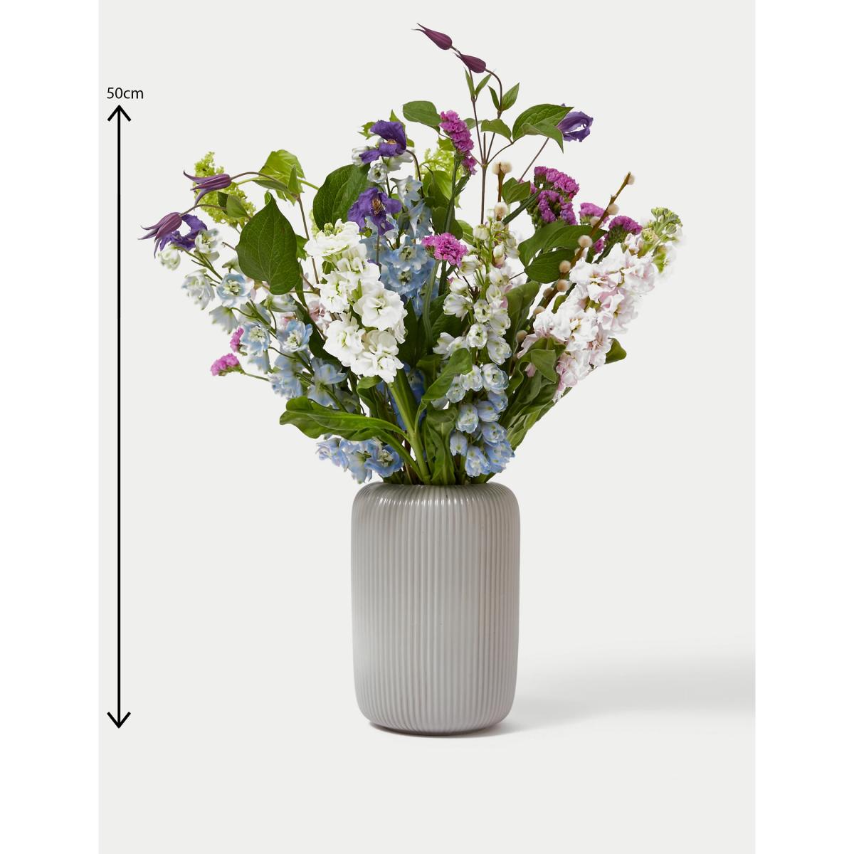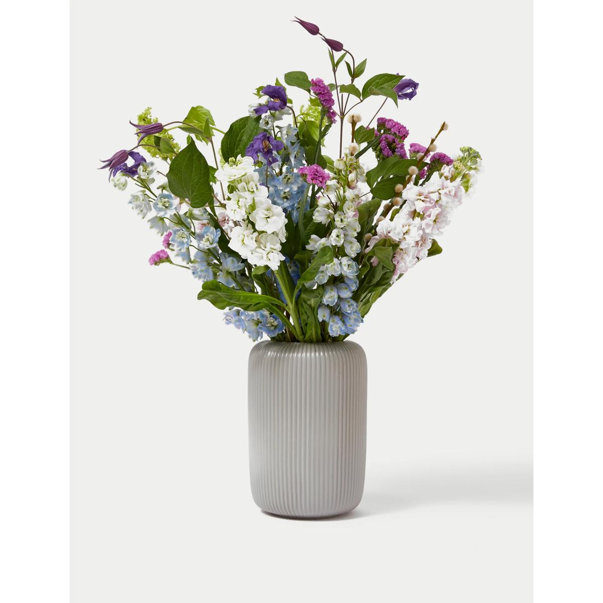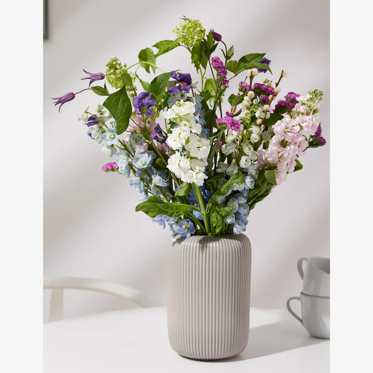 I love this vase and arrangement for its fresh, natural look that suits a variety of interiors. The delicate Delphinium and Clematis bouquet bring colour and life to a space without feeling overwhelming, making it a great focal point on a side table or mantelpiece. It works especially well in modern or Scandinavian-inspired interiors thanks to the simple, ribbed vase design that offers a subtle texture. For styling tips, try grouping it with other neutral or soft-toned accessories to let the flowers stand out, and change the water regularly to keep the blooms looking their best. This setup can easily transition from everyday casual to more polished arrangements for special occasions.
