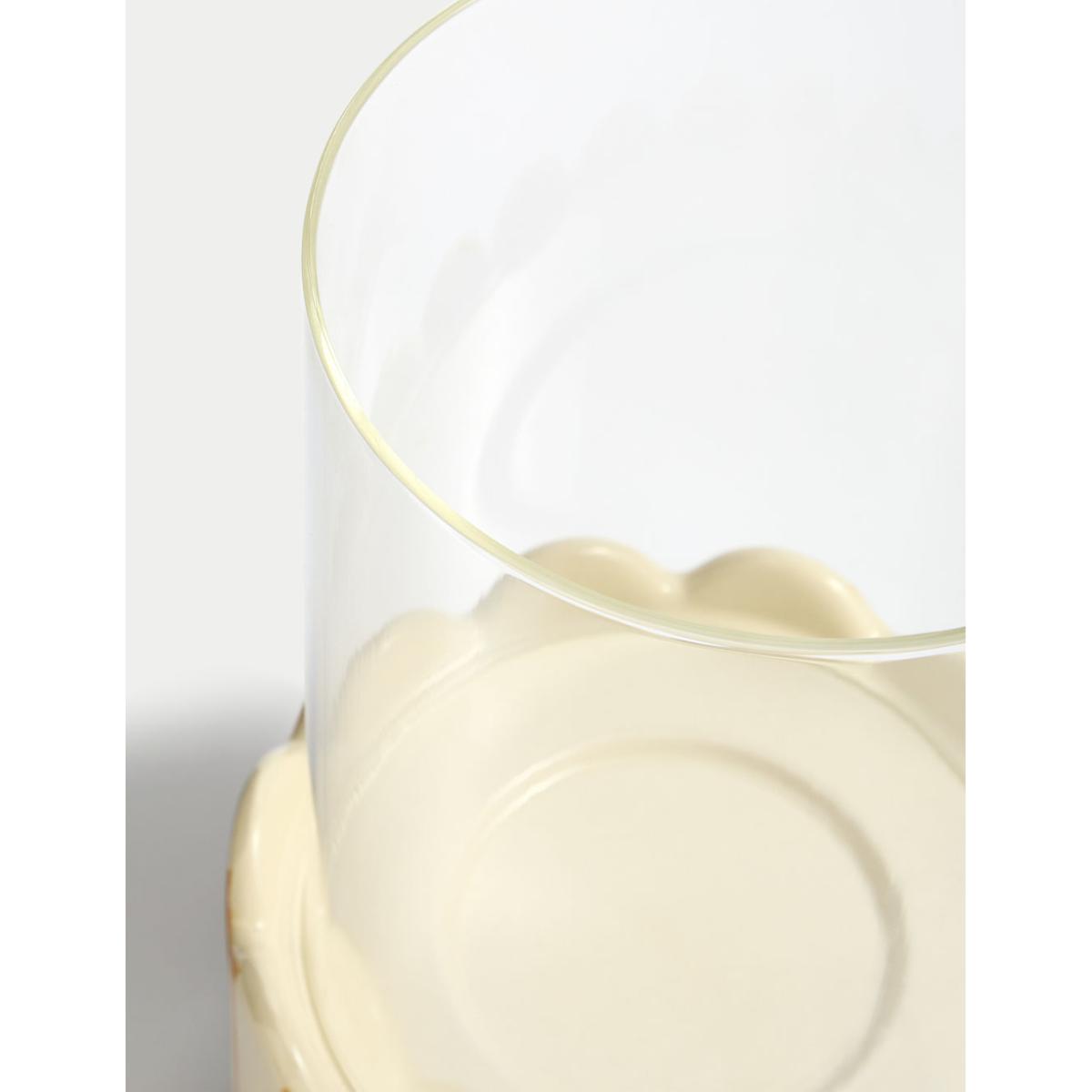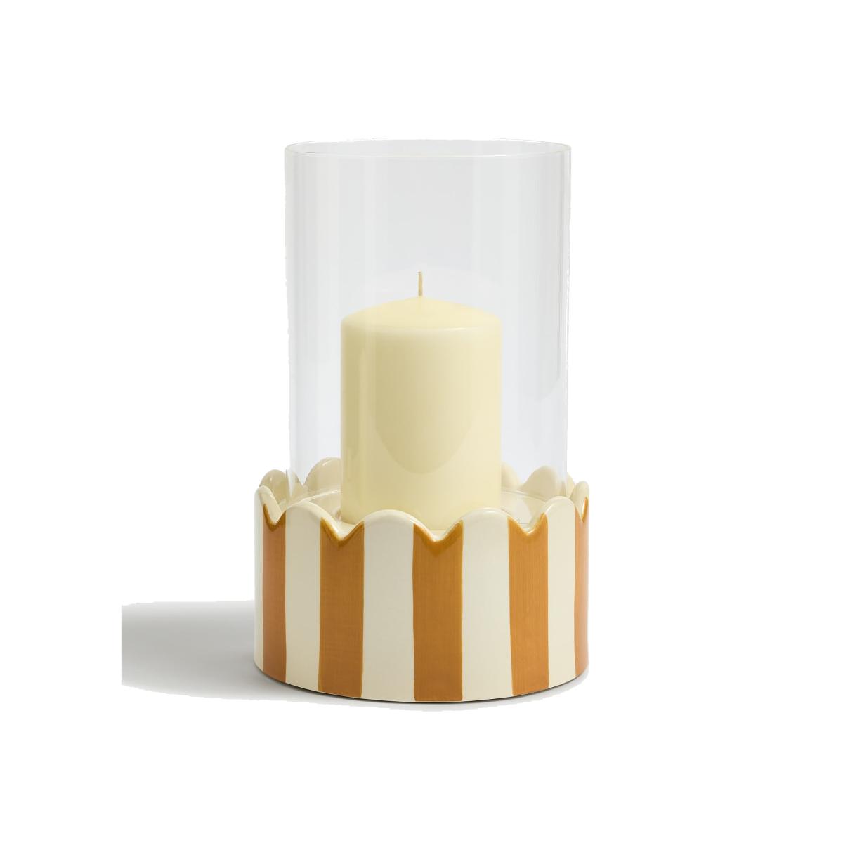Add a touch of whimsy to your space with this colourful hurricane candle holder. Featuring a ceramic base with hand-painted stripes and a playful scalloped edge, it creates a charming focal point on your tabletop or mantelpiece. The clear glass cylinder beautifully showcases the warm glow of your candle.