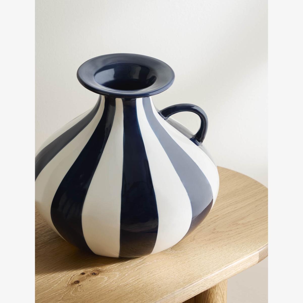 This striped ceramic vase is a striking way to display your blooms. It's designed in a curved shape with a small handle.