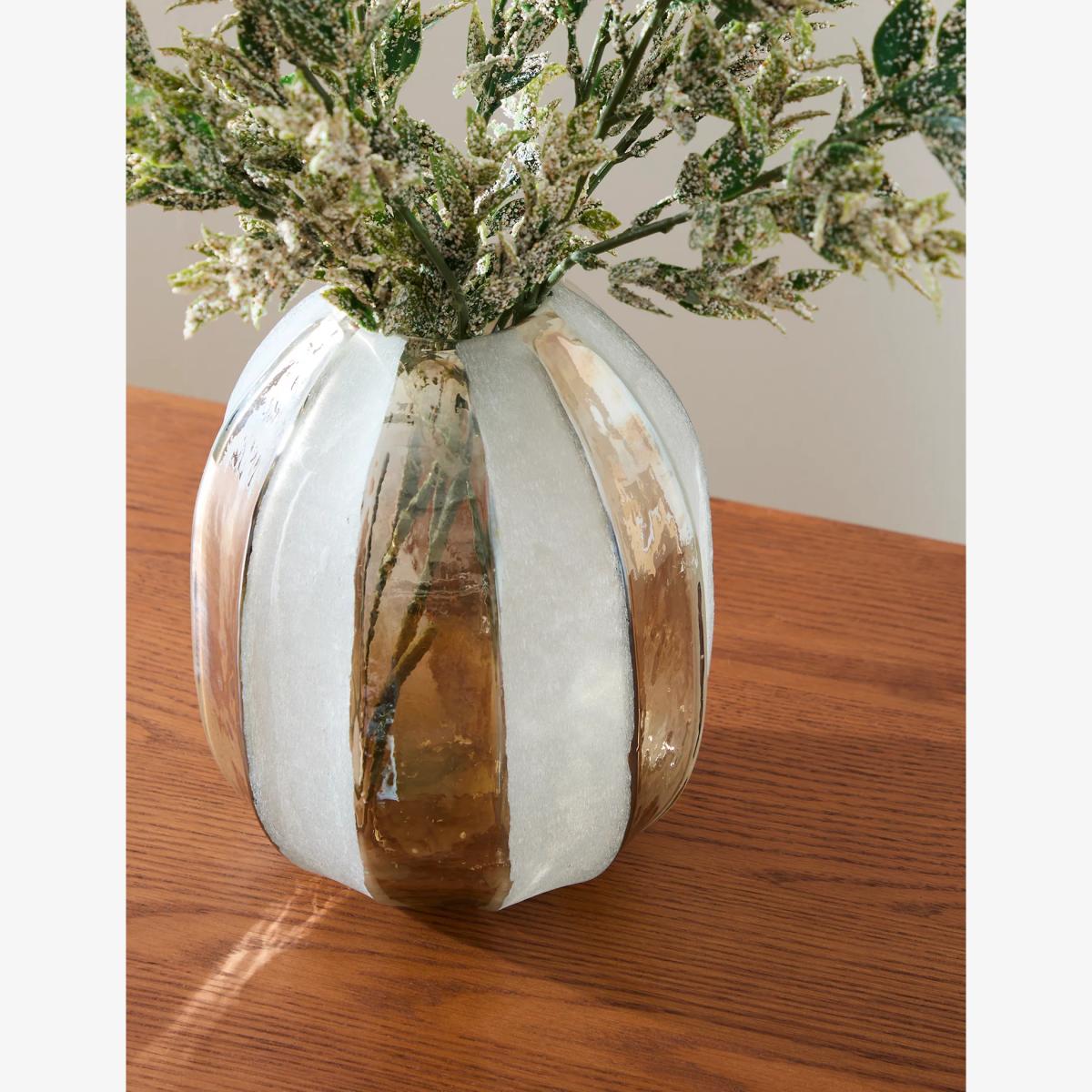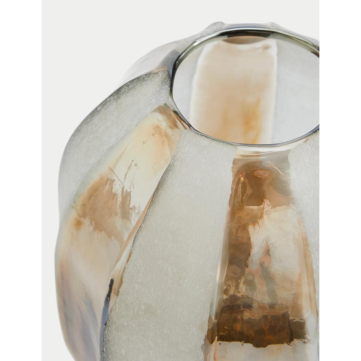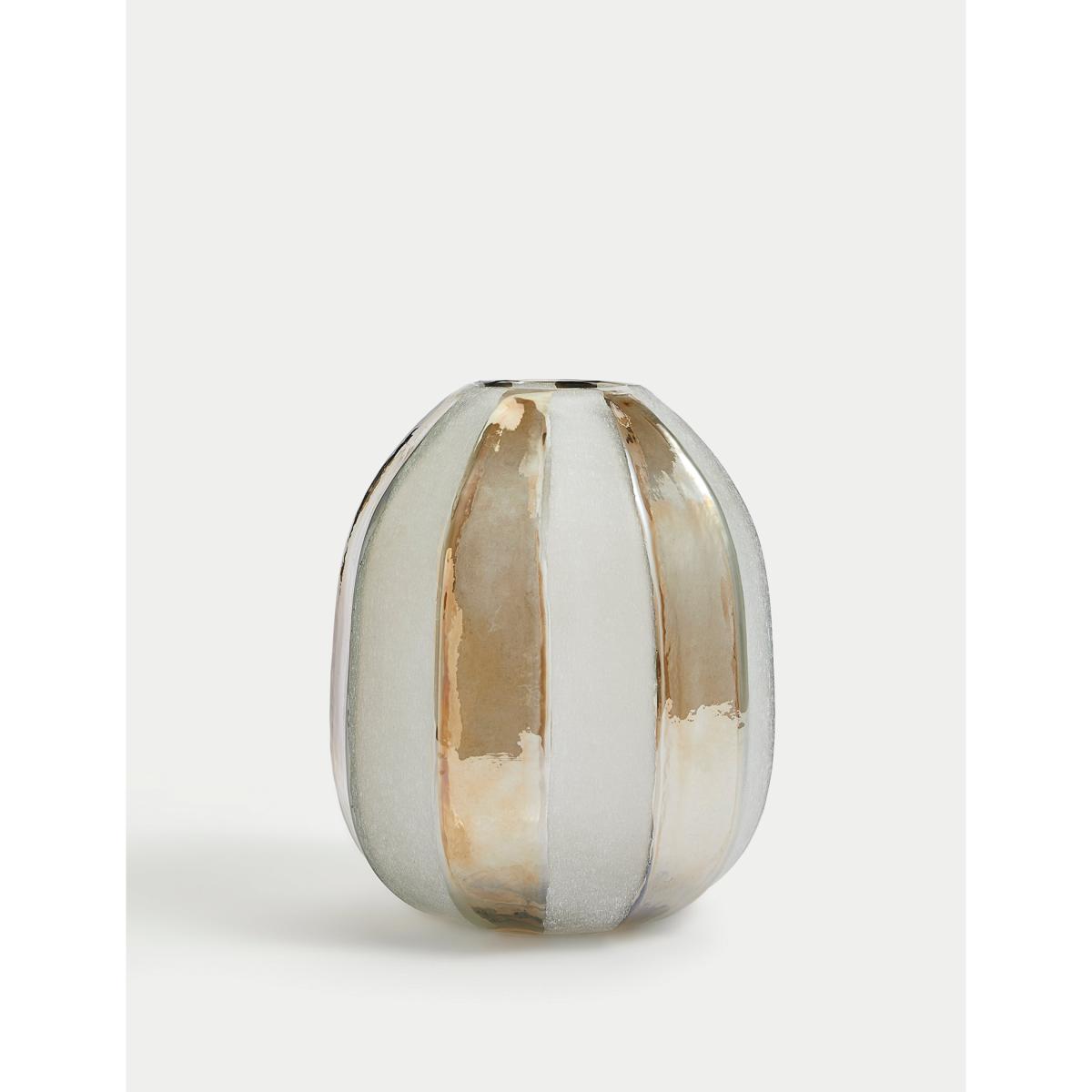 Our glass vase is a stylish way to present your favourite flowers. Made in an artfully uneven cylindrical shape, this modern piece features frosted glass and eye-catching metallic stripes.