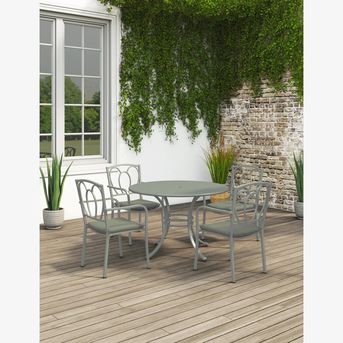 Make al fresco dining an elegant occasion with this dining table set from our Stroud range. It includes four chairs with wrought metal backs and a large round table. The set features a powder-coated finish for extra durability against the elements.