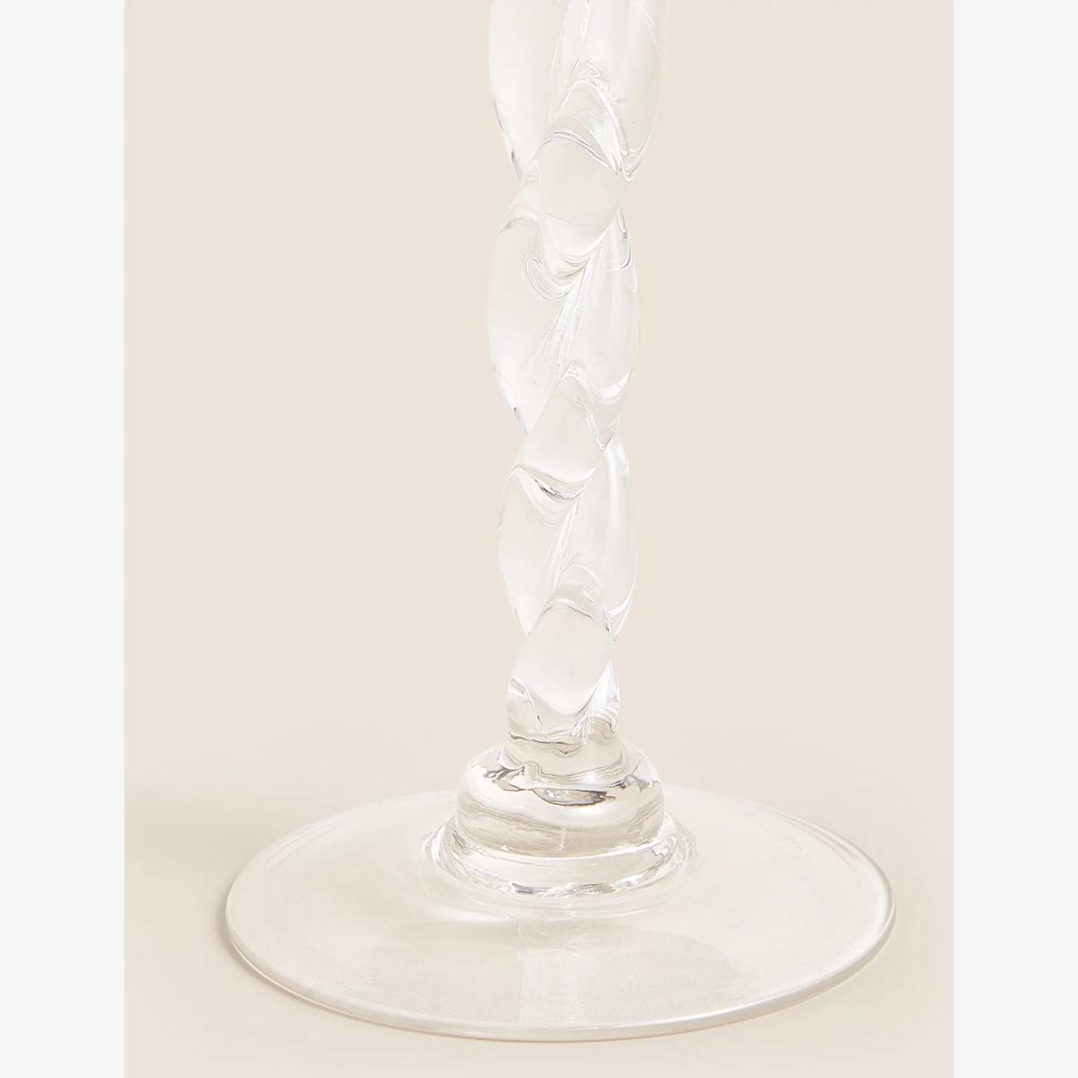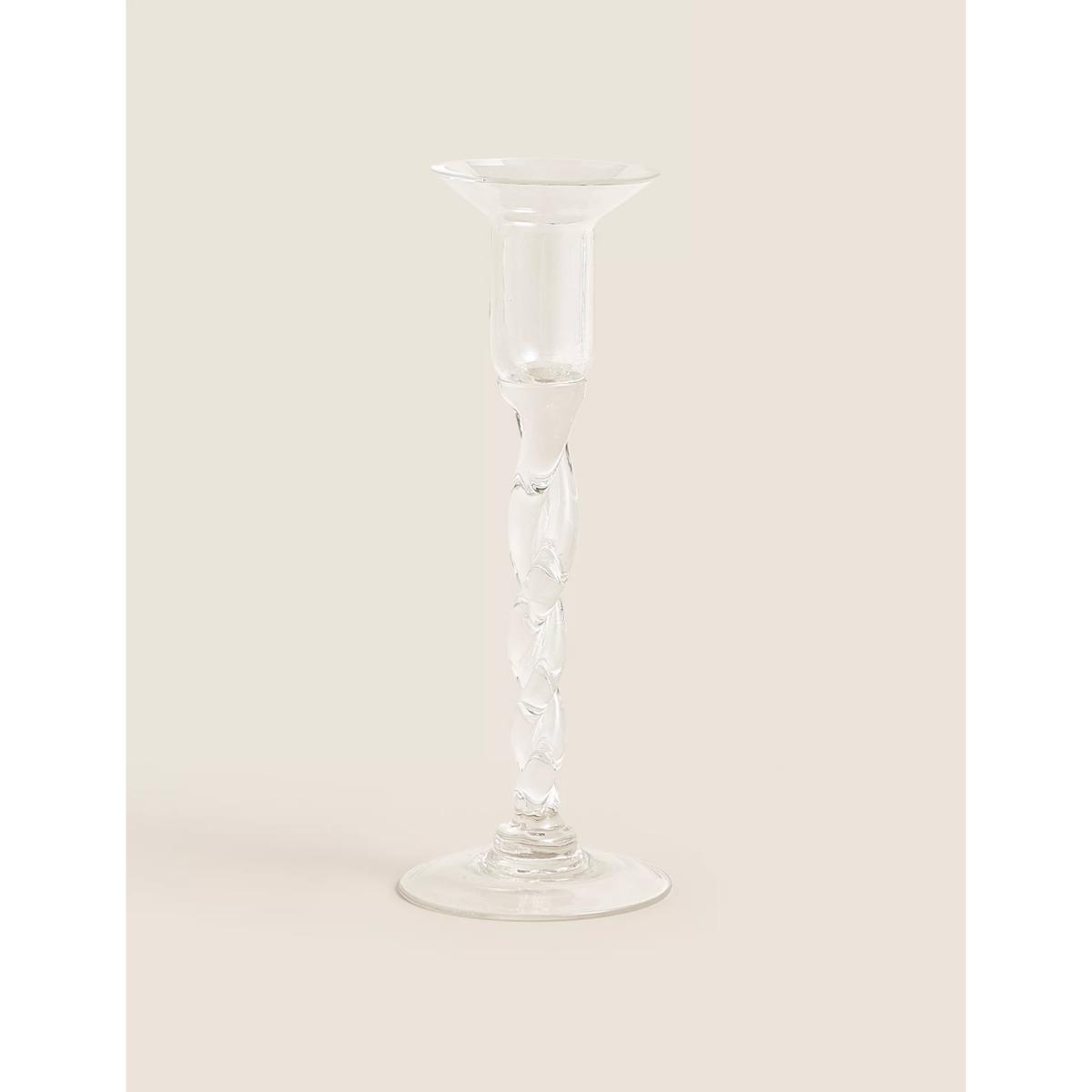 Elevate your table at your next dinner party with this candle holder. This elegant medium design is crafted from glass with a twisted swirl pillar and round base for a sophisticated feel.