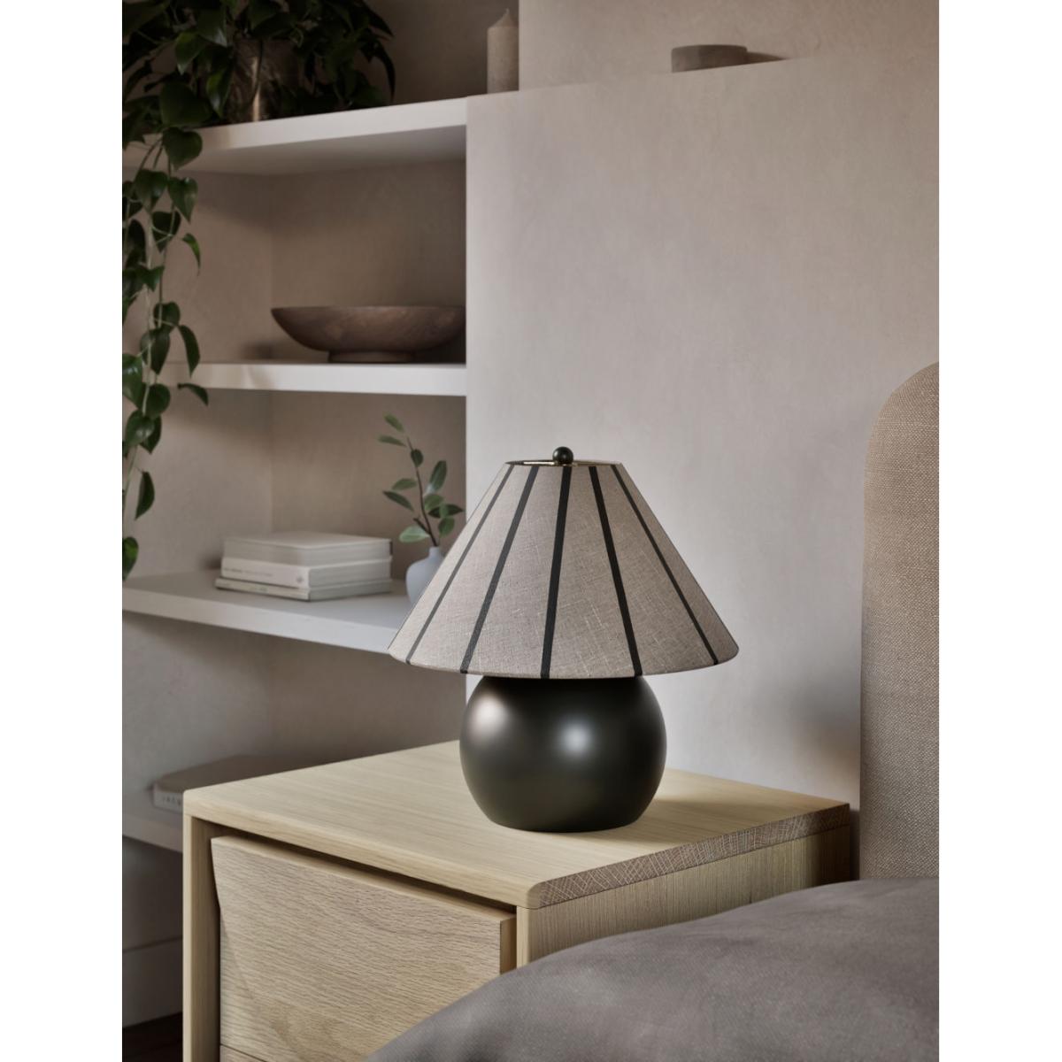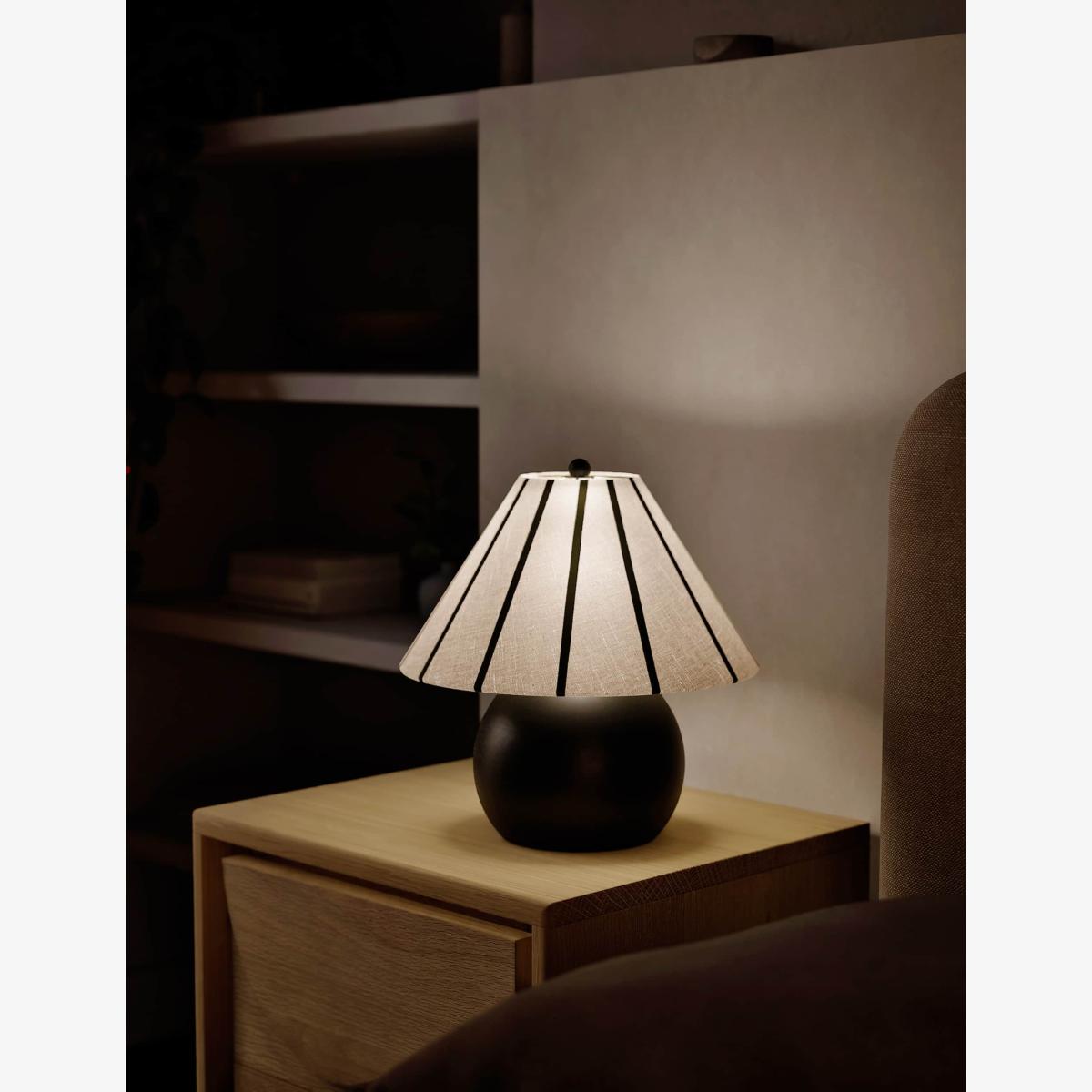 This elegant table lamp will add a timeless touch to your interior. It features a rounded base crafted from durable ceramic, paired with a striped fabric shade for a stylish look.