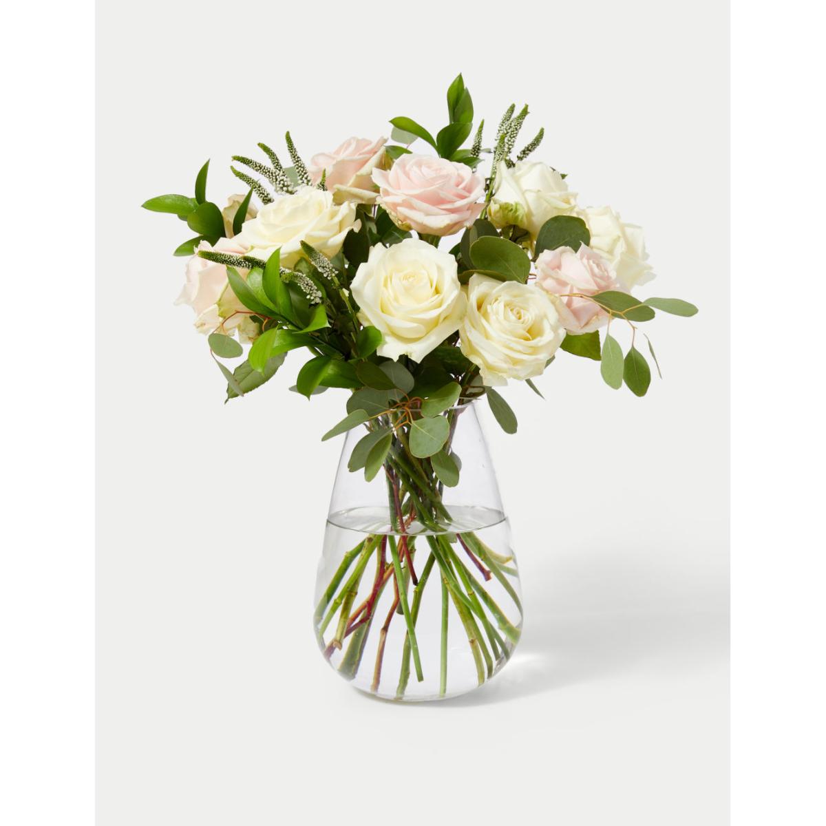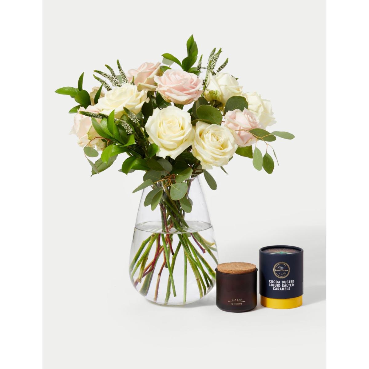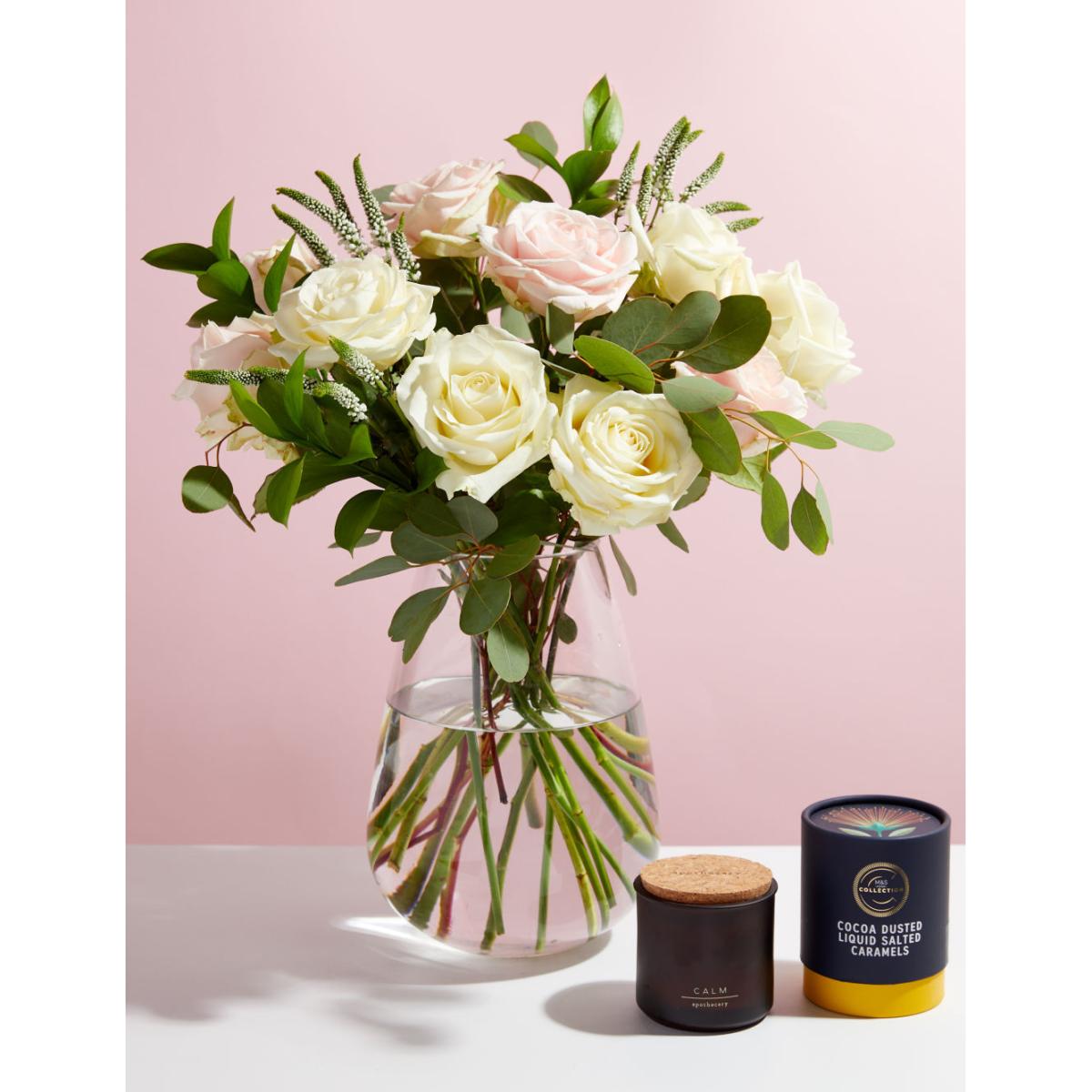 Send your love with our Thinking of You bouquet, plus some extra thoughtful treats. Your loved one will receive a stunning 20-stem arrangement filled with roses and spray veronica, beautifully framed by eucalyptus and hard ruscus foliage. They'll also find a scented Calm candle from our Apothecary range, plus a box of delicious salted caramel truffles to enjoy. Colours may vary slightly throughout the season.