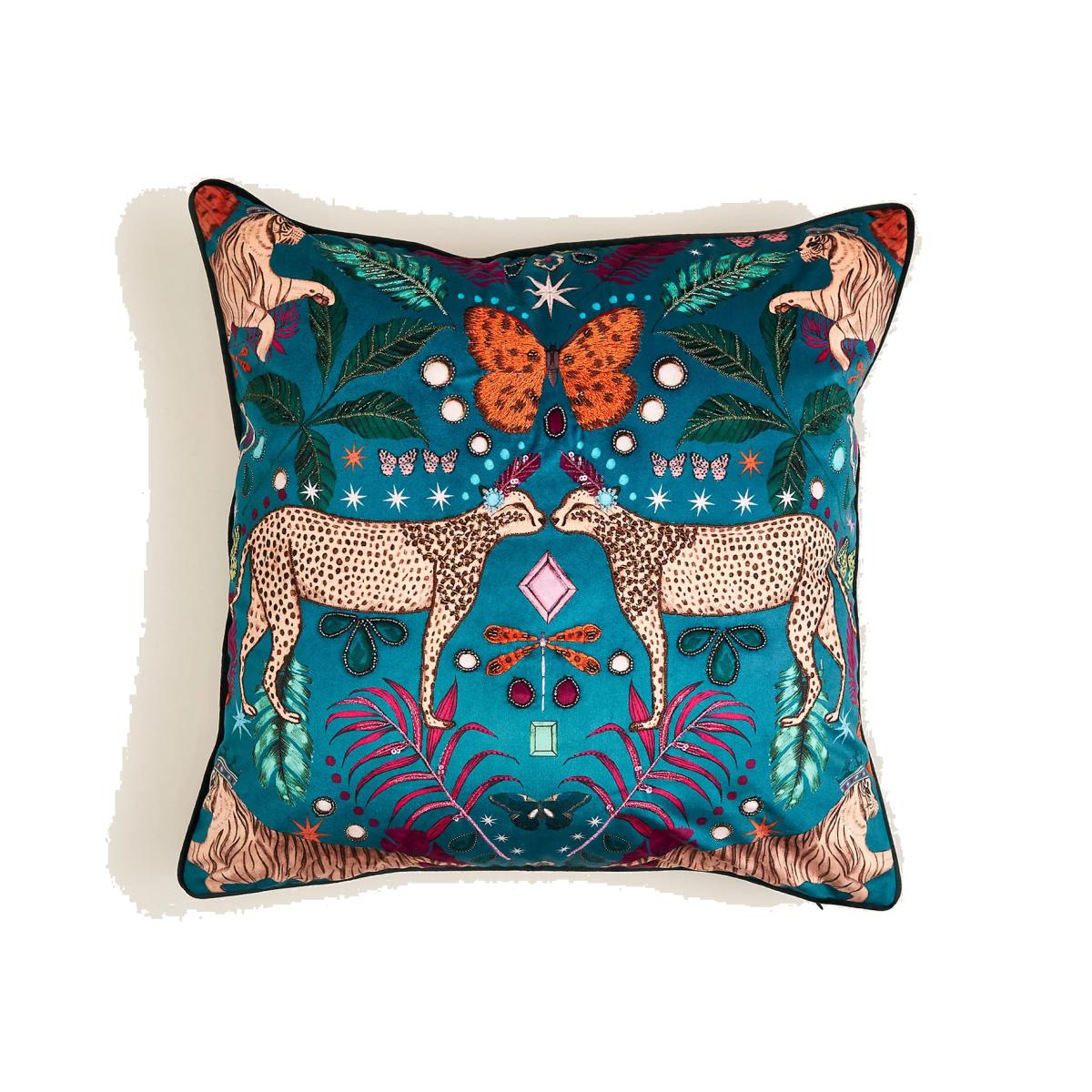 Bring an exotic twist to your interior with this embroidered and embellished scatter cushion. The artistic design features cheetahs, tigers and butterflies. Sequinned embellishments add some sparkle. The velvet cover feels soft to the touch and is filled with feathers.