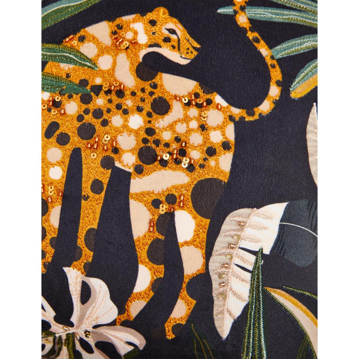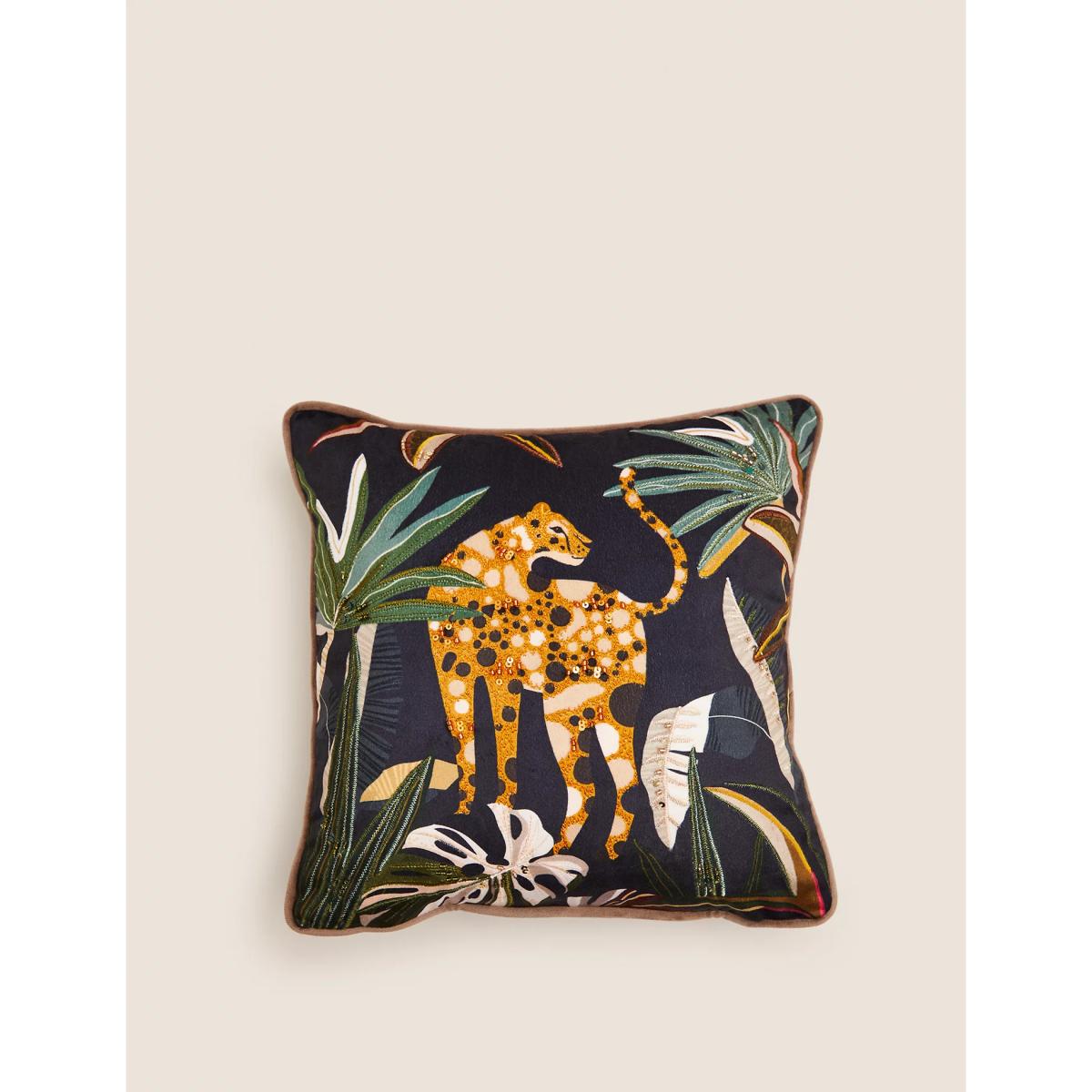This luxurious small velvet cushion is embellished with a striking motif of a cheetah among tropical leaves. Embroidery and sequins add extra richness to the design, and a contrasting piped trim gives a neat finish.