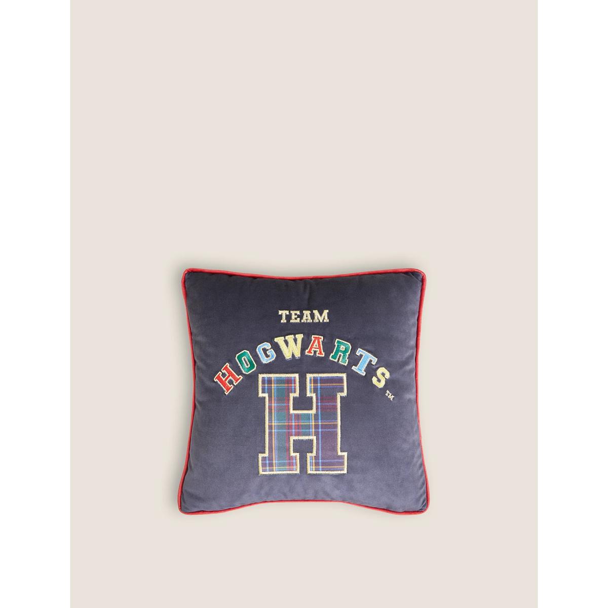 Add some magic to your space with this velvet Harry Potter™ cushion. This small scatter style features a 'Team Hogwarts' logo and a check 'H' on the front. It's finished with contrast piping. Made with recycled polyester filling.