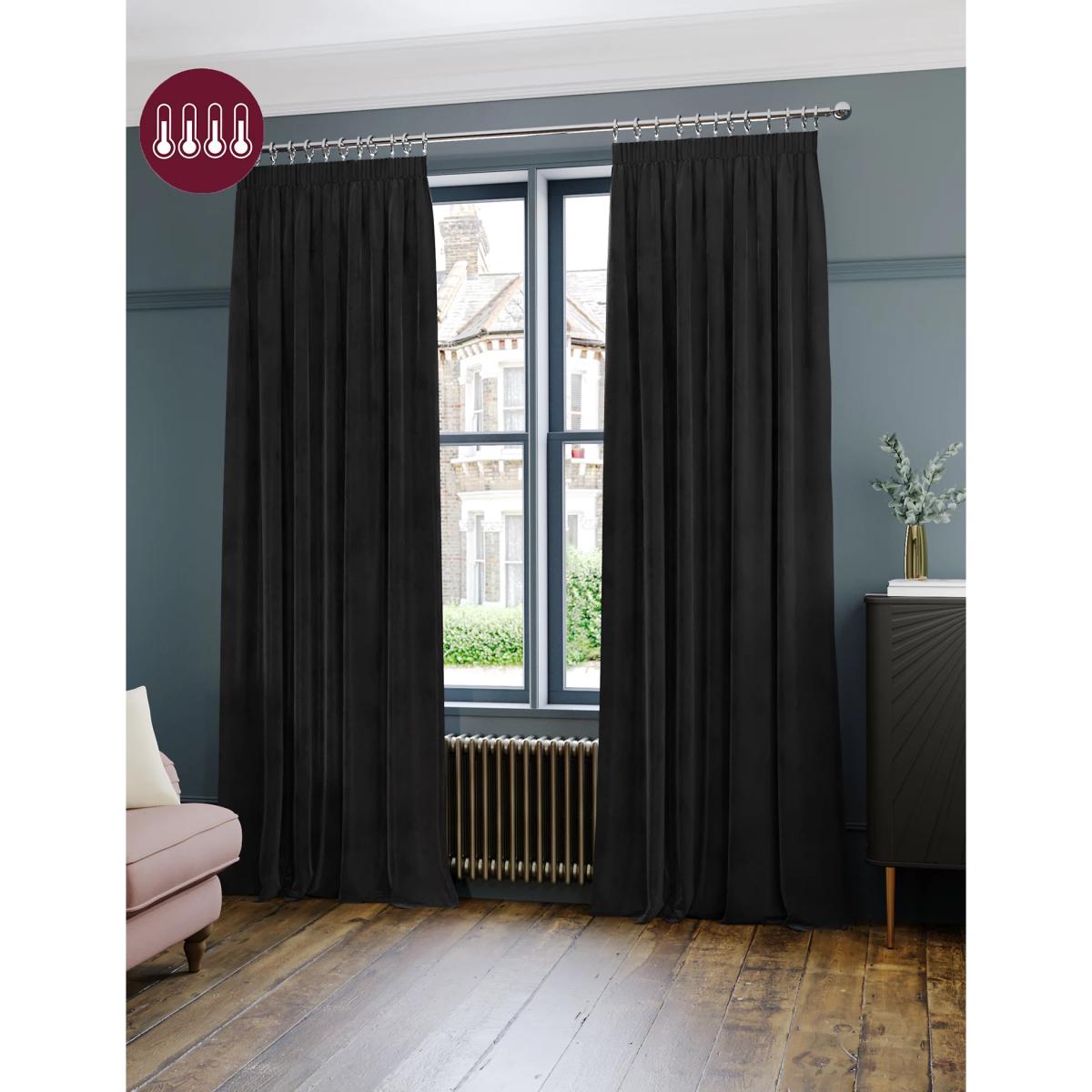With their rich velvet fabric and classic pencil pleats, these curtains will add a luxurious touch to your home. They have a lined finish which reduces light and ensures total privacy. These curtains are also temperature smart, which means their thermal lining will help keep your room cool during the summer and warm during the winter. Ultra Warmth Heat Rating: These curtains have been given our Ultra Warmth rating which means that this fabric is proven to show enhanced thermal performance helping you keep warm on the chilliest days.