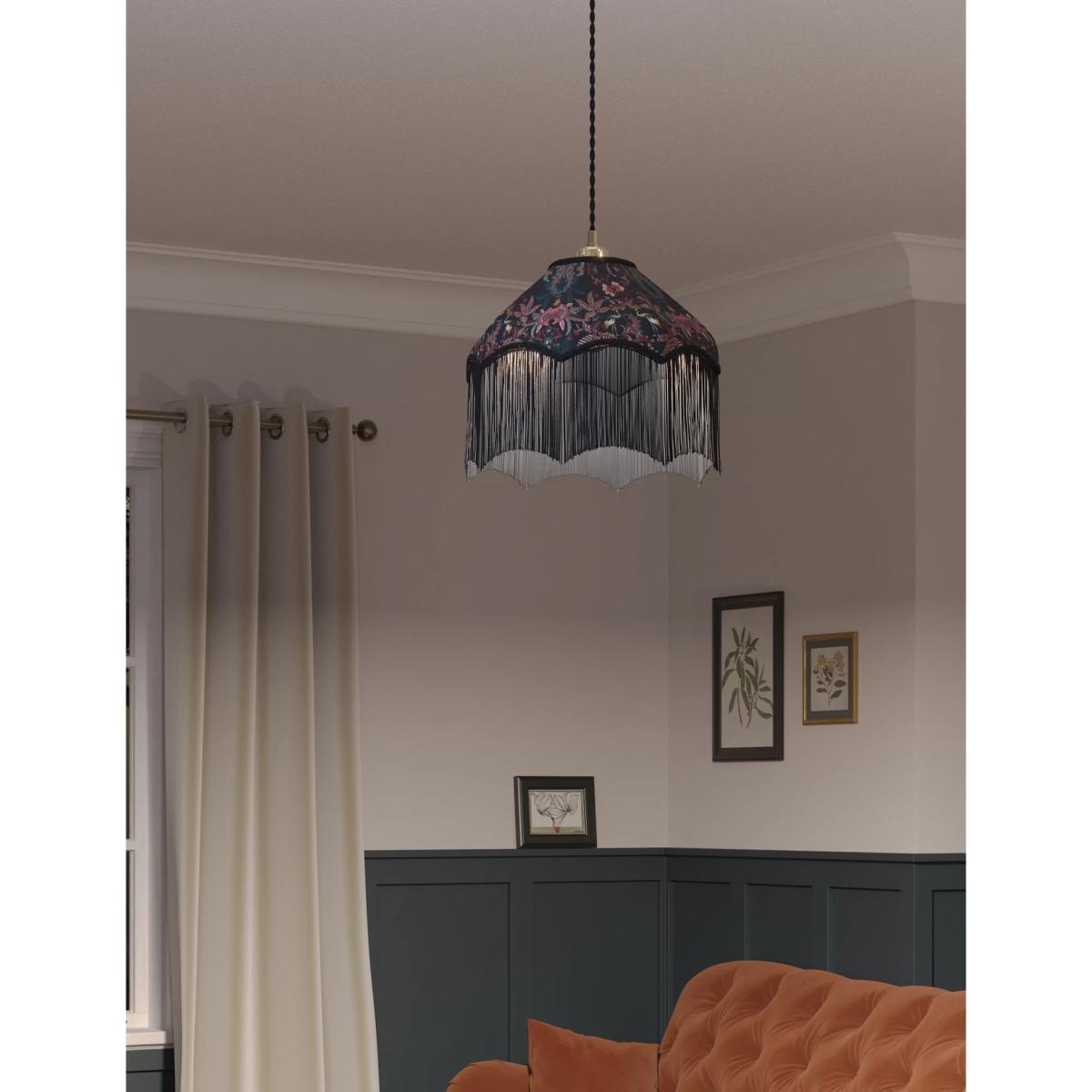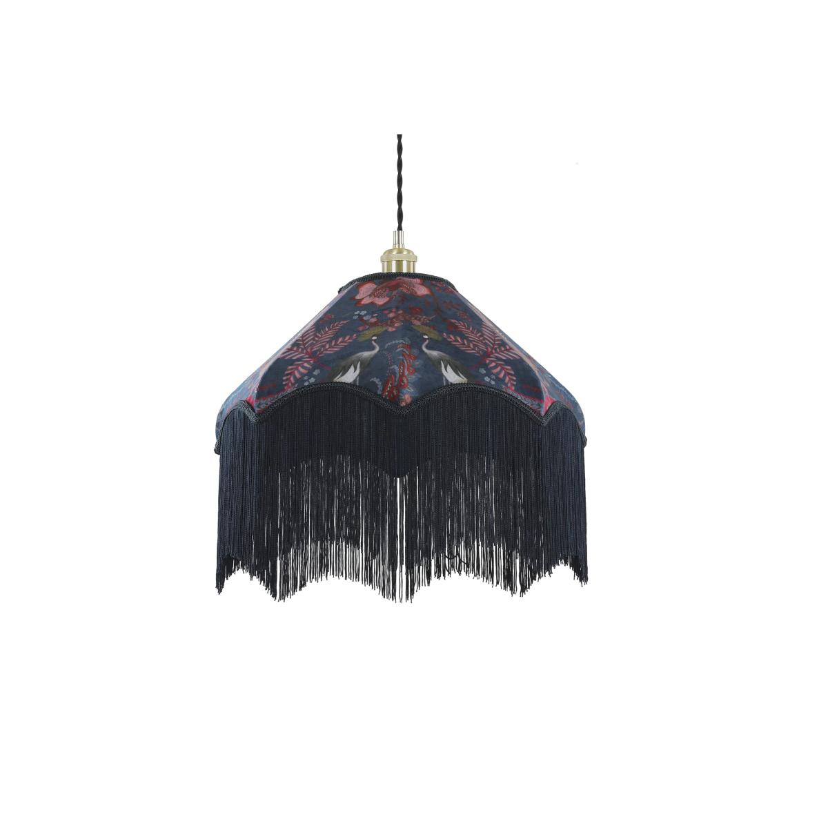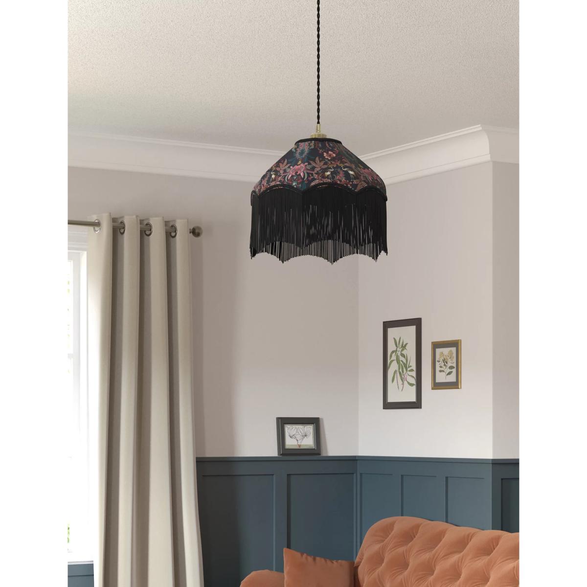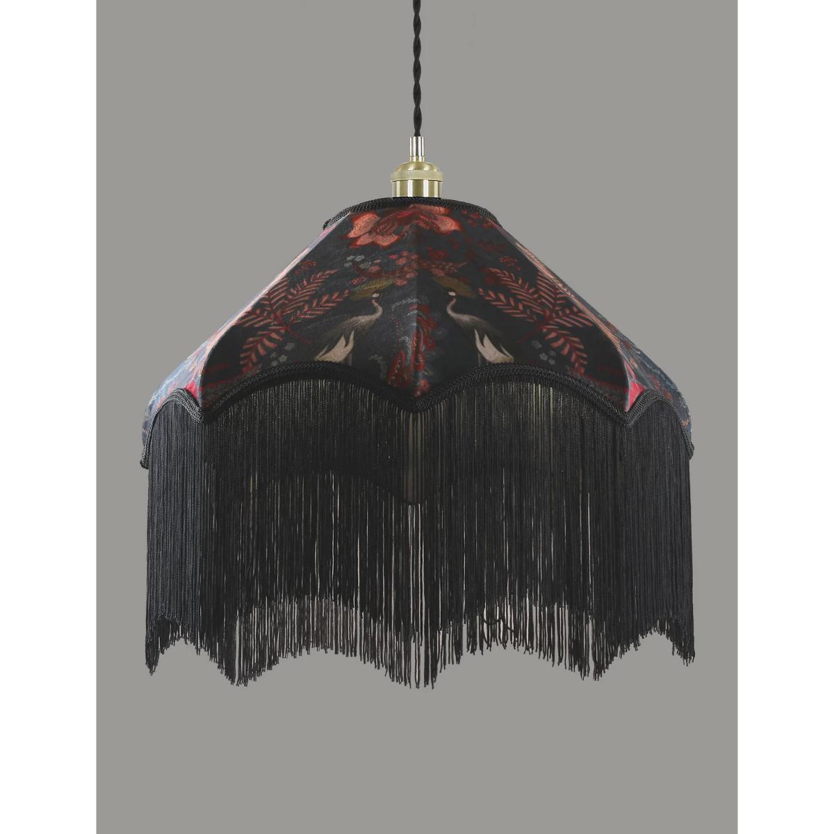 Lean into the maximalist trend with this elegant ceiling lamp shade. It's made to a traditional octagonal shape from plush velvet and features a whimsical print of foliage, florals and birds. Delicate fringing completes the sophisticated design.