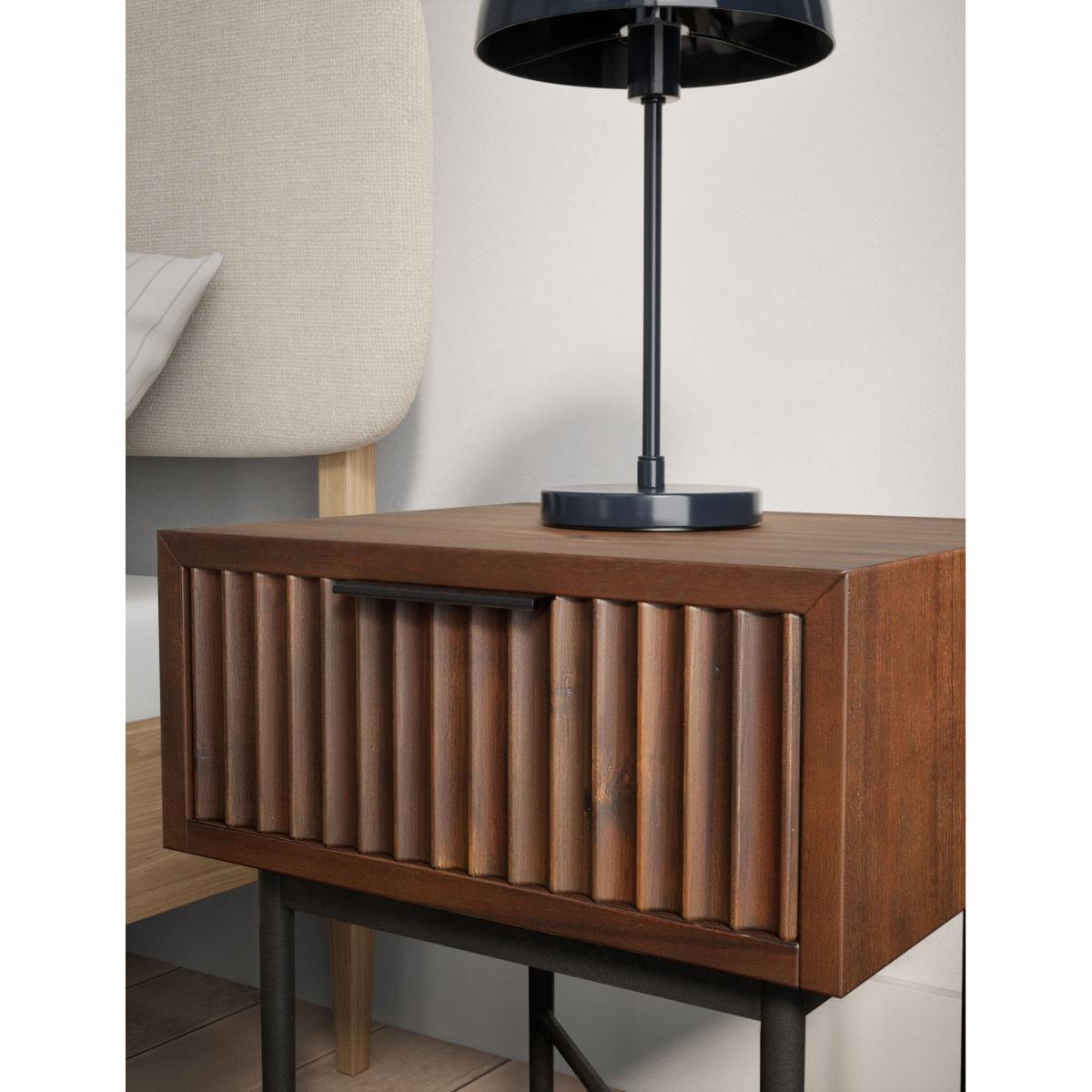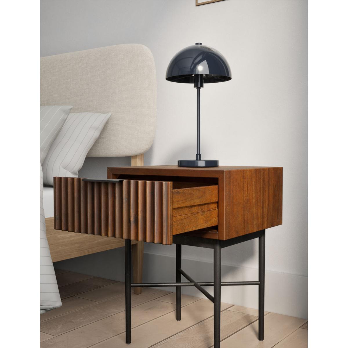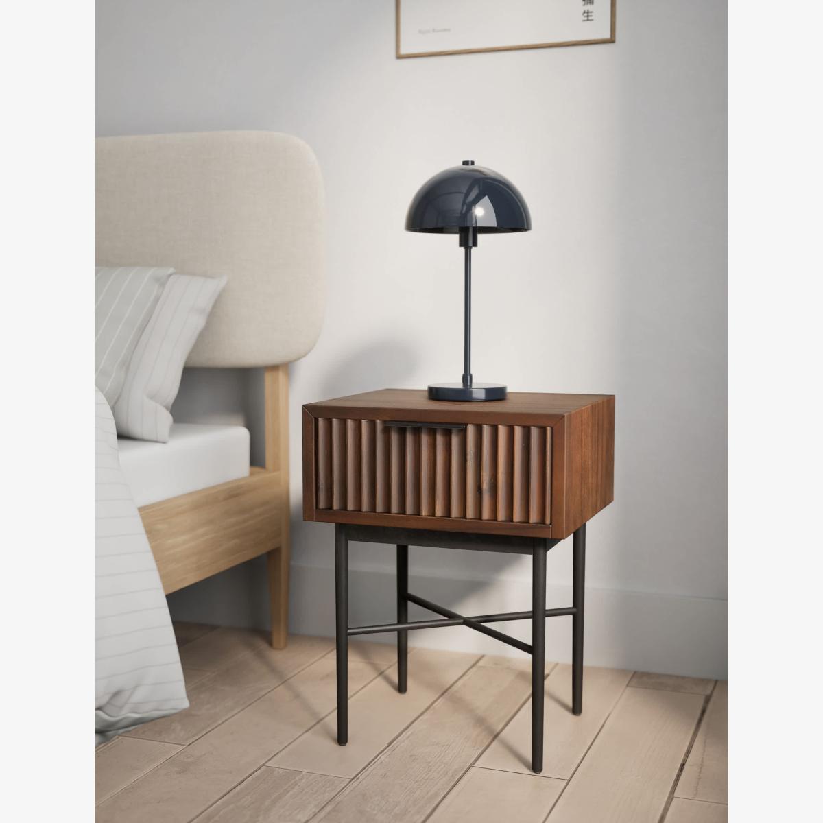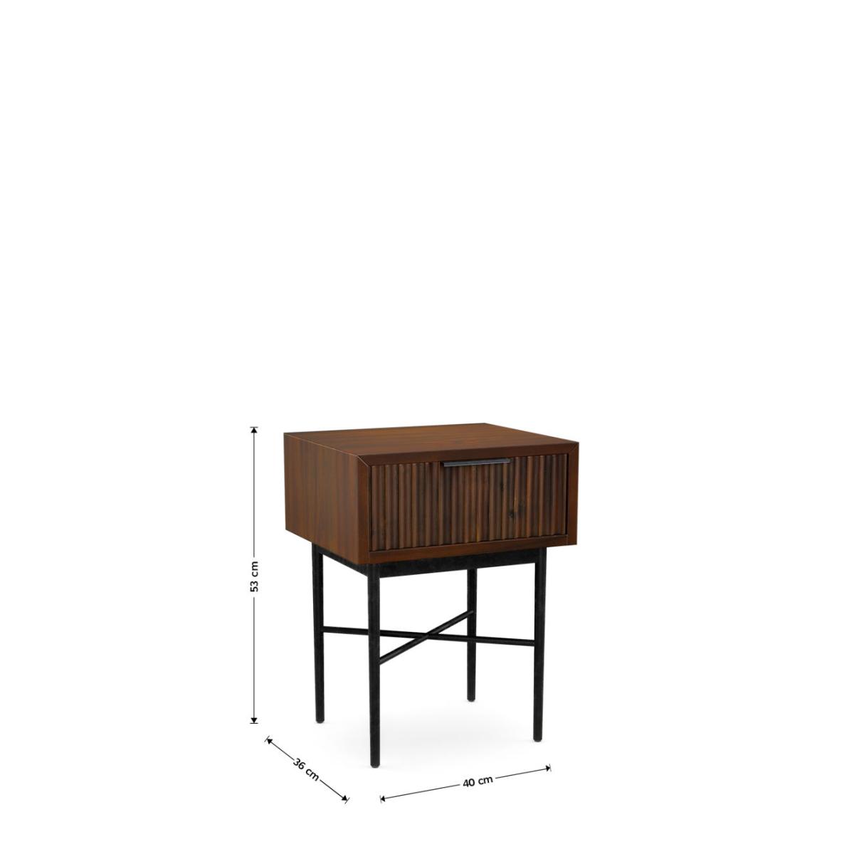 This bedside table delivers timeless style with a sleek, mid-century feel. The acacia veneer body features a smooth-opening drawer with a fluted panel on the front. Slender, polished metal legs coordinate with the metal handle. We’re so confident our furniture is built to last, our industry-leading guarantee covers any manufacturing failure on all furniture. That’s our promise, and why our furniture comes with a 10-year guarantee that you can trust. Excludes: outdoor furniture and any issues that are a result of normal wear and tear, improper care or accidental damage.