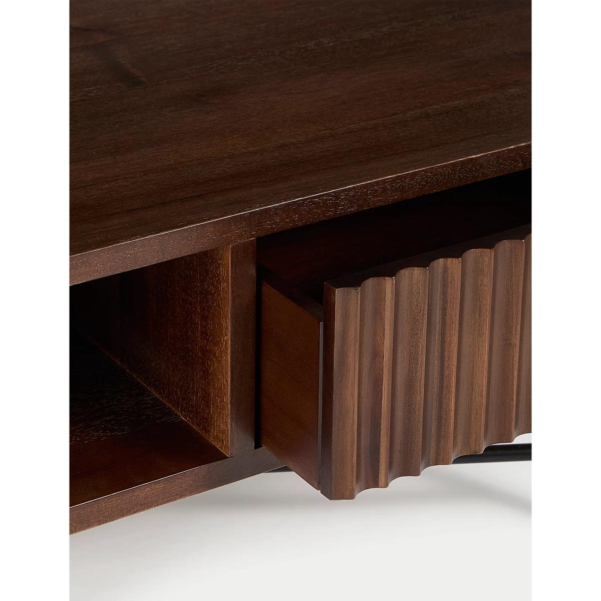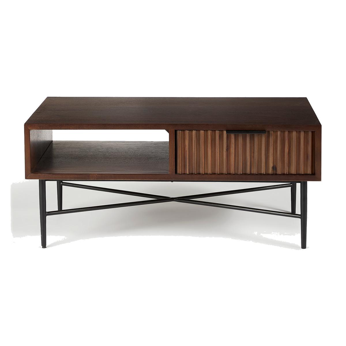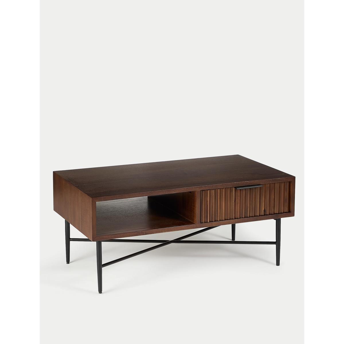 Add a timeless centrepiece to your living space with this Wharf coffee table. The design has a natural wood grain, featuring an acacia veneer on the main body. There's plenty of storage space under the table top including a large drawer with a fluted front. Perfect for hiding away chargers and remotes! Polished metal legs provide a contrasting finish, and the brushed metal handles offer a neat finishing touch. Further items are also available in the Wharf range. We’re so confident our furniture is built to last, our industry-leading guarantee covers any manufacturing failure on all furniture. That’s our promise, and why our furniture comes with a 10-year guarantee that you can trust. Excludes: outdoor furniture and any issues that are a result of normal wear and tear, improper care or accidental damage.