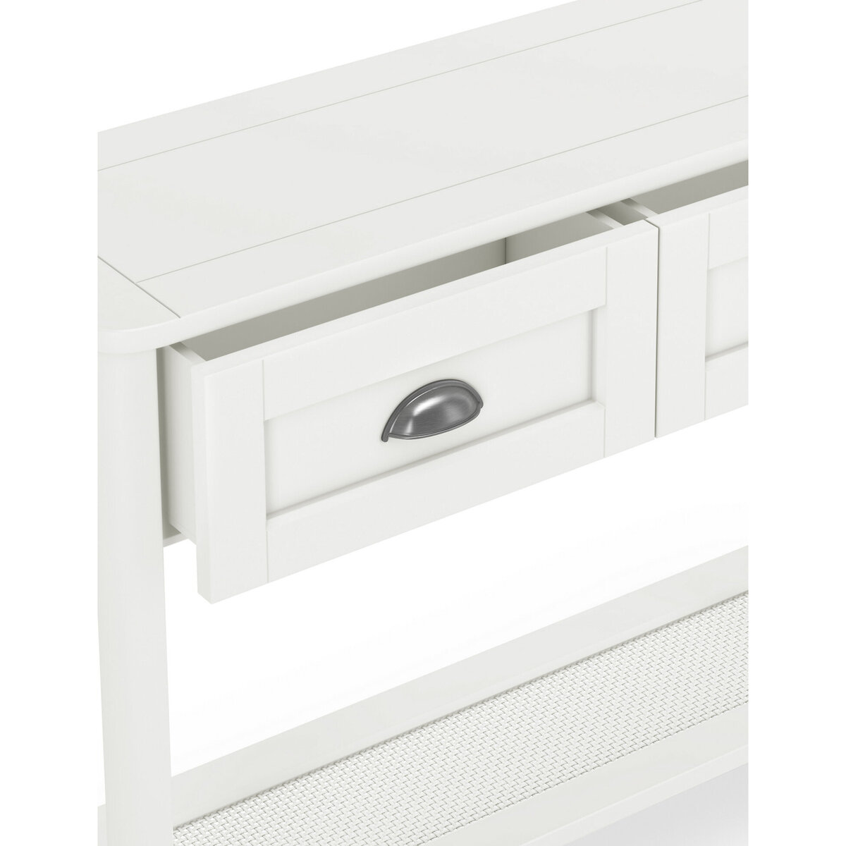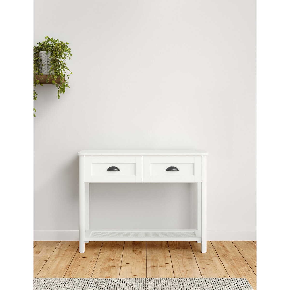 I love this soft white console table for its versatility and timeless appeal. It works well in classic, coastal, and Scandinavian interiors, providing a subtle elegance that doesn’t overpower the space. Practical styling tips include using it as an entryway focal point with a mirror above and a few decorative accessories, or as a storage solution in living rooms or hallways. Its two drawers are perfect for keeping everyday essentials away from view, while the surface offers ample space for lamps, vases, or picture frames. The neutral hue ensures it complements a wide range of colour schemes and furniture styles, making it a staple piece for both functional and decorative purposes.