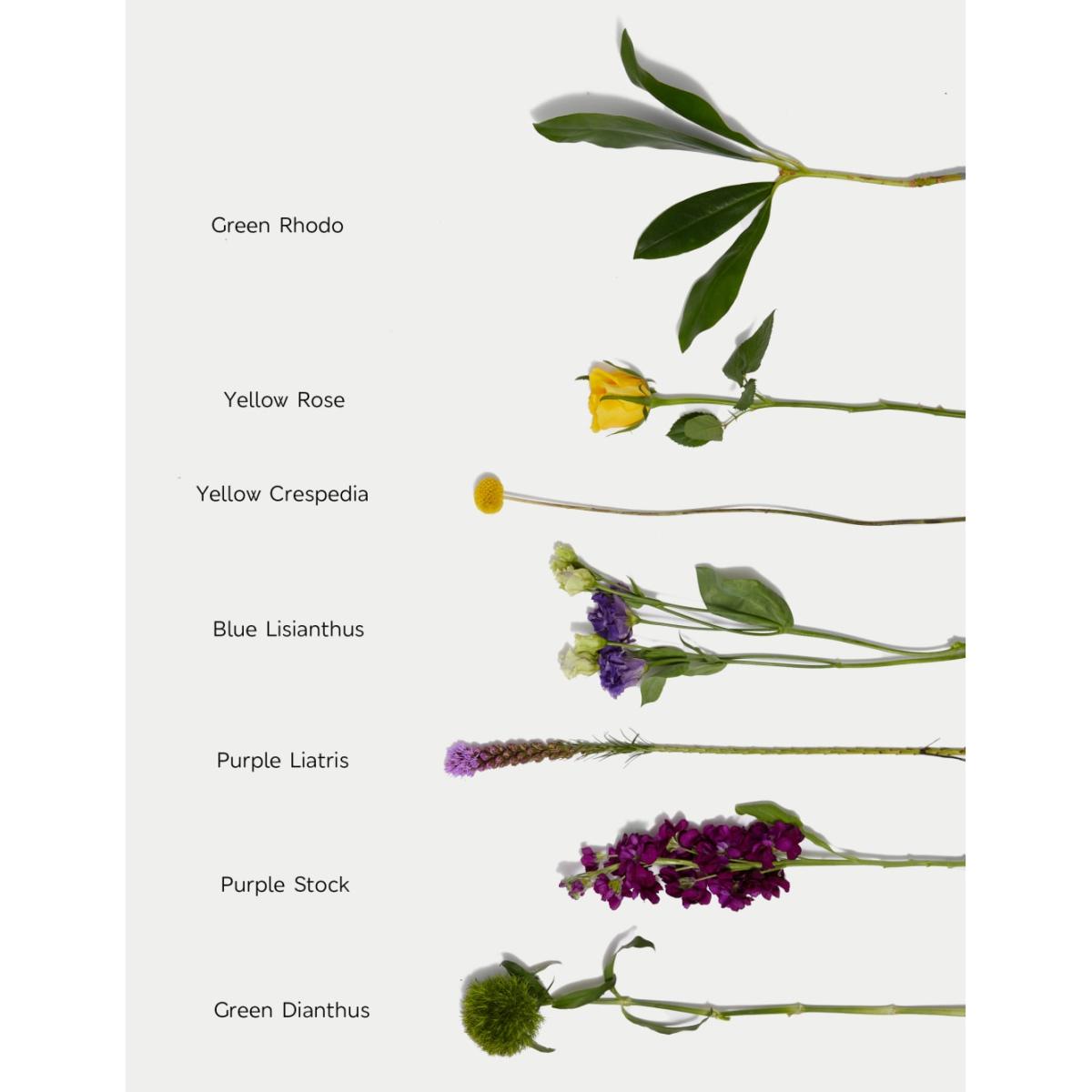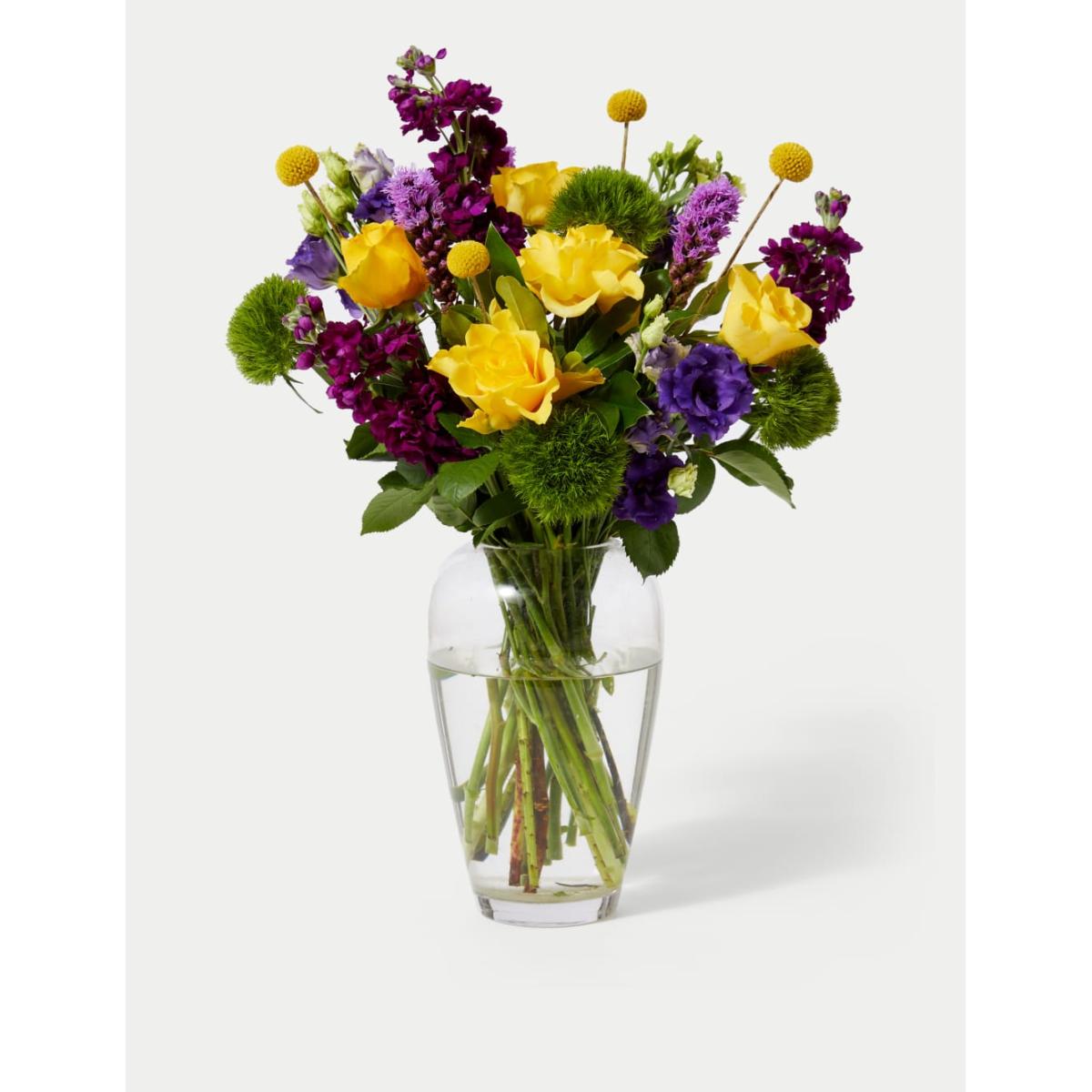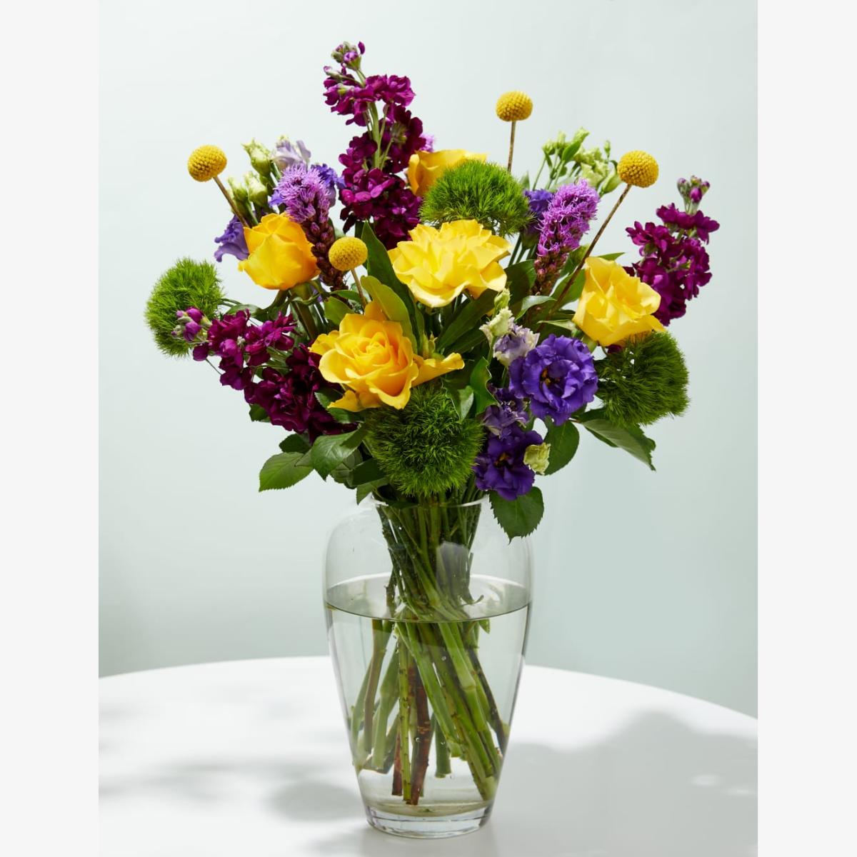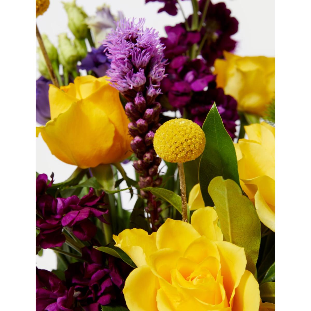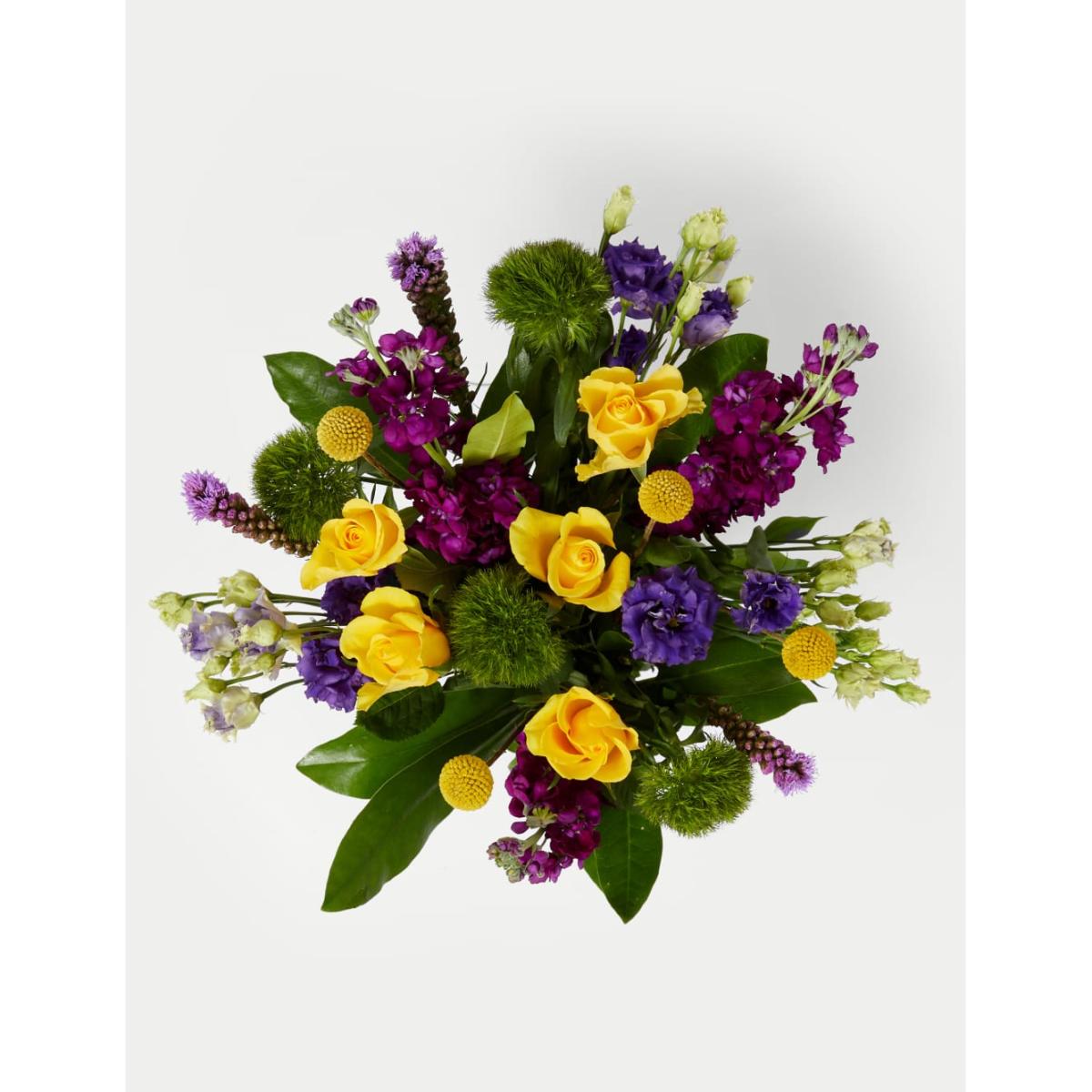 With its playful display of yellow, green and purple blooms, this Wimbledon-inspired bouquet is a delightful pick for tennis fans. The selection of 25 stems showcases Blue Lisianthus, accompanied by a sweet yellow rose, craspedias in similar shades. Extra colour comes from sprays of mauve liatris and purple stocks, while dianthus and Green Rhodo create the greenery.