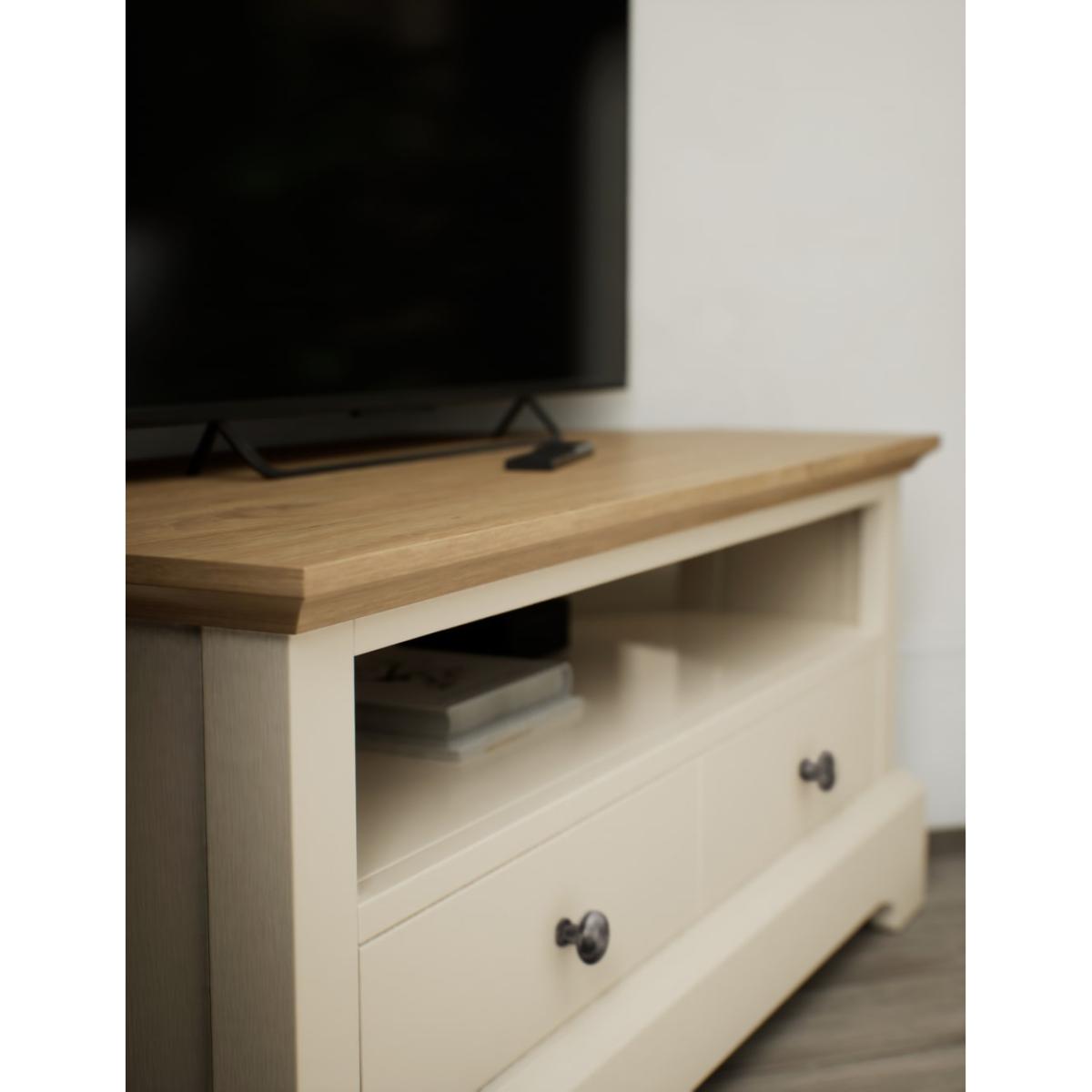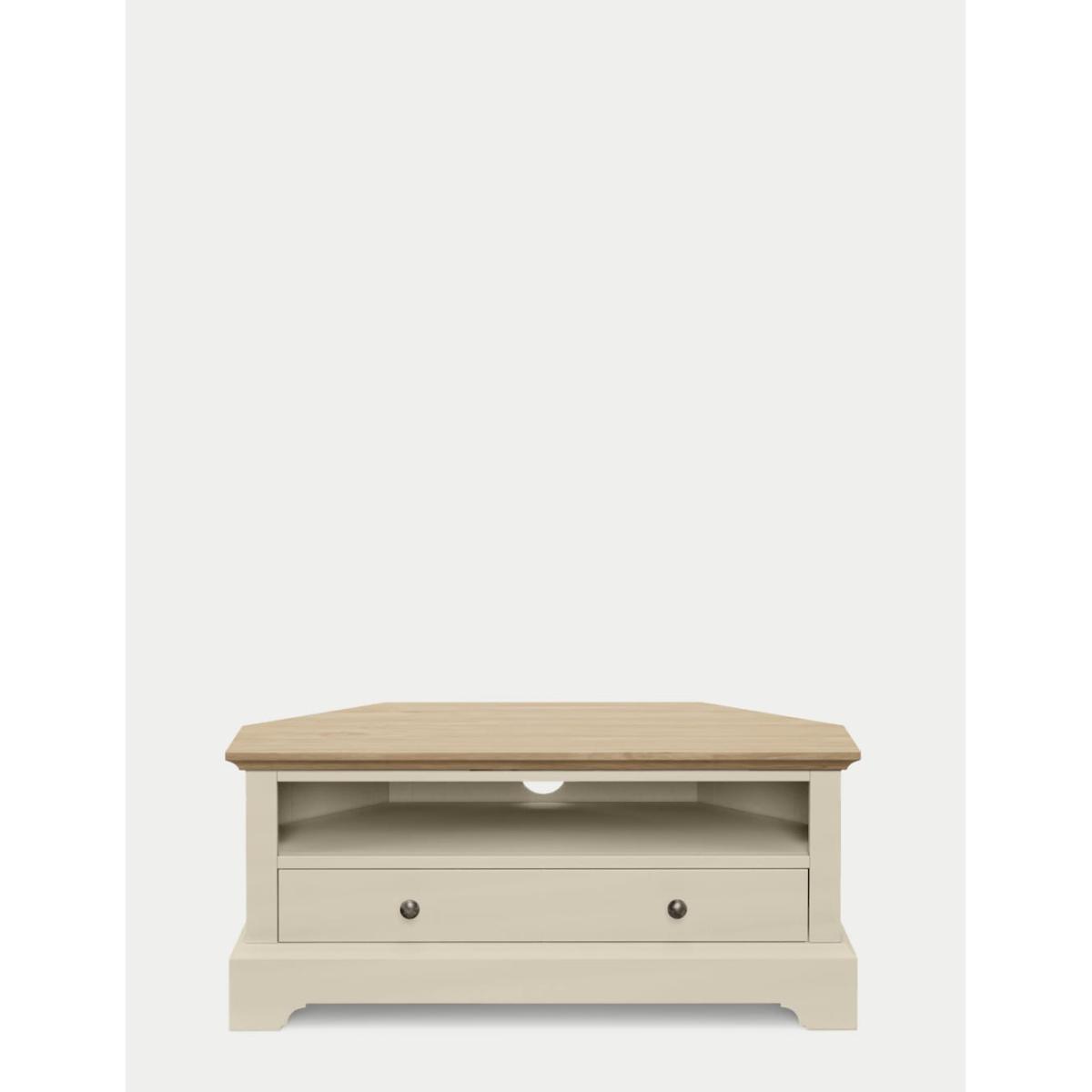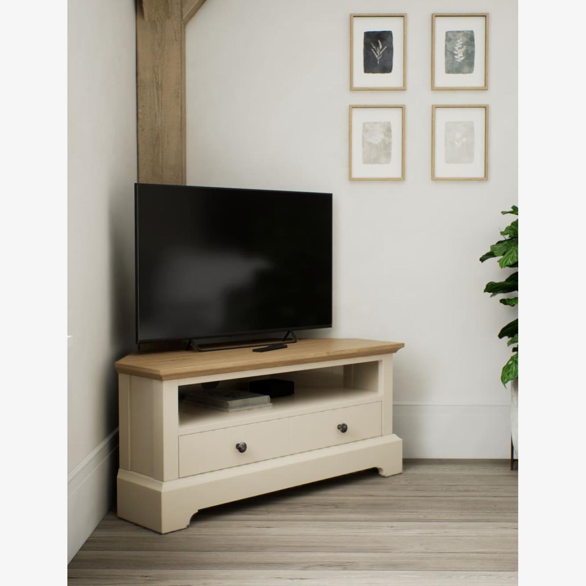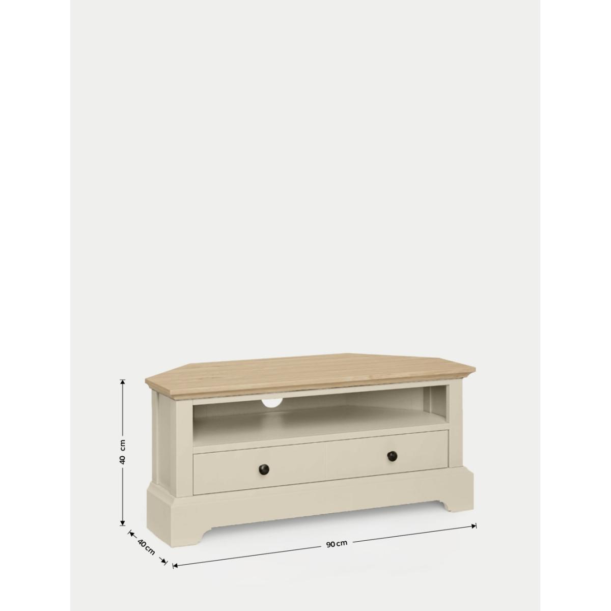 Maximise space with the Winchester corner TV unit. The piece slots neatly into the corner of your room, creating a tidy nook to display your media and keep everything organised. It includes two drawers on wooden runners and an open shelf with a hole at the back that keeps cables neatly together. An oak wood veener top brings natural texture to your decor, and pairs well with the beautiful painted finish of the body. Co-ordinating items in the Winchester range are also available. We’re so confident our furniture is built to last, our industry-leading guarantee covers any manufacturing failure on all furniture. That’s our promise, and why our furniture comes with a 10-year guarantee that you can trust. Excludes: outdoor furniture and any issues that are a result of normal wear and tear, improper care or accidental damage.