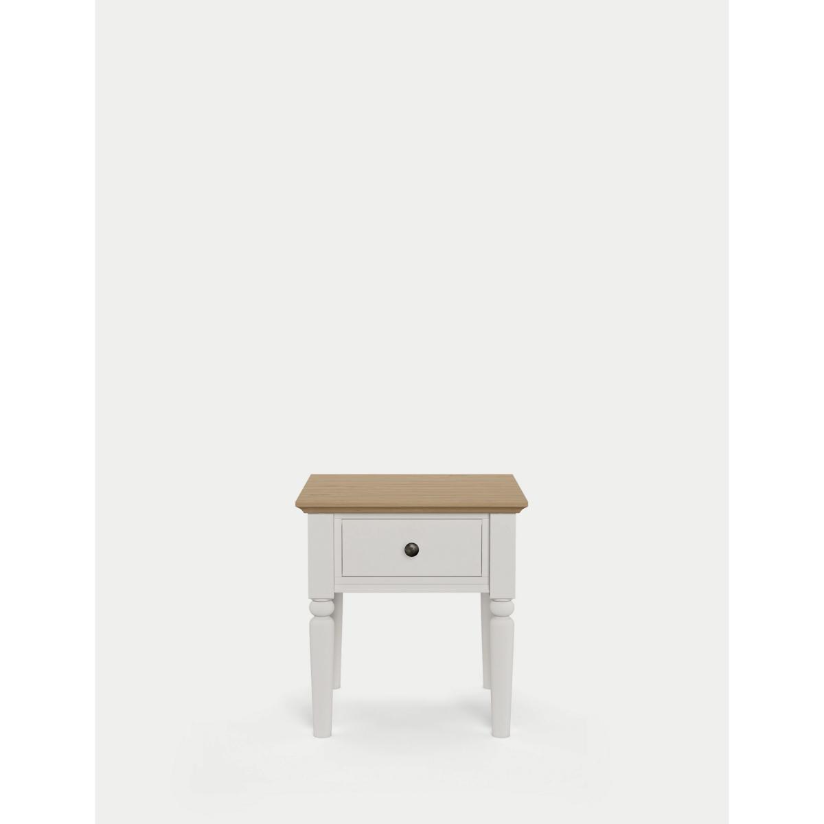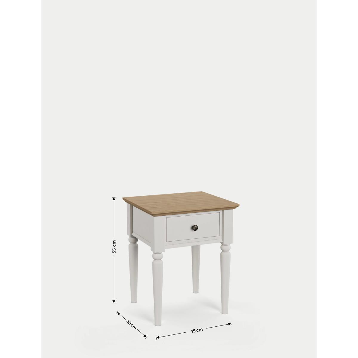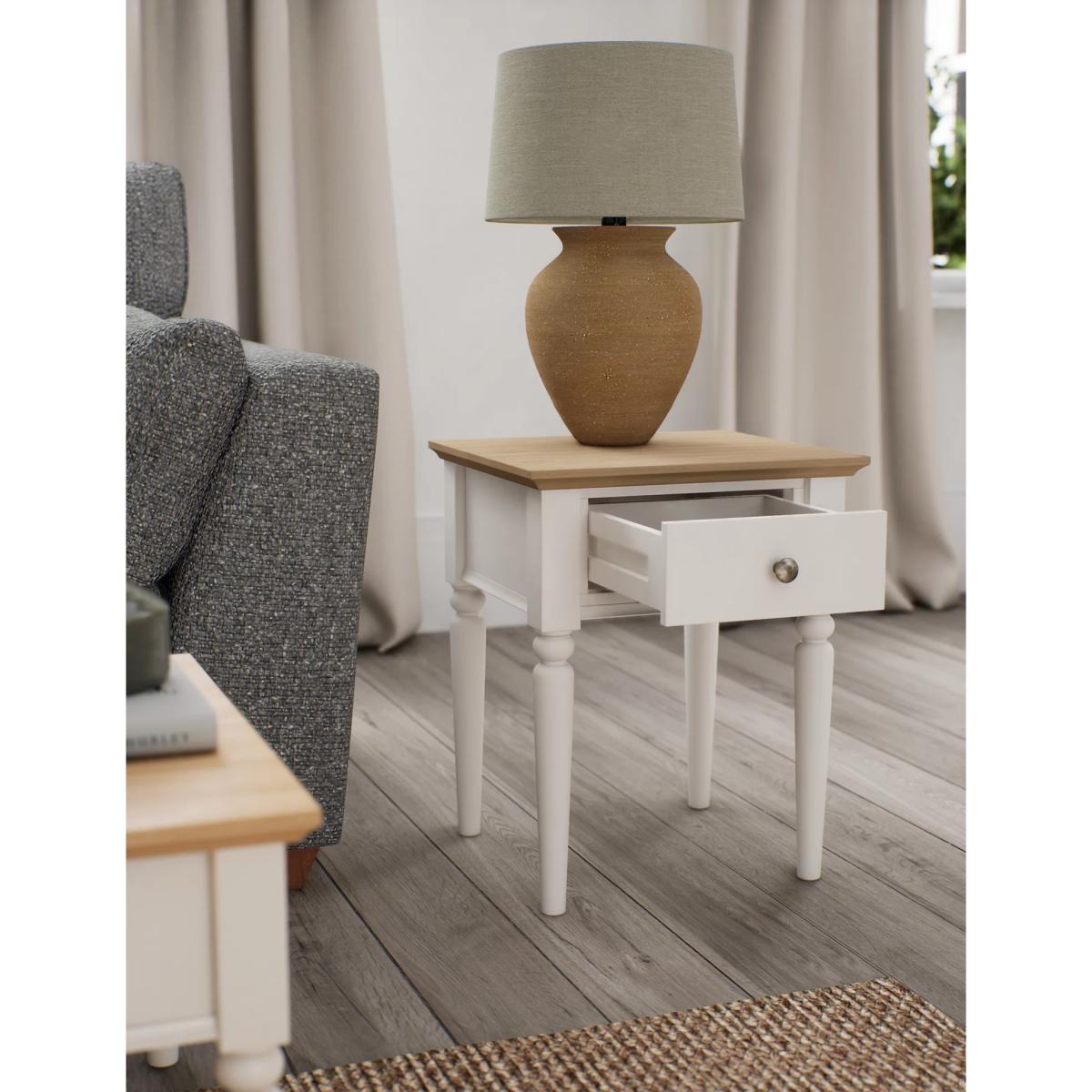 The Winchester side table brings a touch of modern country charm to your space. It has a painted body and a smooth oak wood veneer top that lends natural texture to your living area. Slender turned legs give it that traditional farmhouse look, while a small drawer ensures it's practical too. Matching items in the Winchester range are also available. We’re so confident our furniture is built to last, our industry-leading guarantee covers any manufacturing failure on all furniture. That’s our promise, and why our furniture comes with a 10-year guarantee that you can trust. Excludes: outdoor furniture and any issues that are a result of normal wear and tear, improper care or accidental damage.
