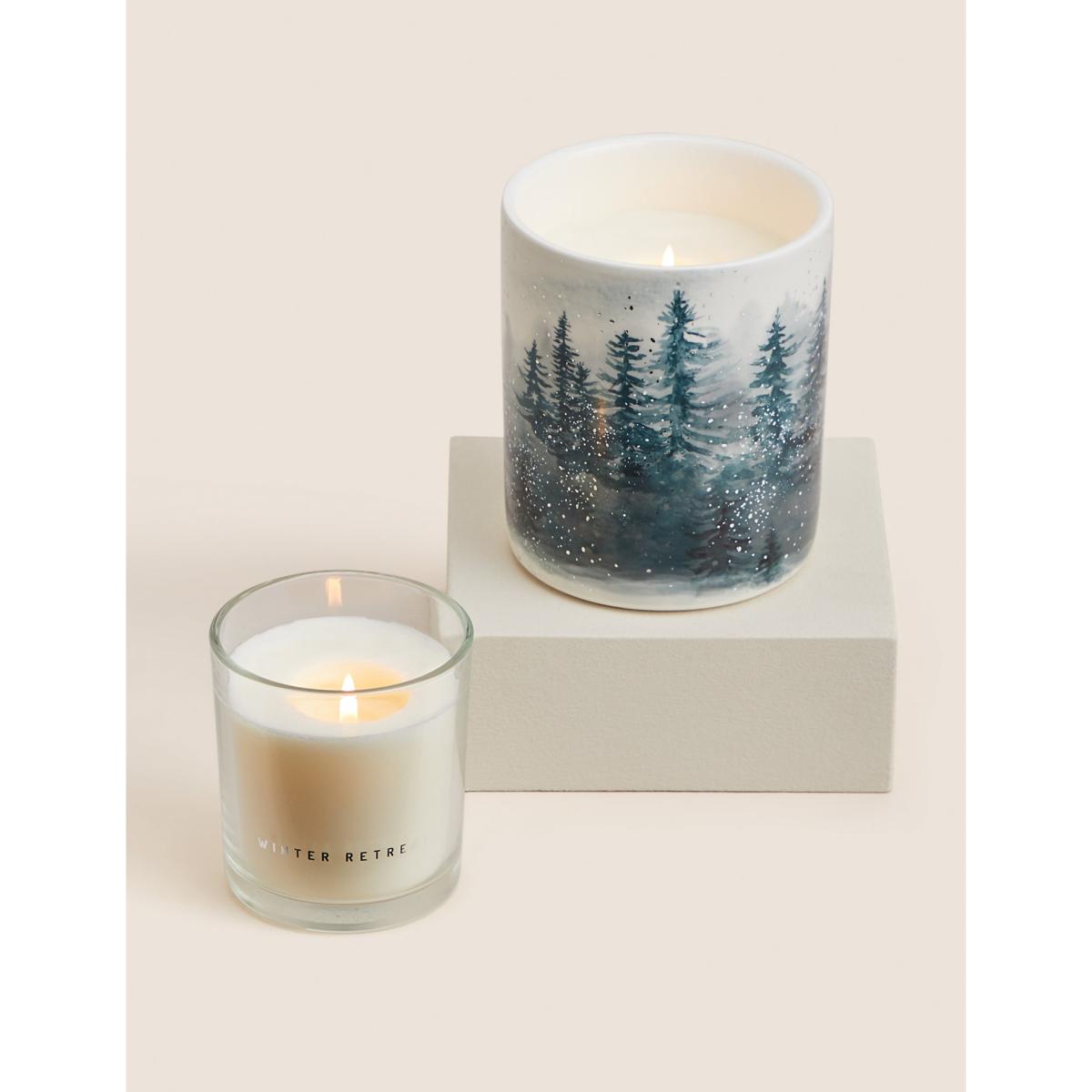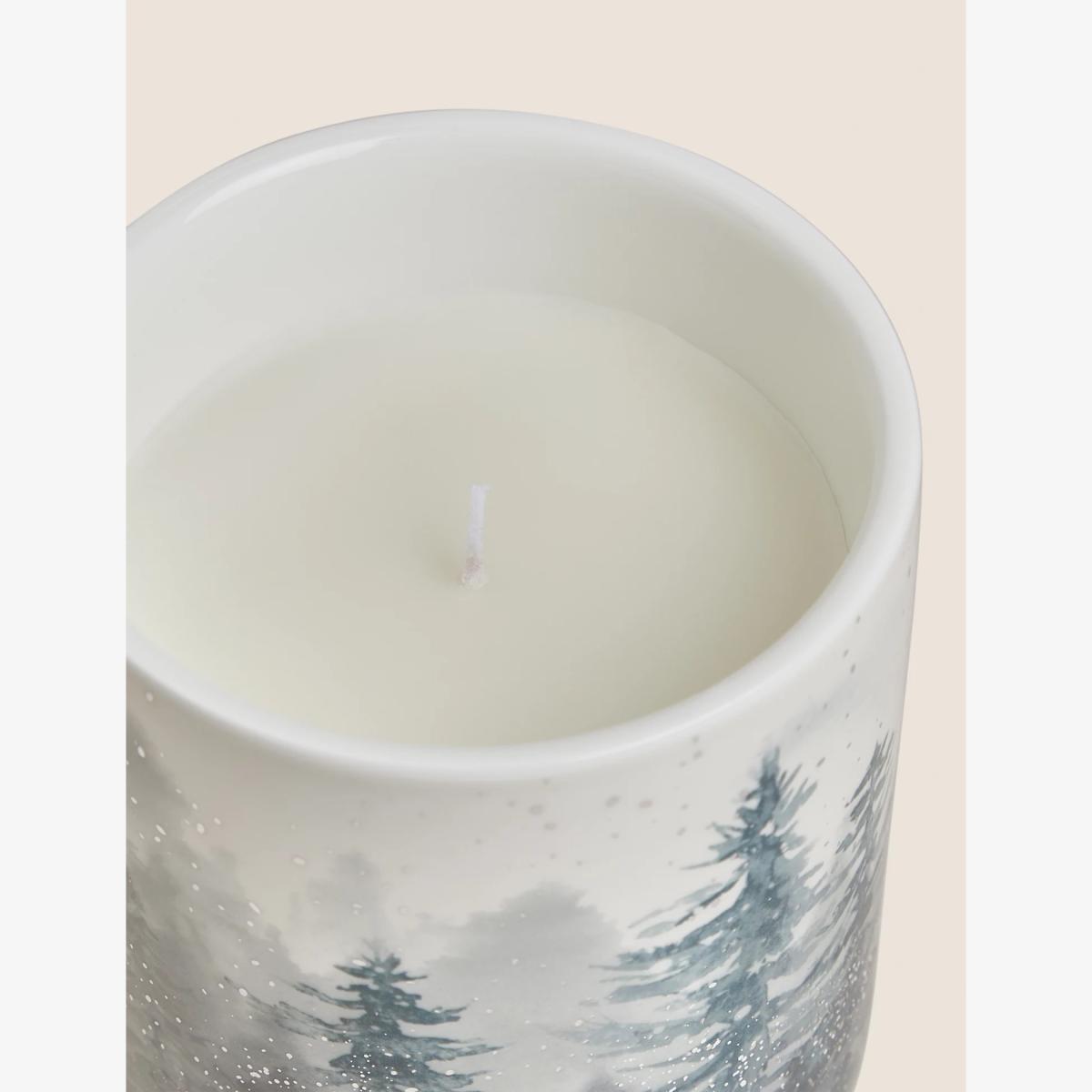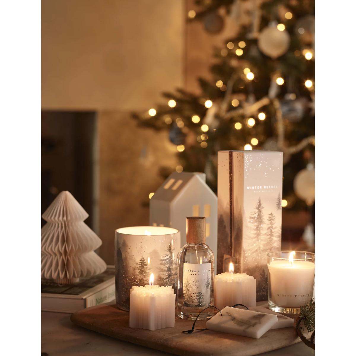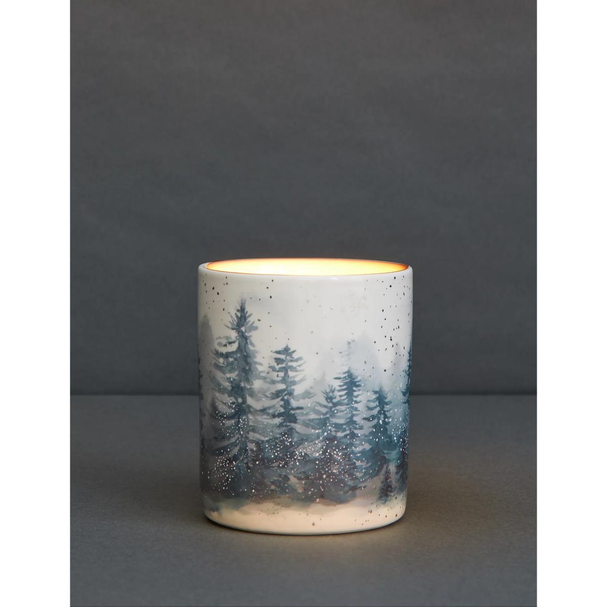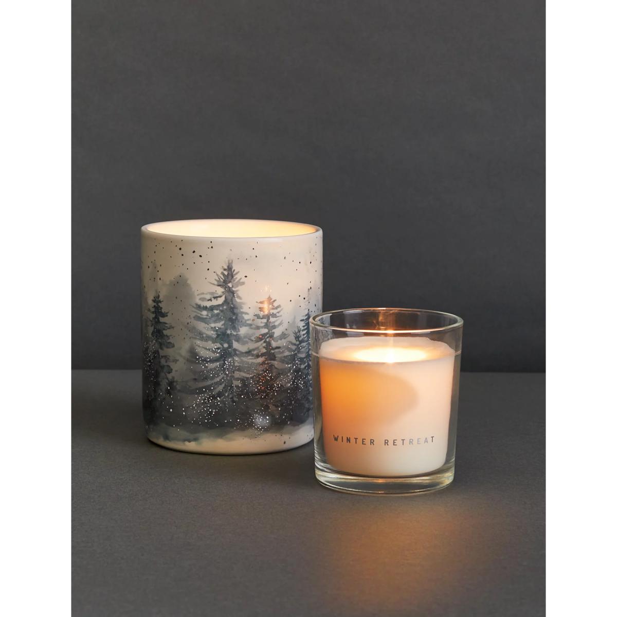This scented candle will fill your space with our calming Winter Retreat fragrance. Fruity top notes blend with heart notes of pine, clove and cedar, rounded out with warm leather, vanilla and musk. The ceramic jar is embellished with an atmospheric design of trees in snow. This fragrance is part of the Amber family of fragrances. Amber scents are rich and warming and may contain notes such as vanilla, pepper, tonka bean and amber.