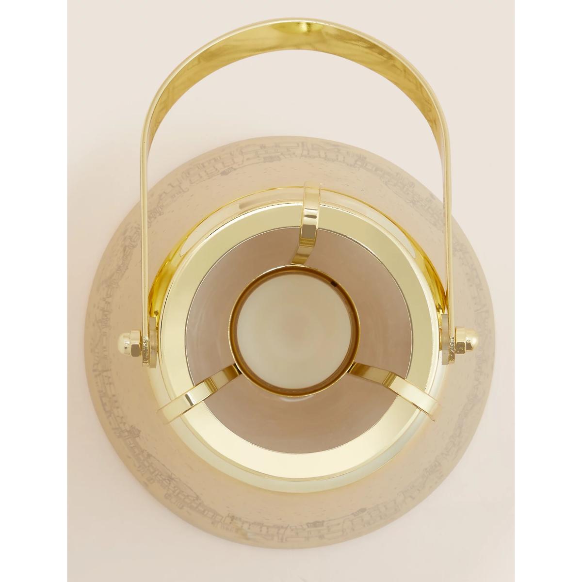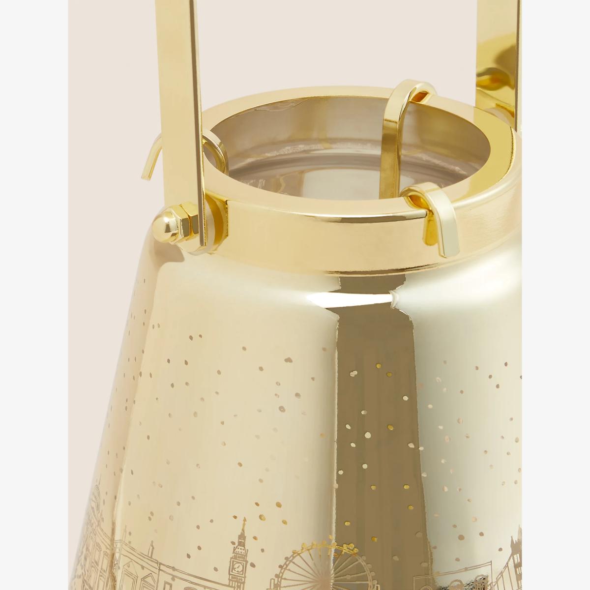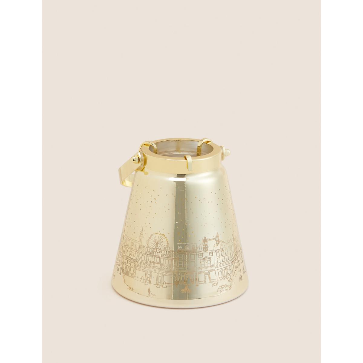 With its metallic finish and unique town scene, this glass lantern makes a lovely ornament for shelves and coffee tables. It's crafted with a metal handle and made to a medium size.