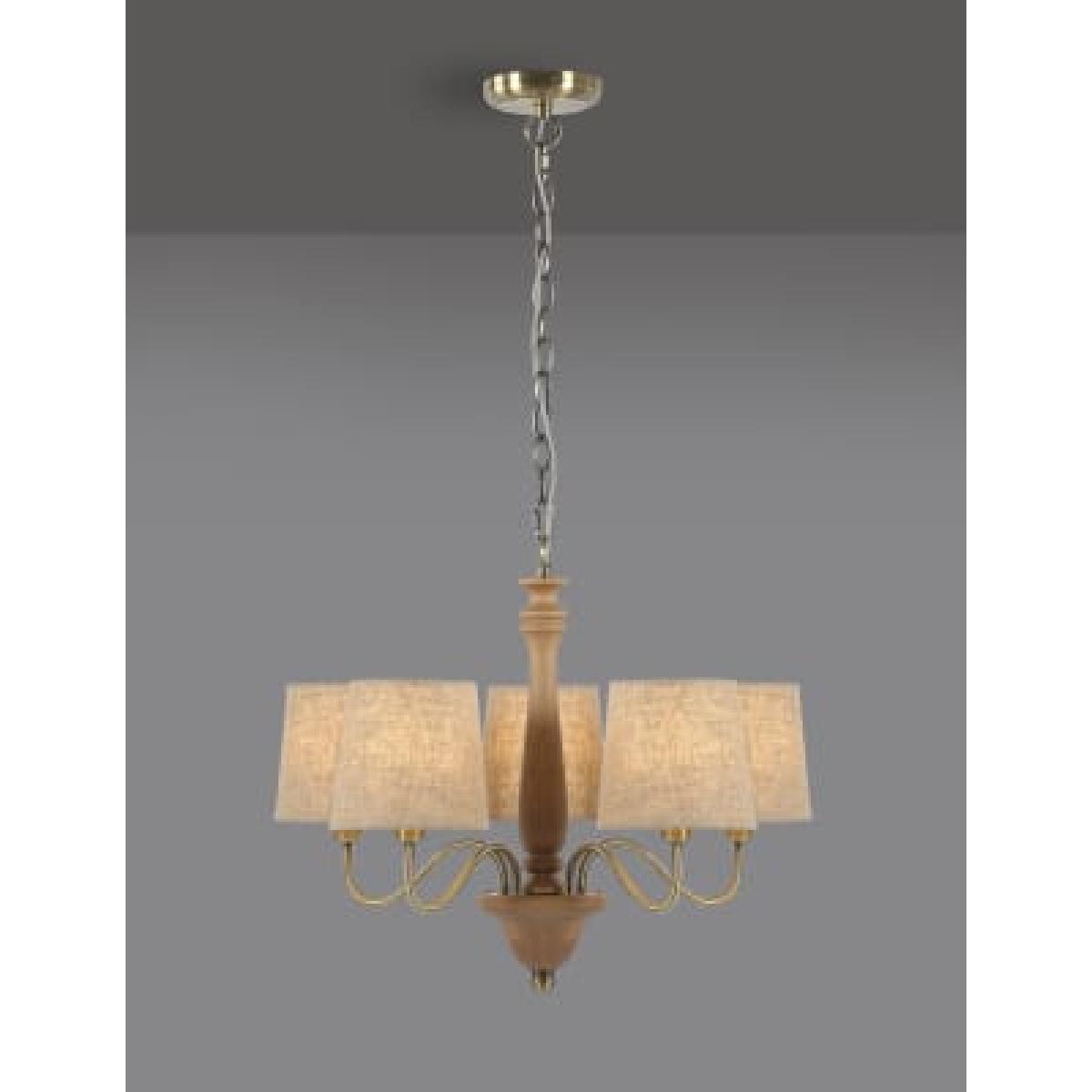 This five-light chandelier is made with turned wood arms and antique brass metalwork for a warm, country look. It's finished with textured linen shades that cast a welcoming glow. A matching floor and table lamp are also available.
