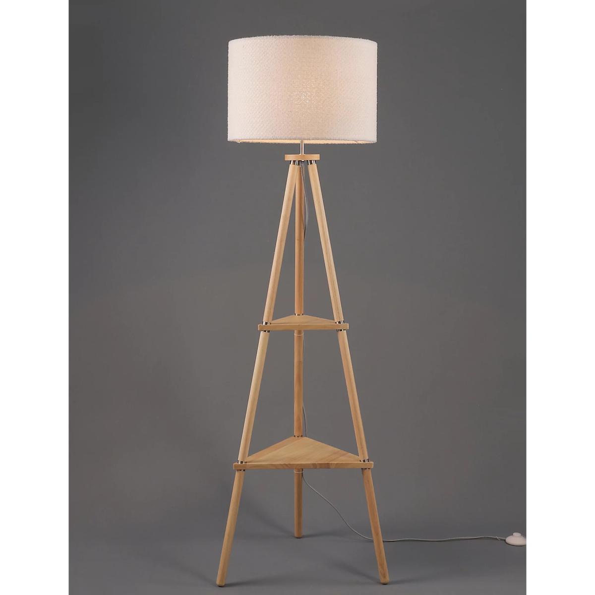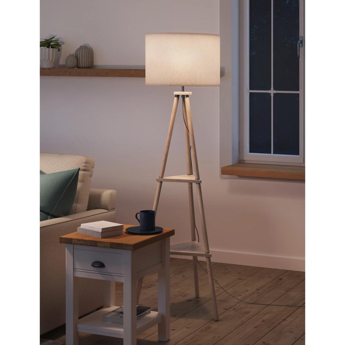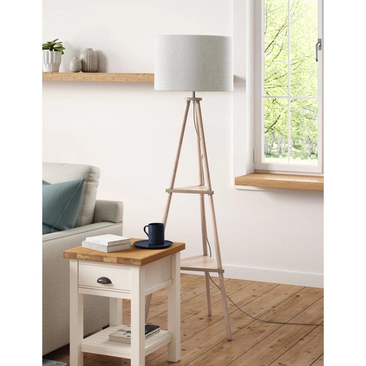 This minimalistic tripod floor lamp will add a Scandi-inspired touch to any interior. The light natural wood framework incorporates two practical triangular shelves. A cream boucle fabric shade and smart shiny metal fitting complete the piece.