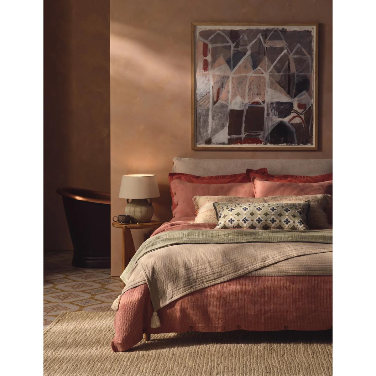 I love this cushion for its rich cotton-rich fabric and vibrant Jaipur Bandhani pattern, which adds a touch of artisanal craftsmanship to any space. It works particularly well in boho or eclectic interiors, where its handmade feel can be showcased alongside textured throws and other patterned textiles. Practical styling tips include pairing it with neutral-toned sofas or armchairs to let the colour pop, or combining it with contrasting textures like linen or velvet for added depth. Its Weald Green hue makes it versatile for both contemporary and traditional settings, making it an easy way to introduce colour and pattern without overwhelming the space.