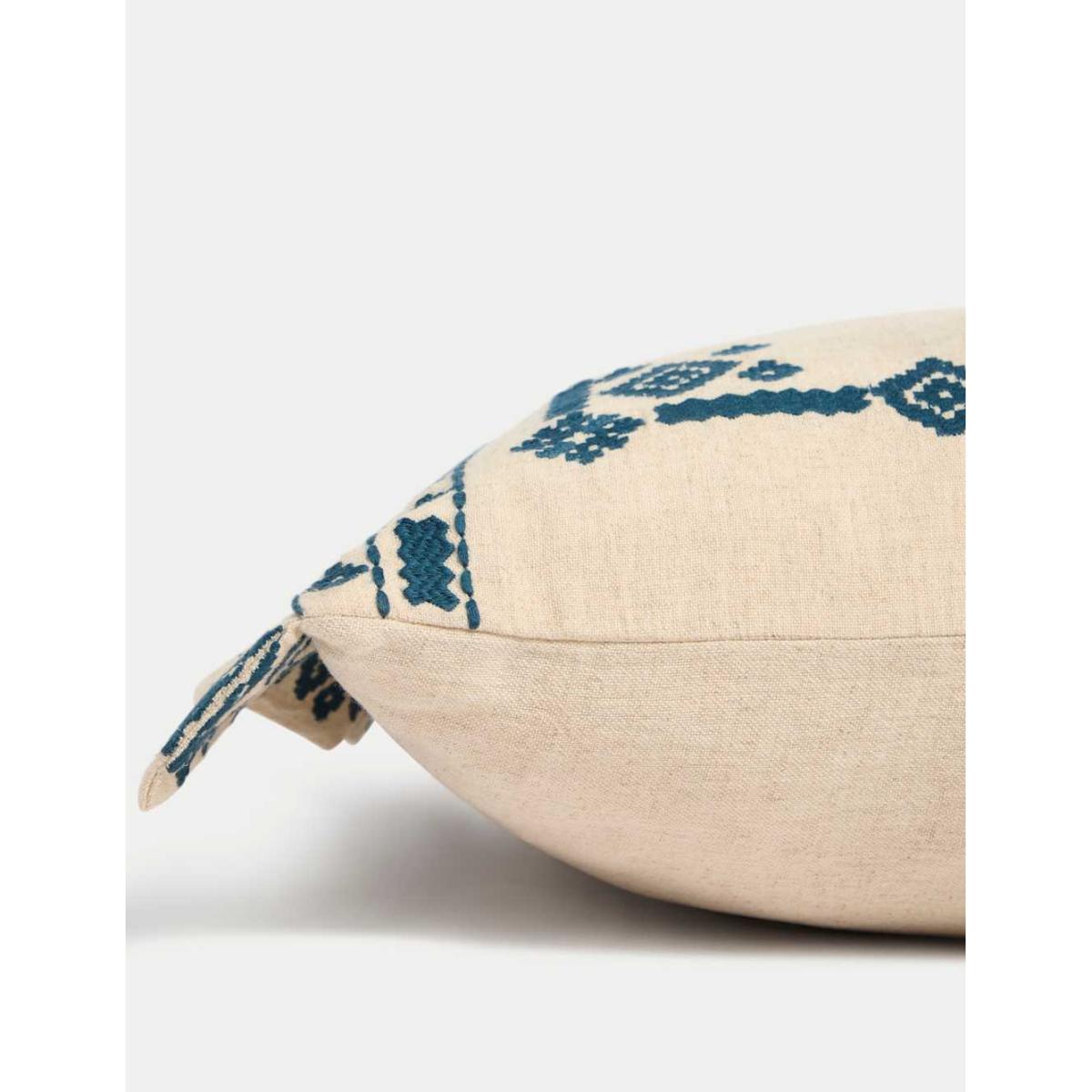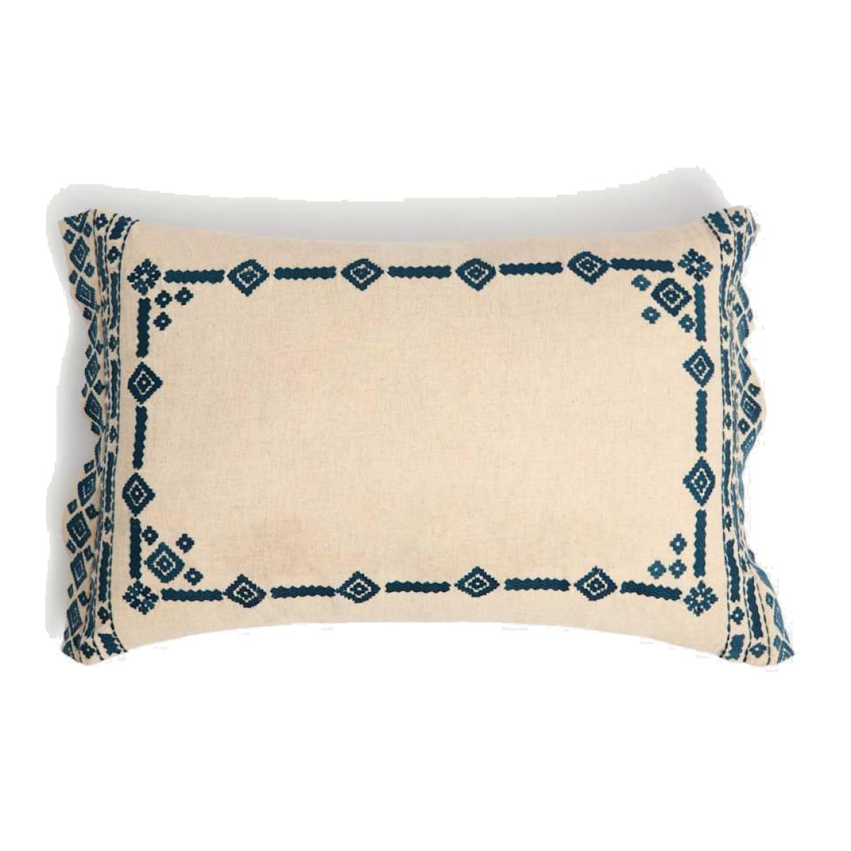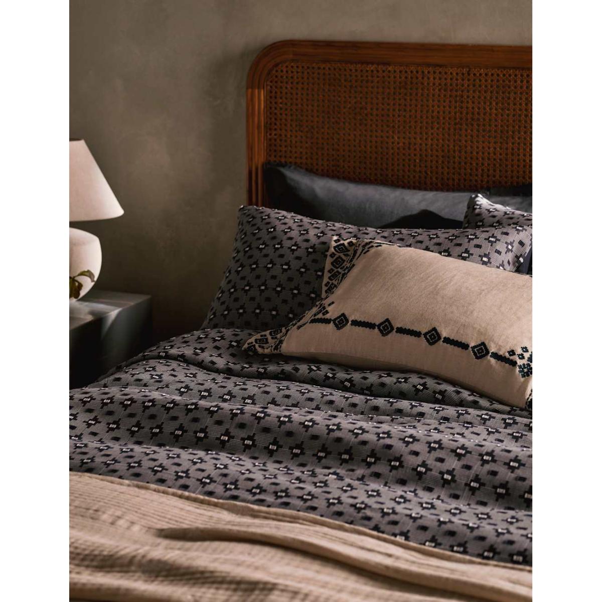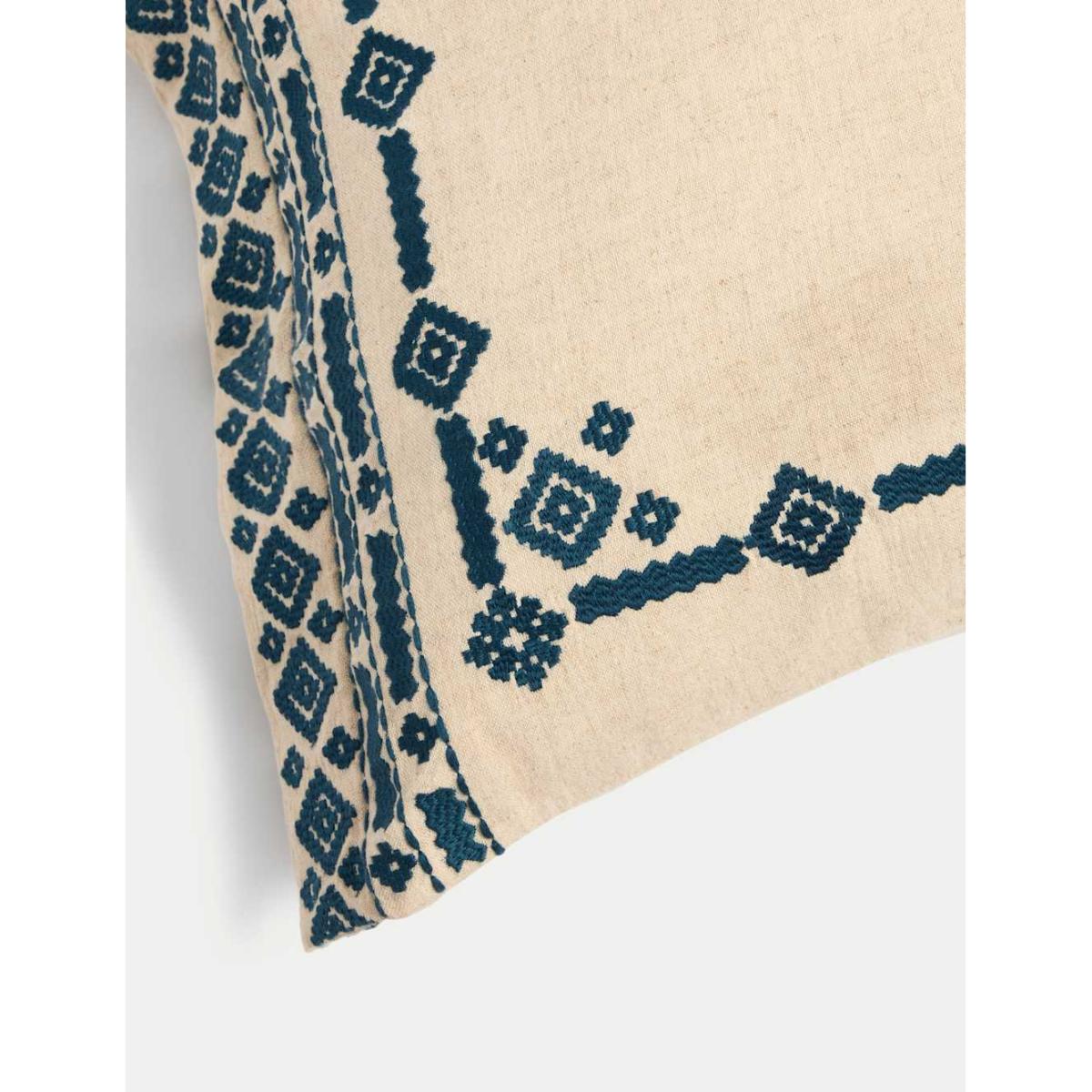 The Kimyou cushion from our M&S X Fired Earth collaboration celebrates natural fibres, blending cotton and linen for a beautiful deel. This large bolster features a geometric embroidered border, adding a distinct bohemian touch. It's made with a feather filling for a yielding, sink-in effect.