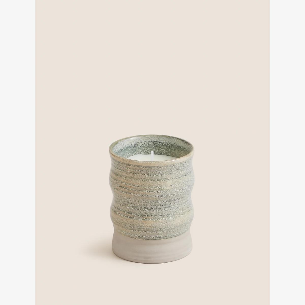 Part of the M&S X Fired Earth collaboration, the Malm scented candle is a calming piece that'll fill your space with wonderful earthy scents. The wax is infused with fresh citrus and green herbs, including fragrant bergamot and eucalyptus. Sandalwood and warm tonka make the ground base notes. This candle is housed in a beautiful curved jar with a reactive natural green glaze which gives each piece a unique look. It offers 50 hours of burn time. This fragrance is part of the Fresh family of fragrances. Fresh scents are bright and clean with underlying woody tones and may include notes such as neroli, bergamot, grapefruit, and mandarin.