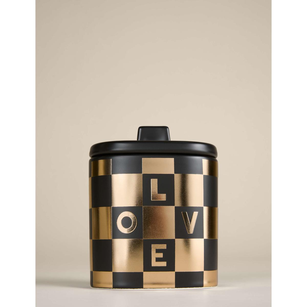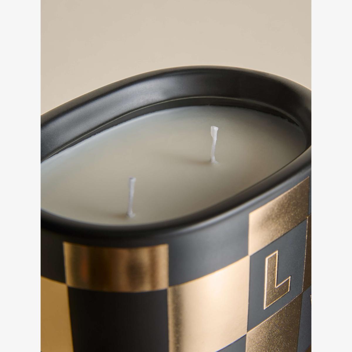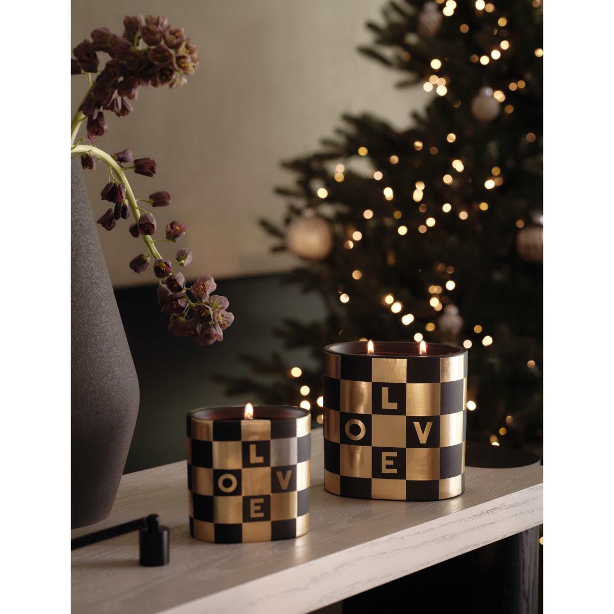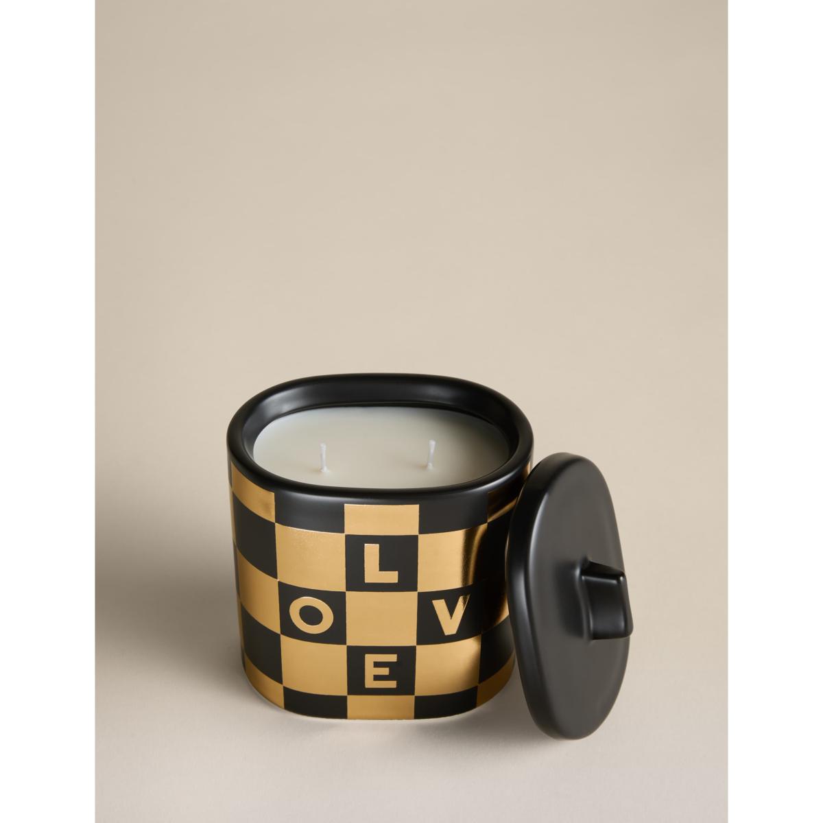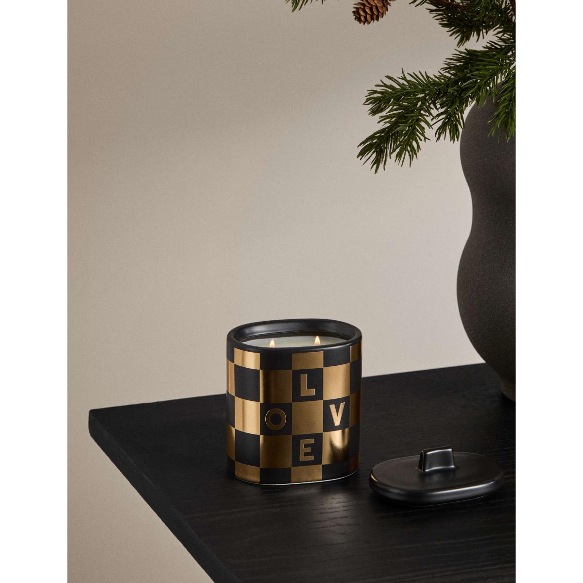 Create a festive atmosphere with this scented candle from M&S X Kelly Hoppen. Seasonal top notes of mandarin, clove and cinnamon are laid over a heart of pine needles and maple, with a base of fir, cedar and sandalwood. This two-wick piece comes in a ceramic vessel decorated with a striking checkerboard pattern, embellished with the word 'Love'. This fragrance is part of the Amber family of fragrances. Amber scents are rich and warming and may contain notes such as vanilla, pepper, tonka bean and amber.