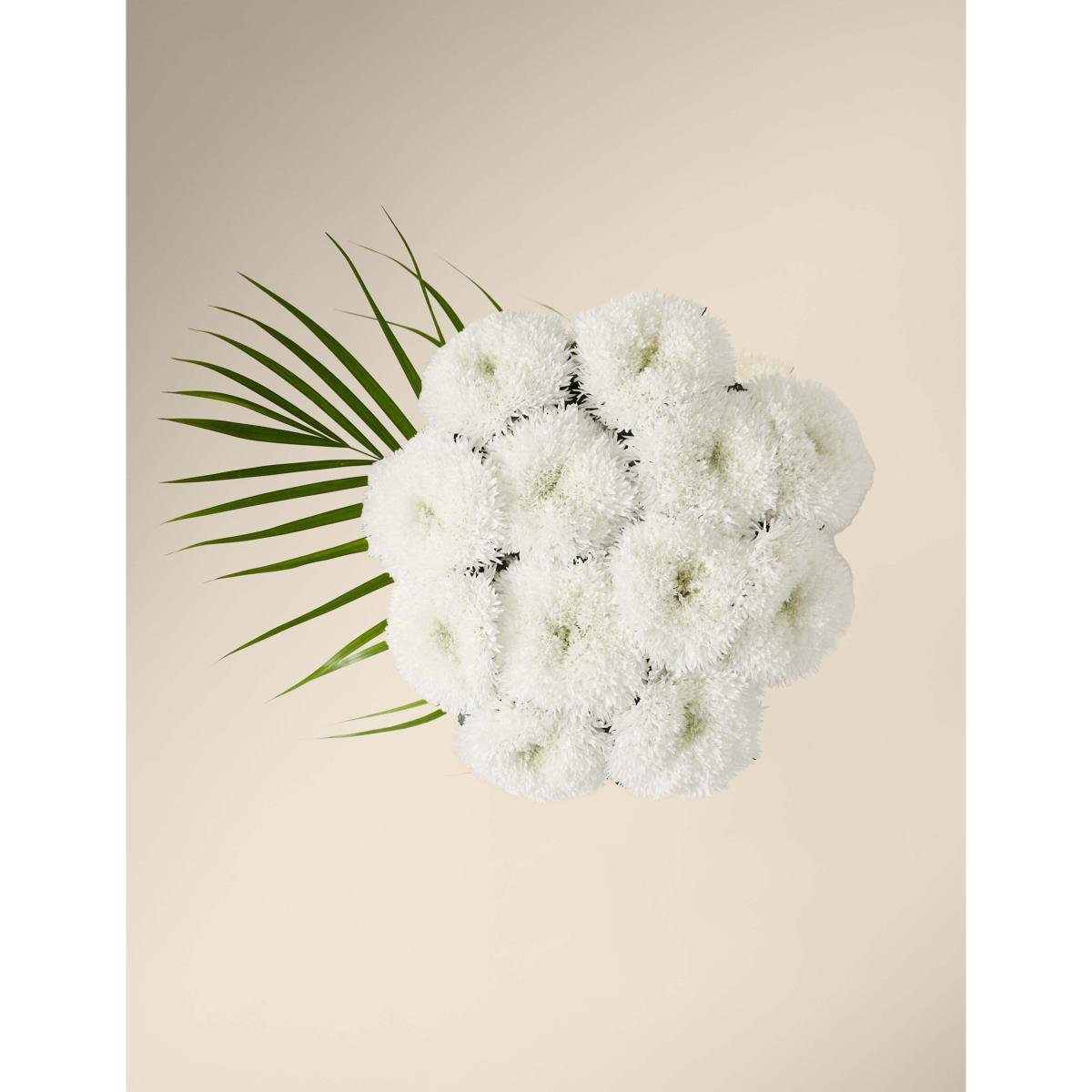 Effortlessly chic and ready to gift, this elegant arrangement includes 13 fresh stems. Featuring pristine white Chrysanthemums thoughtfully paired with lush Kentia Palm foliage it is presented in a stylish vase selected by Kelly Hoppen. The crisp white blooms create a clean, contemporary look, while the graceful palm leaves add height and a soft tropical edge.
