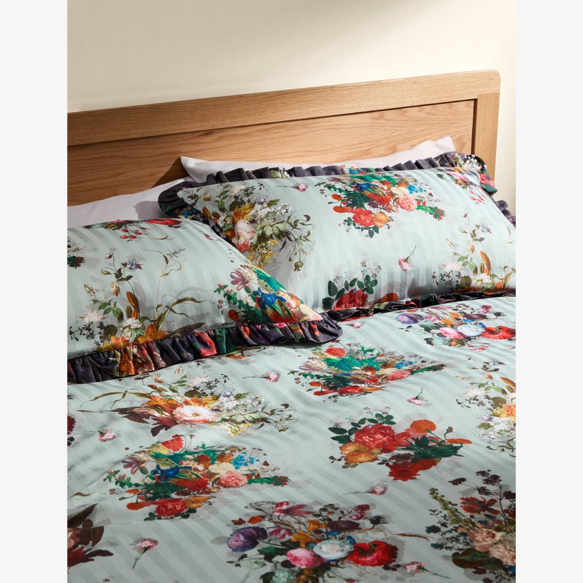 I love the way this bed set combines classic floral print with the crisp feel of pure cotton, making it both effortlessly stylish and practical. The ruffle edge detail adds a touch of charm without overwhelming, perfect for softening a more modern or traditional bedroom. Its versatile duck egg shade allows it to work well in a variety of interiors, from coastal schemes to vintage-inspired spaces. For styling tips, pair it with neutral or pastel pillows and a textured throw for a cosy layer, or keep it simple with crisp white linen for a fresh, understated look. Its floral design also lends itself well to layered bedding, helping create an inviting, restful bedroom.