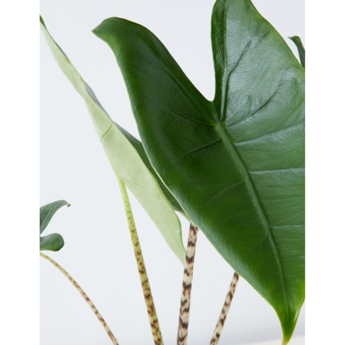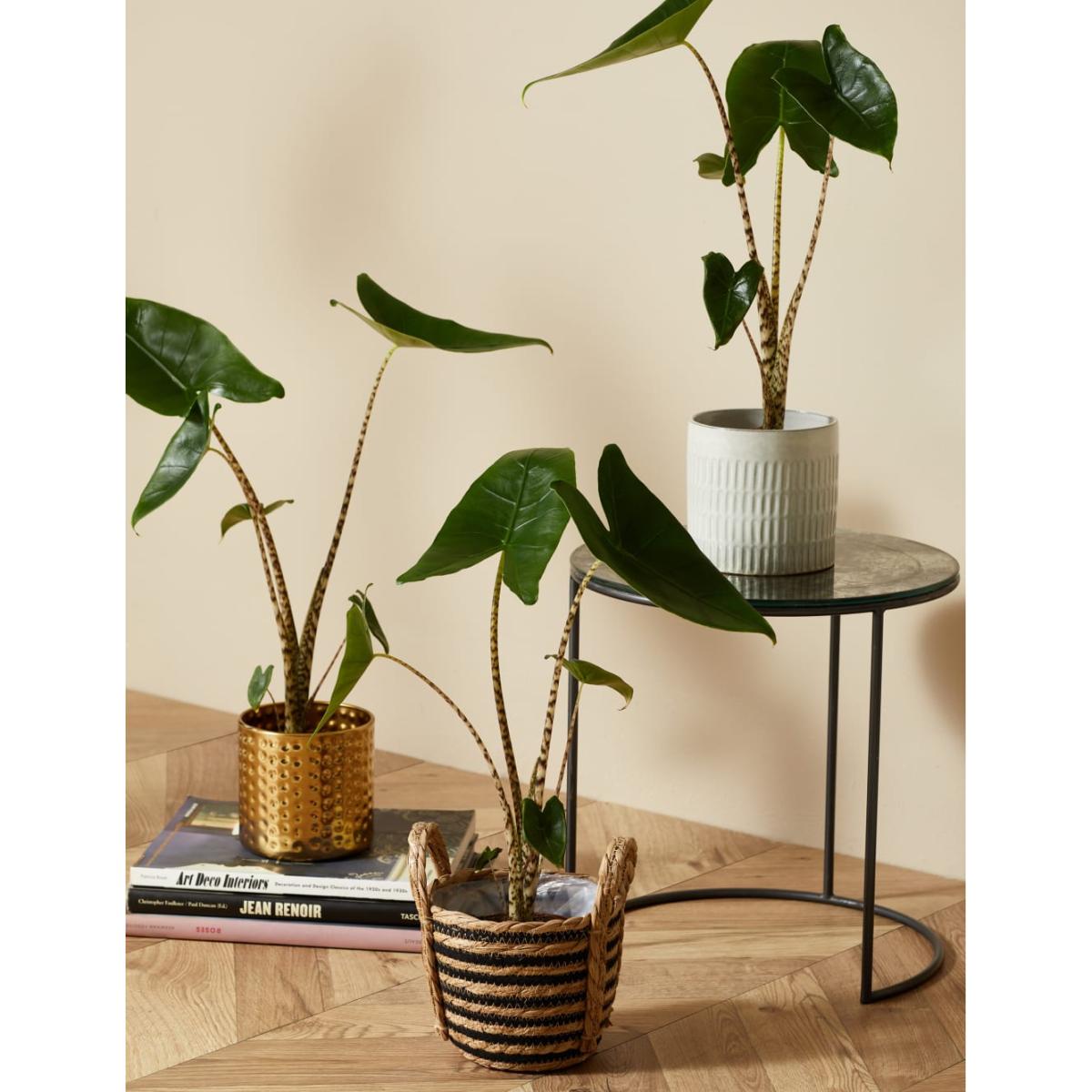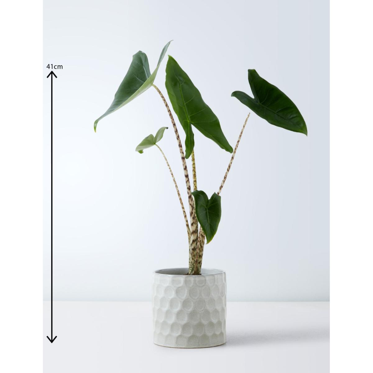 This medium-sized Alocasia Zebrina plant has dramatic arrowhead-shaped leaves growing on slender, structural stems for a striking look. It comes complete with a textured ceramic pot that's been crafted in Portugal. Colours may vary slightly throughout the season.
