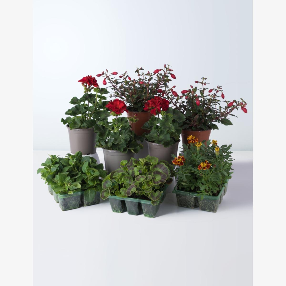 A combination of multicoloured bedding plants to brighten up your borders, pots or containers. Contains 3 pots of Geraniums, 2 Fuchsia, 1 pack of Petunia, 1 pack Marigold and 1 pack of Geraniums. Colours may vary slightly throughout the season.