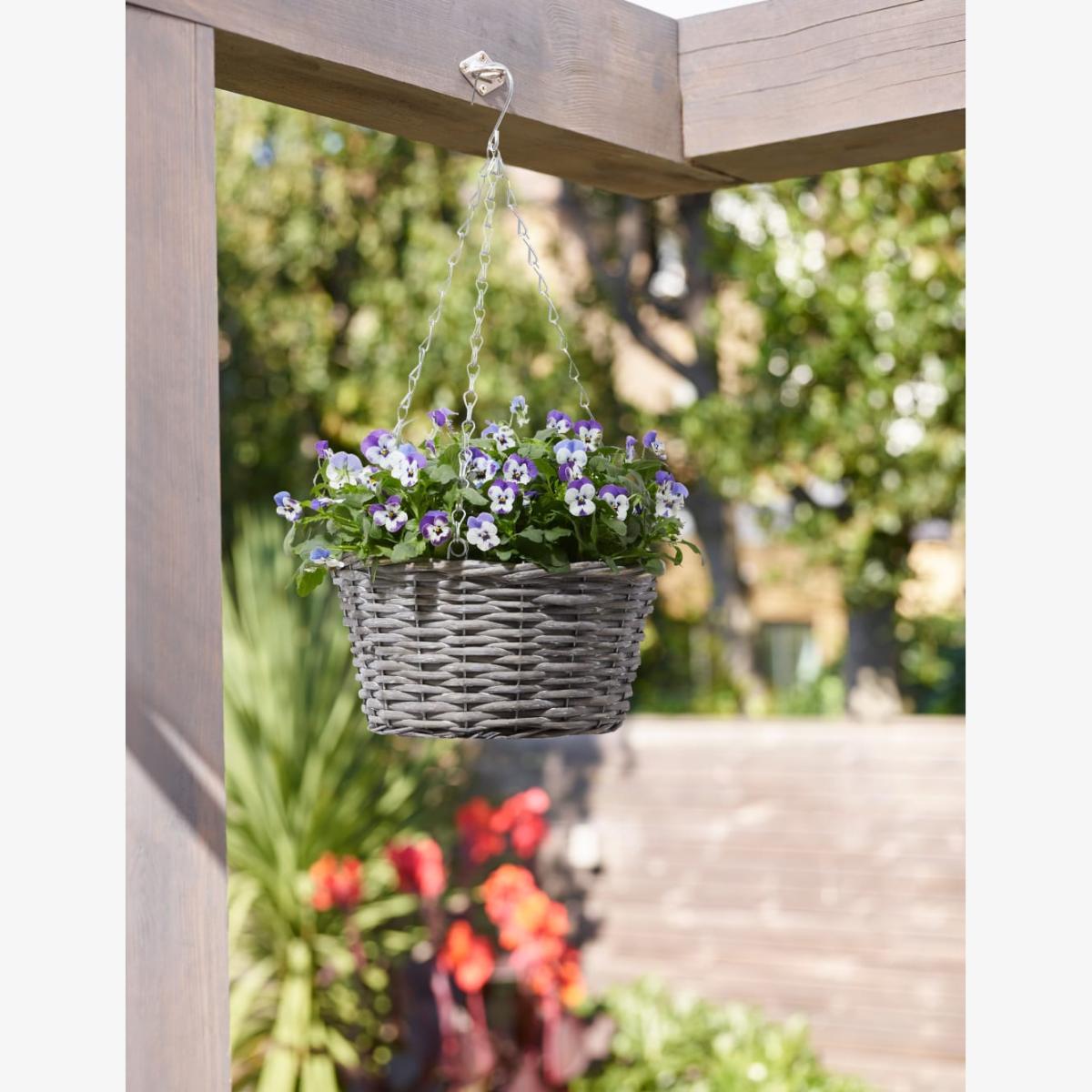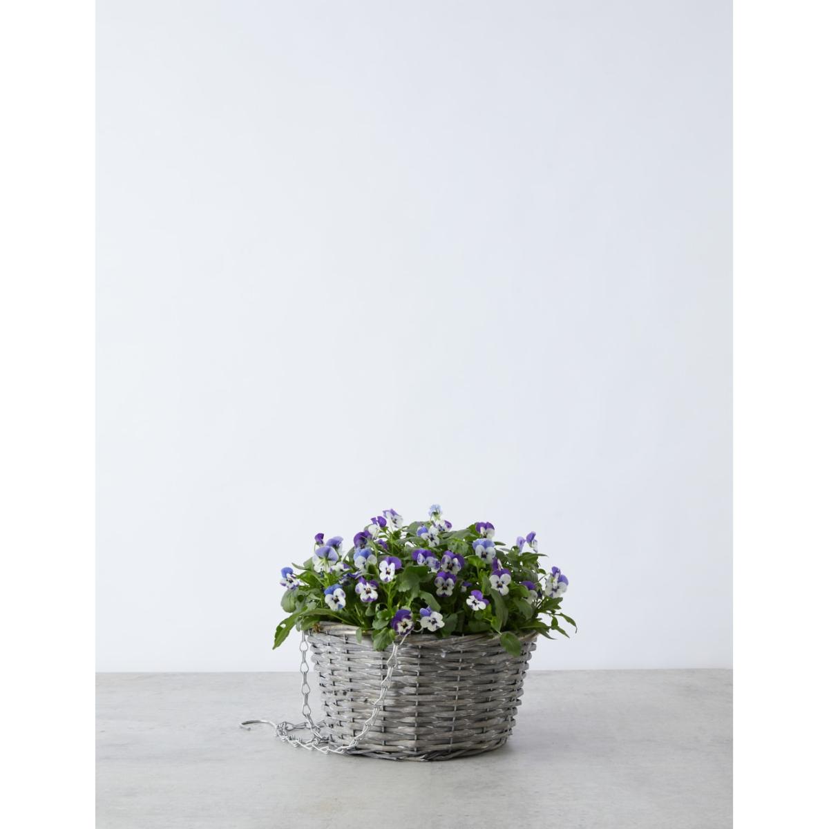 Add a cheerful touch to your loved one's garden or balcony with this colourful hanging basket. The stylish wicker-style design is filled with pretty pansy flowers, which have a delicate, sweet scent to enjoy. Colours may vary throughout the season.