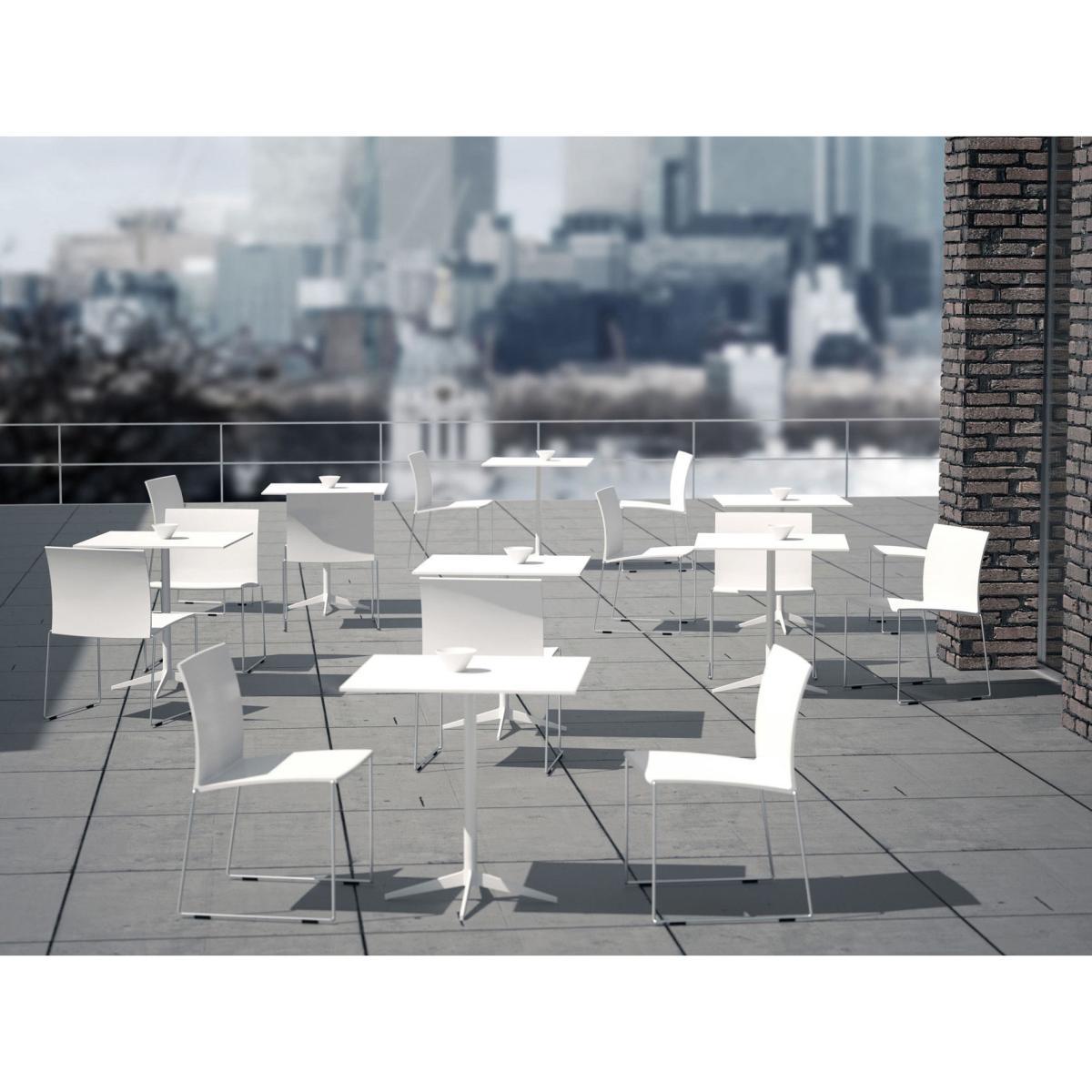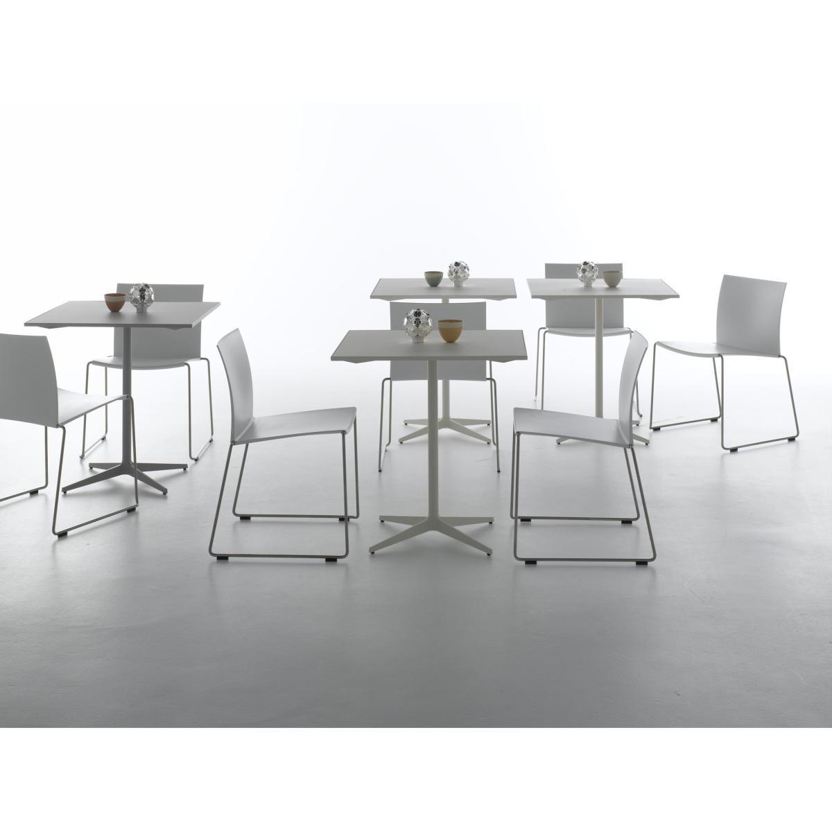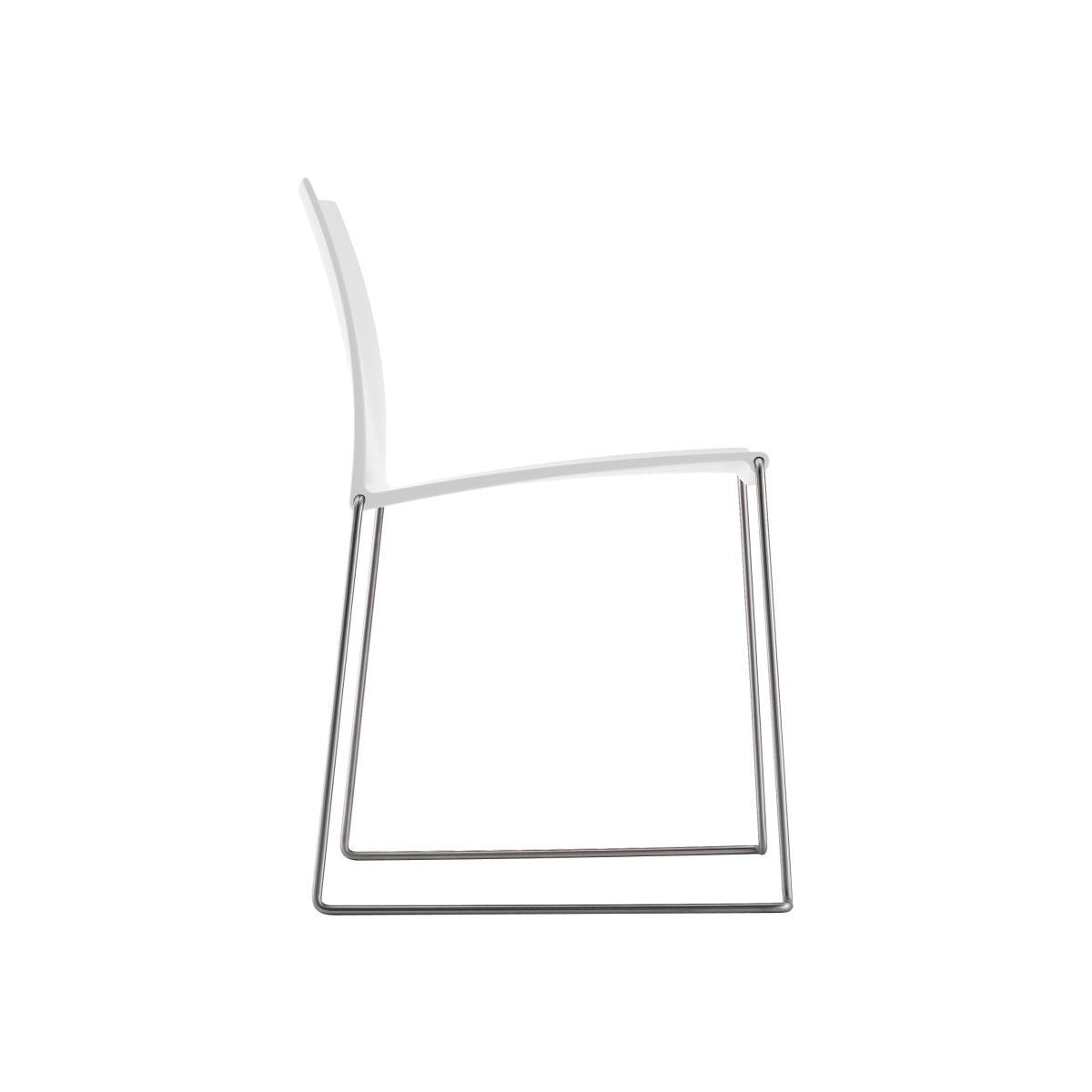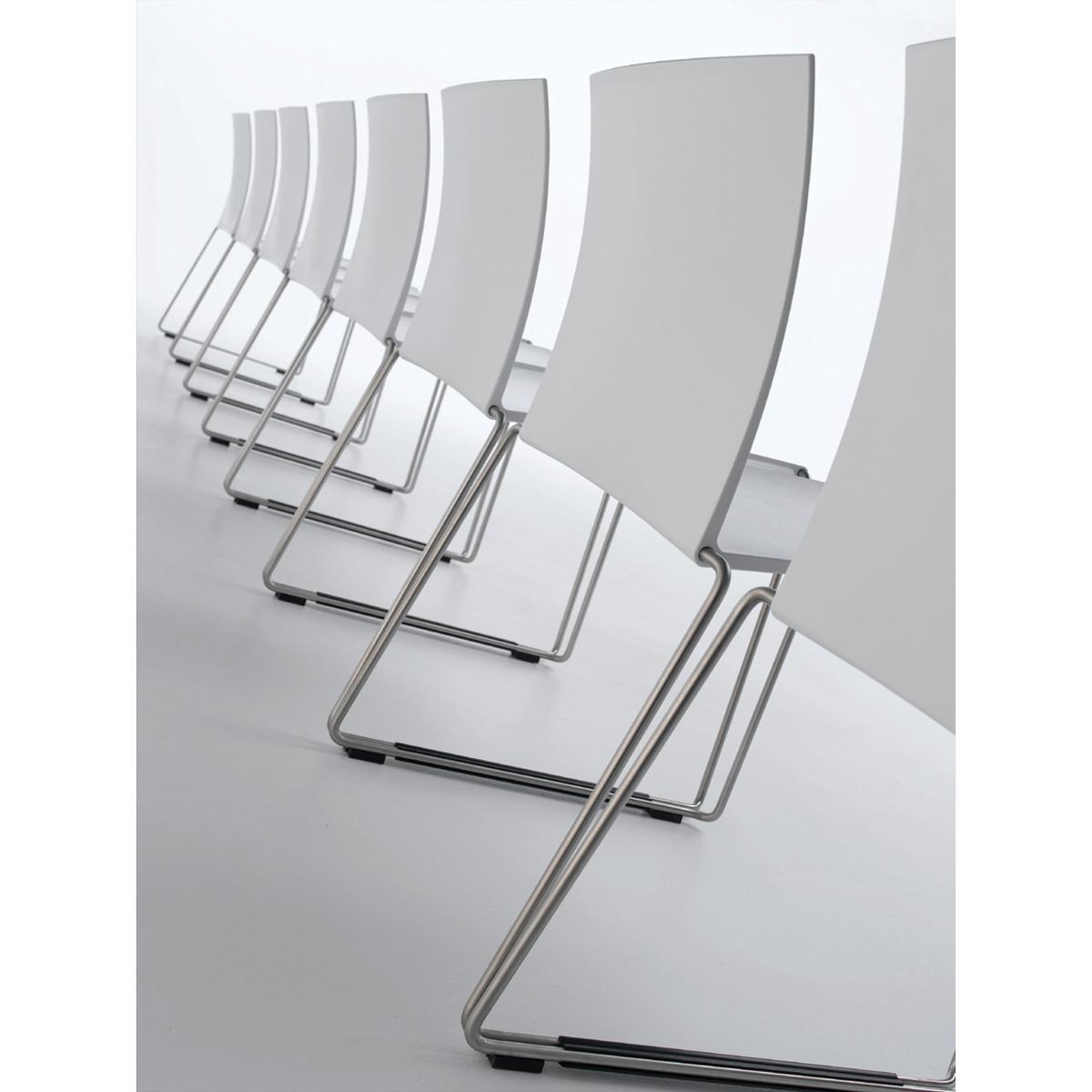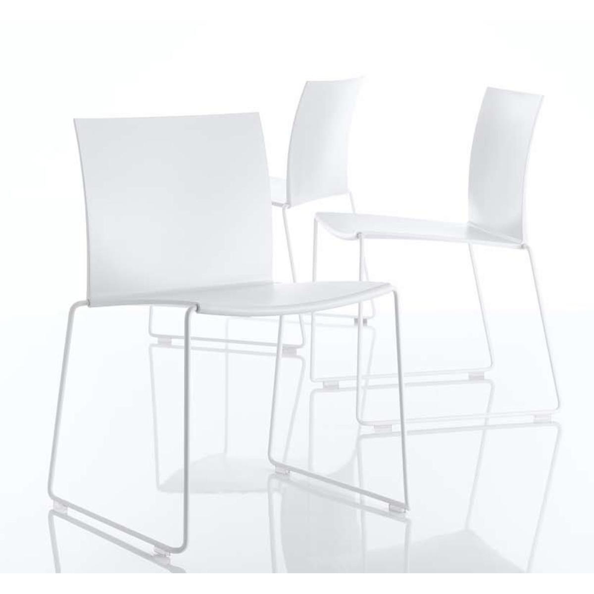 Chairs with a shell from plastic material white. Base from stainless steel or lacquered with a matt white finish. Fully recyclable.