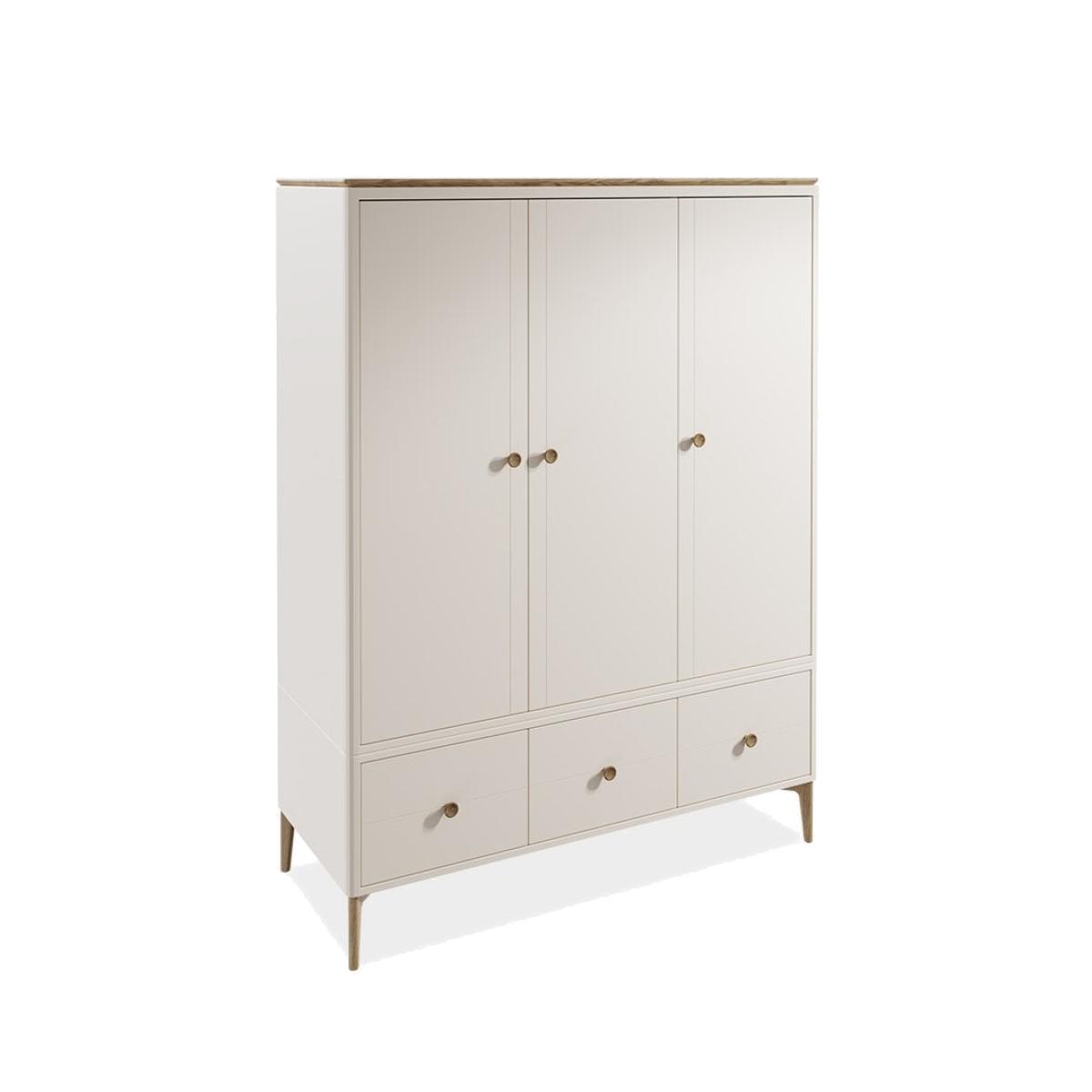 With its taupe-painted finish accented with natural light oak handles and legs, the Mabel Wooden Wardrobe brings Scandinavian style into your home. Designed by the award-winning British furniture designer Tim Fenby this wardrobe is a classic with a clean and airy style in a light taupe hue. With three doors reveal a spacious alcove for clothes and two separate drawers beneath for smaller items. View The Mabel Range