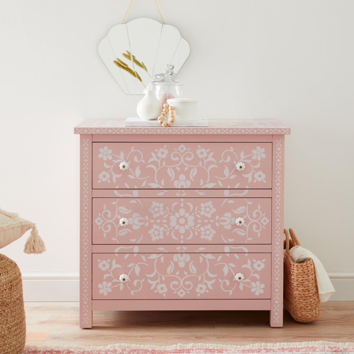 Dunelm Exclusive – Designed and Developed by Dunelm. The Mabel Blush Patterned 3 Drawer Chest is the perfect elegant and feminine touch that's sure to elevate the look of any bedroom. Featuring an intricate, screen printed floral pattern, the chest has been finished in a stylish blush shade and complementing contemporary handles. This chest of drawers is stylish and practical, providing 3 drawers for a great amount of storage perfect perfect for storing away all your clothes, bedsheets, and more.
