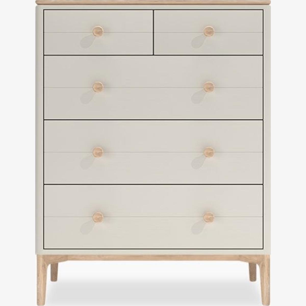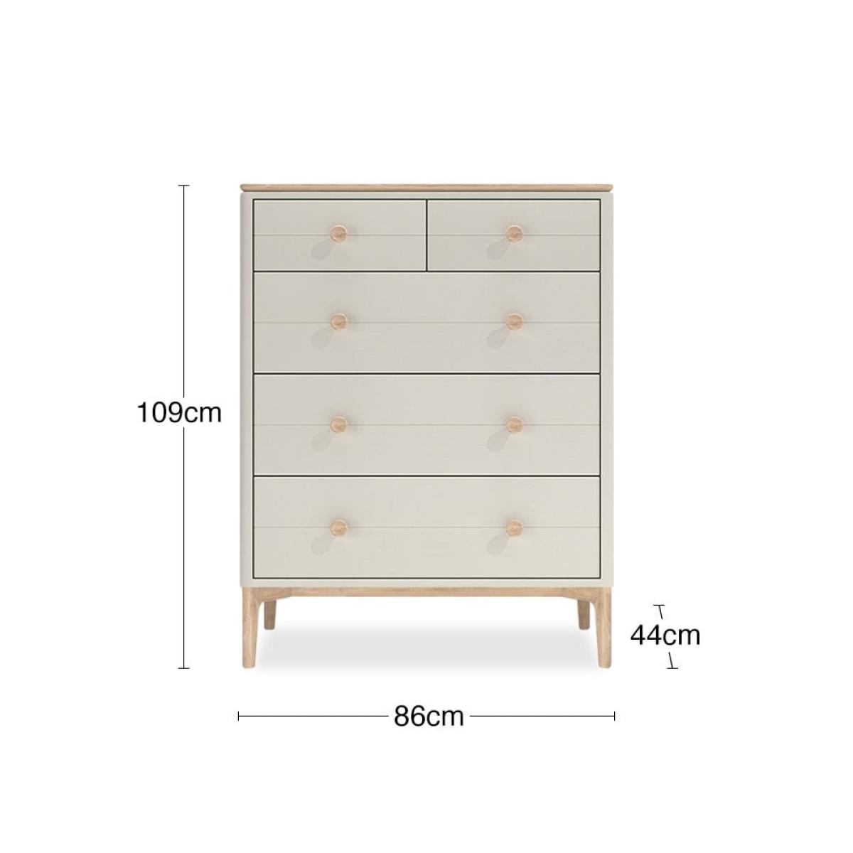 With its natural light oak wood and taupe-painted finish, the Mabel Wooden Chest of Drawers brings Scandinavian style into your home. Designed by the award-winning British furniture designer Tim Fenby this chest of drawers is a classic with a clean and airy style in a light wood stain. With five spacious drawers, there are ample amounts of room for all belongings allowing your bedroom to breathe, free of clutter. View The Mabel Range