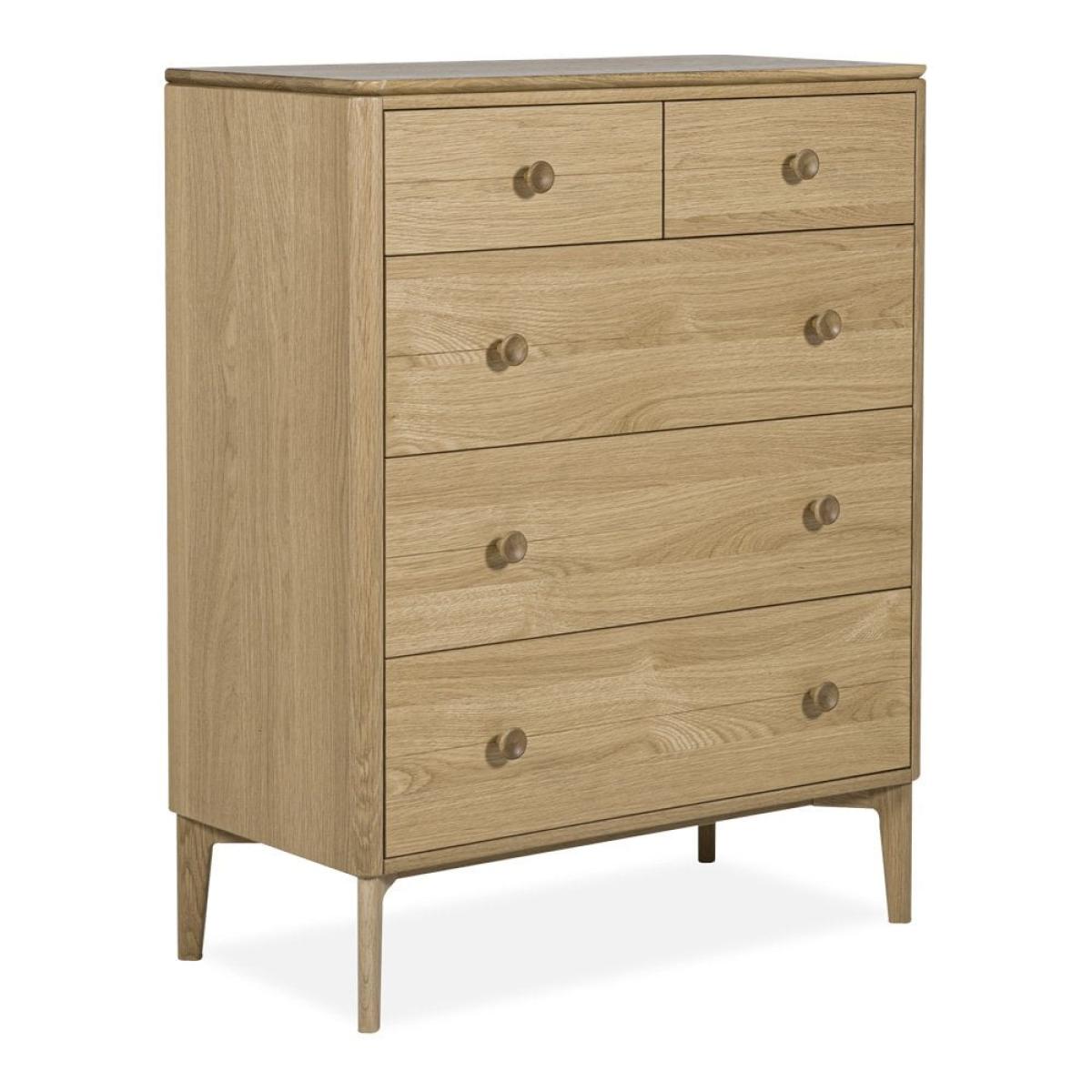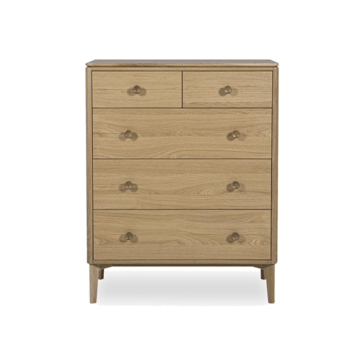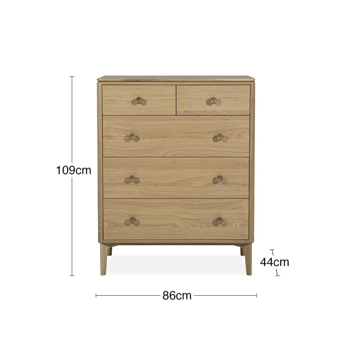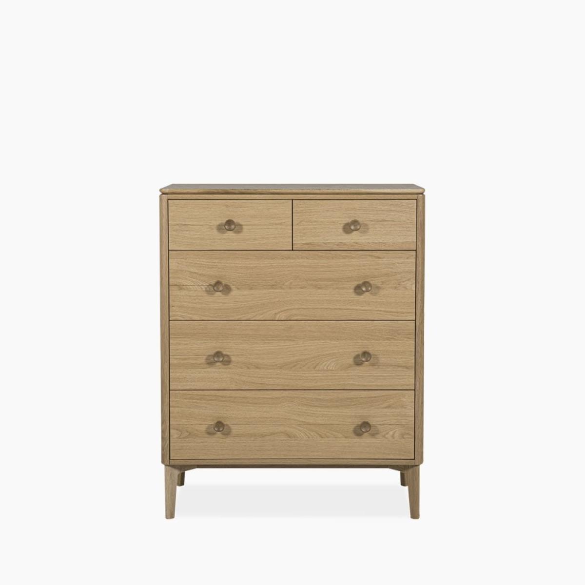 With its natural oak wood finish, the Mabel Wooden Chest of Drawers brings Scandinavian style into your home. Designed by the award-winning British furniture designer Tim Fenby this chest of drawers is a classic with a clean and airy style in a light wood stain. With five spacious drawers, there are ample amounts of room for all belongings allowing your bedroom to breathe, free of clutter. View The Mabel Range