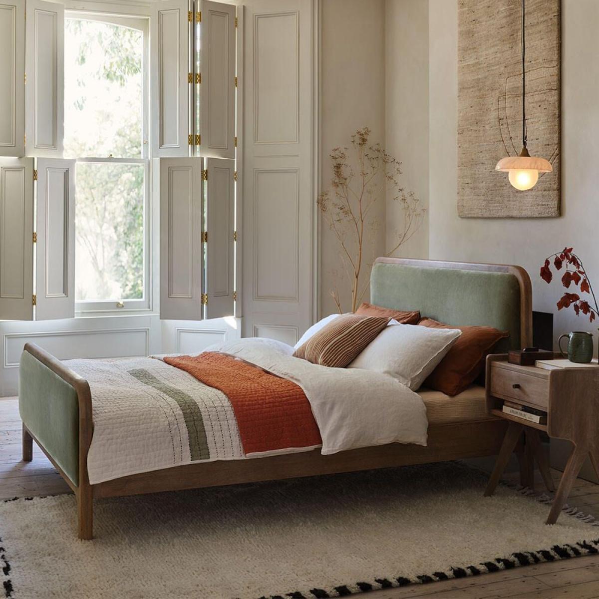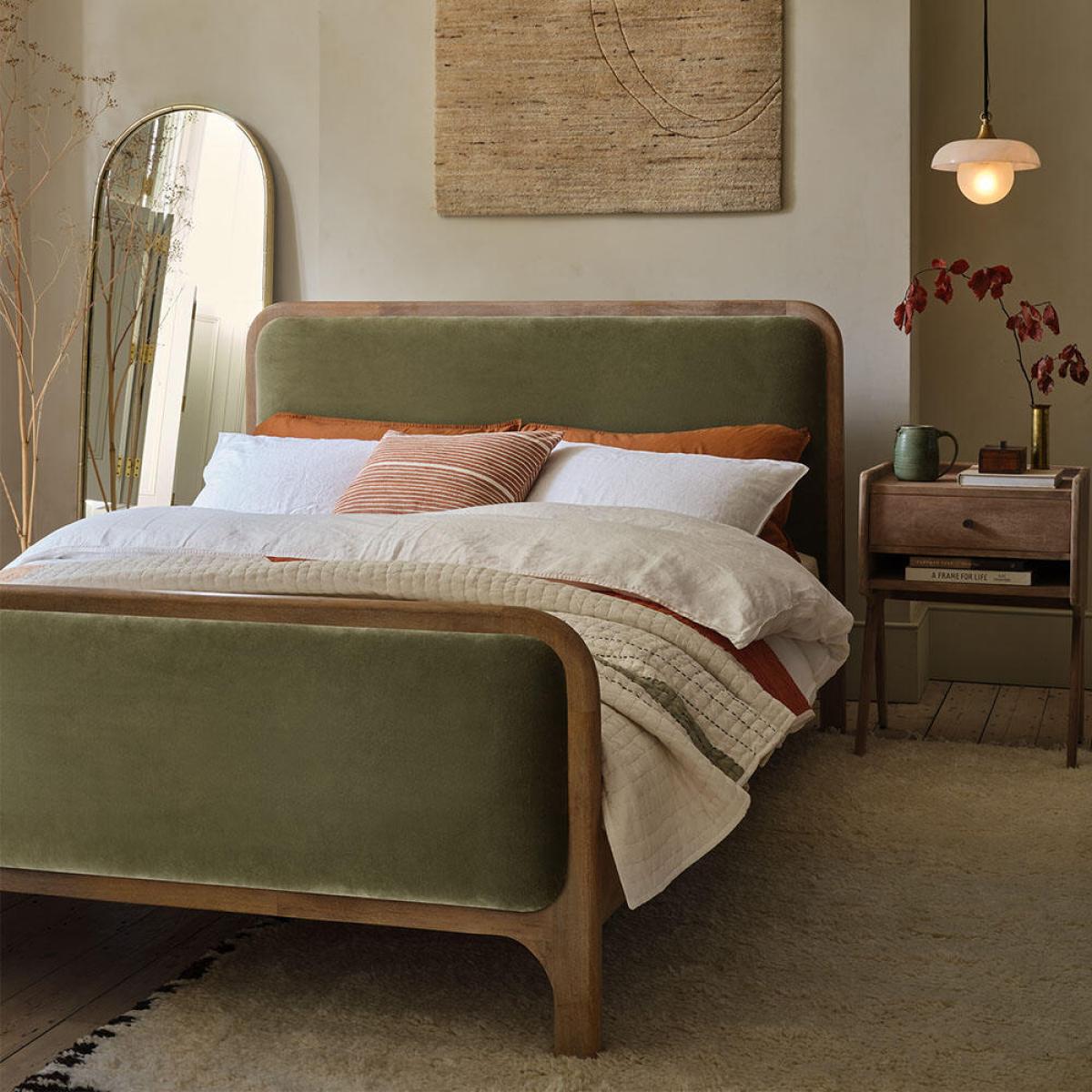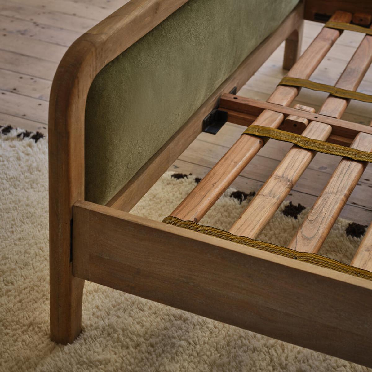 Make a statement in the bedroom or guest room with our classically-styled Mabel King Size Bed. Lovingly crafted from natural and sustainable mango wood and with a headboard and footboard upholstered in a luxurious and cosy Olive Green cotton velvet, it’s perfect for unwinding in and drifting off into a peaceful night’s sleep. The traditional styling with soft curved edges and upholstered detail of the bed complements all bedroom styles while the moss green velvet enhances any existing décor. This generous bed comes with strong slats to support a mattress for great comfort. Bedframe only. Mattress not included.