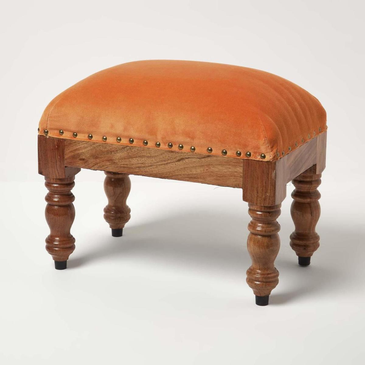 Handcrafted solid wood footstool from Homescapes. Combining modern colours and expert design, the Mabel velvet footstool is the perfect addition to any home. A timeless piece that is comfortable, practical and stylish, this versatile pouffe will add a pop of colour to your interior design. Upholstered by skilled artisans, the 100 cotton velvet is generously filled with durable polyester fibre that will retain its shape for years to come. Finished with press-stud edging and sitting on stained and lacquered solid wooden legs this sturdy footstool can be used as a footrest, occasional seat or even emergency coffee table! Rich in colour, this jewel-toned footstool is part of Homescapes velvet collection, allowing you to mix and match and create the perfect look for your home. The range includes velvet chair pads, throws, cushions and bean-filled pouffes available in colours including burnt orange, mustard, pink, teal and grey. The Mabel velvet footstool comes in 2 sizes. A square pouffe measuring 40 x 40 cm and 25 cm tall, and a larger rectangular footstool measuring 50 x 30 cm and 40cm tall.