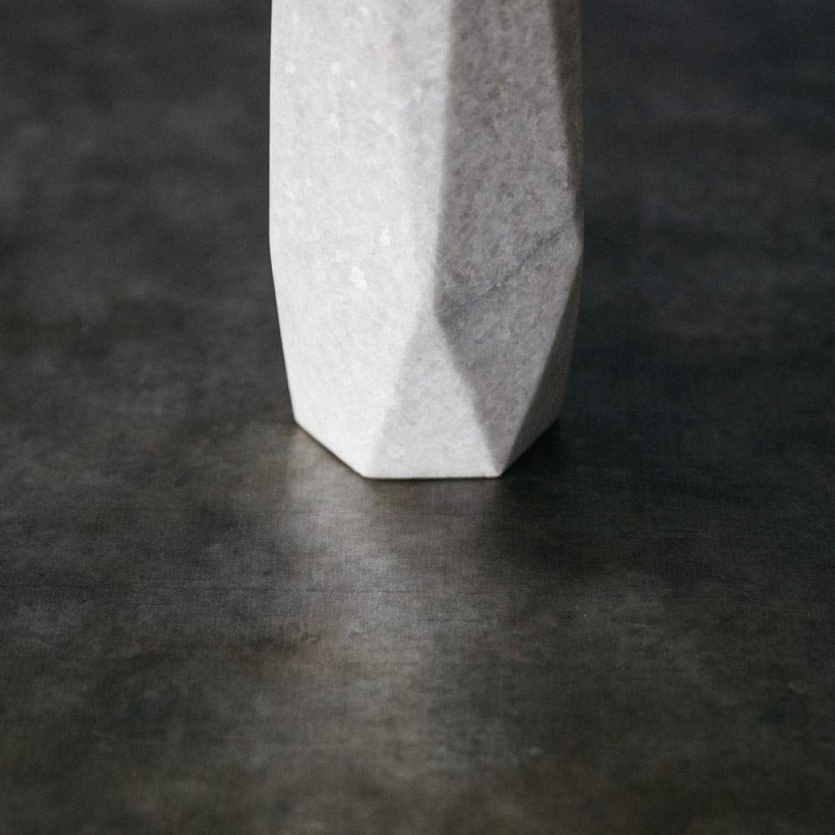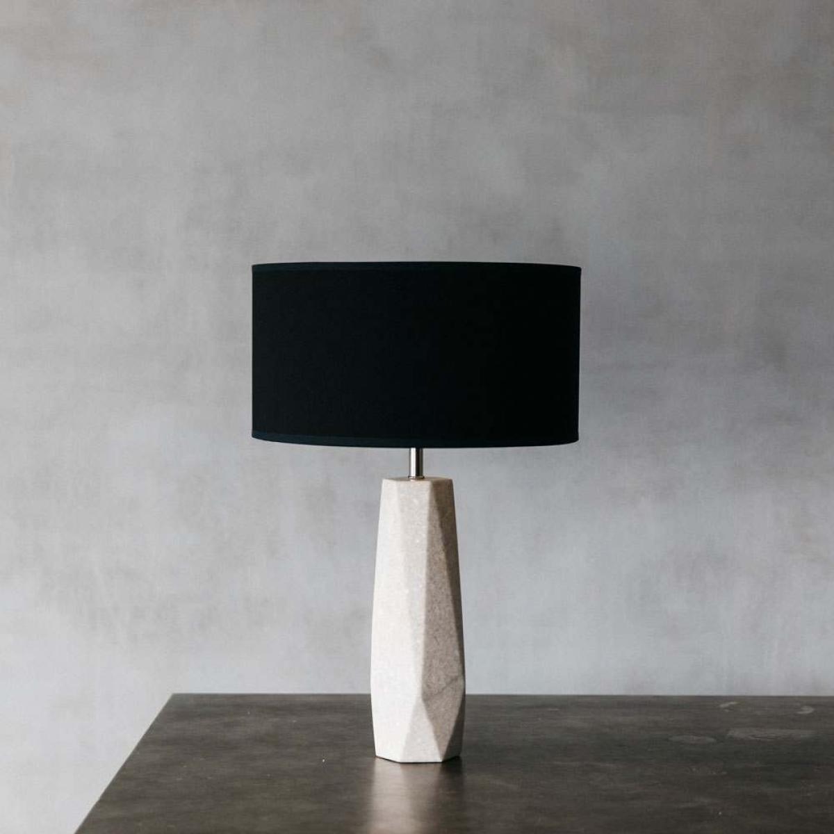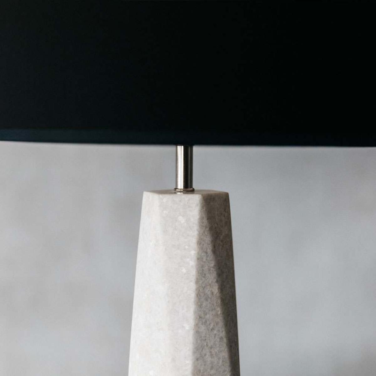 A contemporary table lamp hand carved from natural white marble with a geometric design and subtle, soft edges. Finish with a lamp shade in a rich jewel tone to add to the opulence of this light.