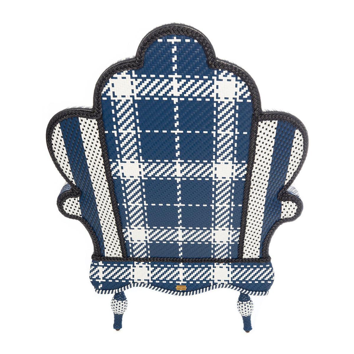 Kick back in style this summer on this Boathouse outdoor wing chair from MacKenzie-. Childs. Made from weather-ready hand-woven resin wicker in a brightly bold geometric plaid and stripe pattern done in navy and white wrapped on powder-coated iron, this comfy chair includes a reversible Sunbrella cushion that’s Royal Dots on one side and Royal Checks on the other.
