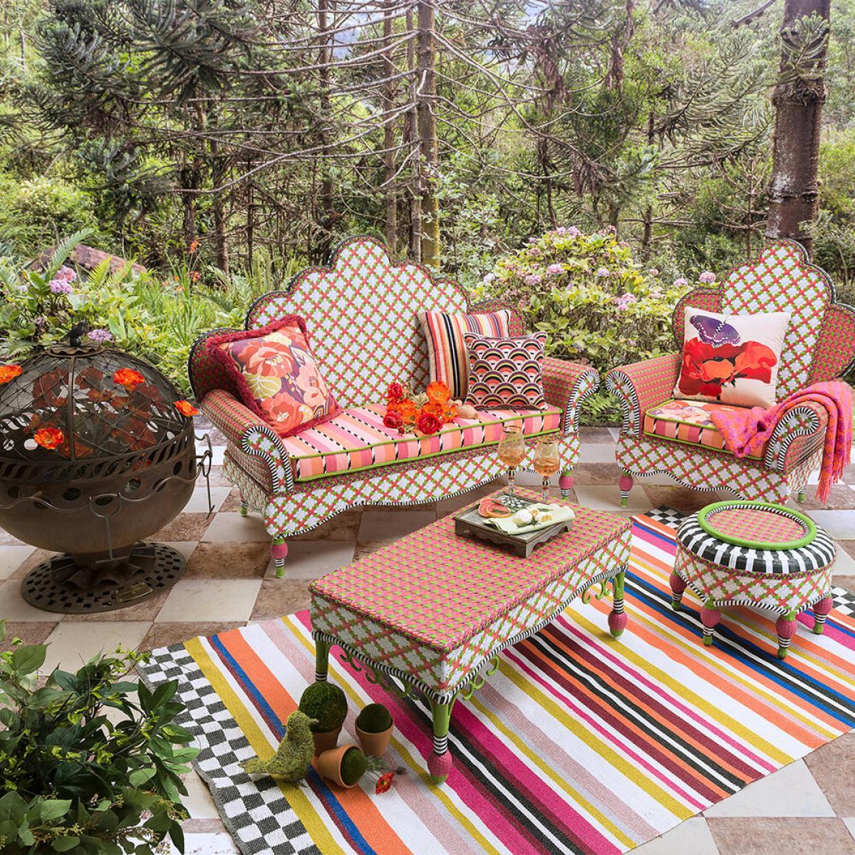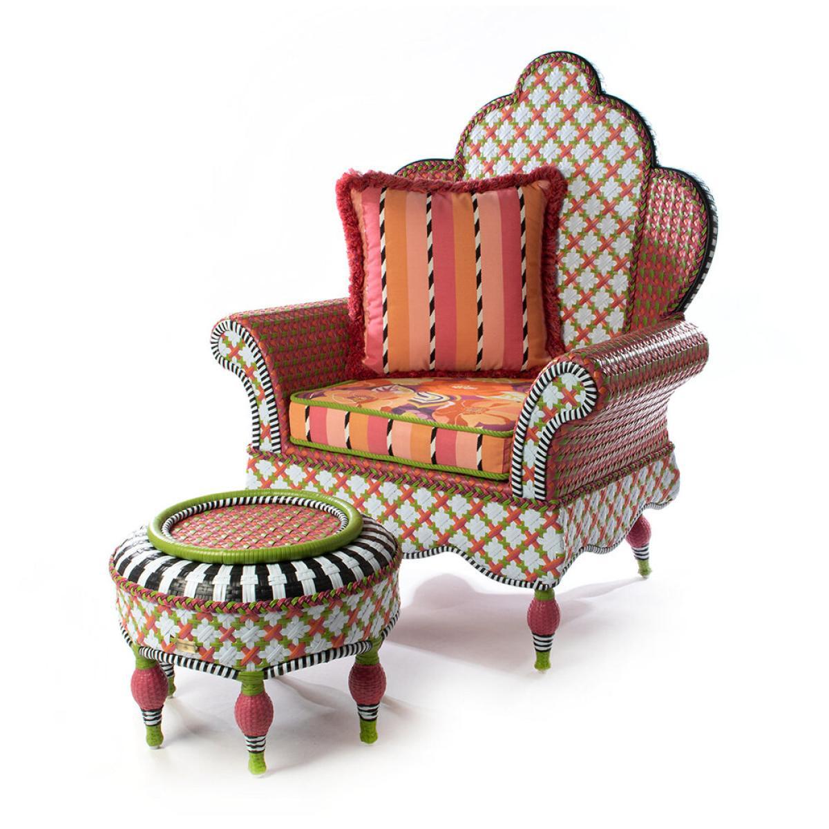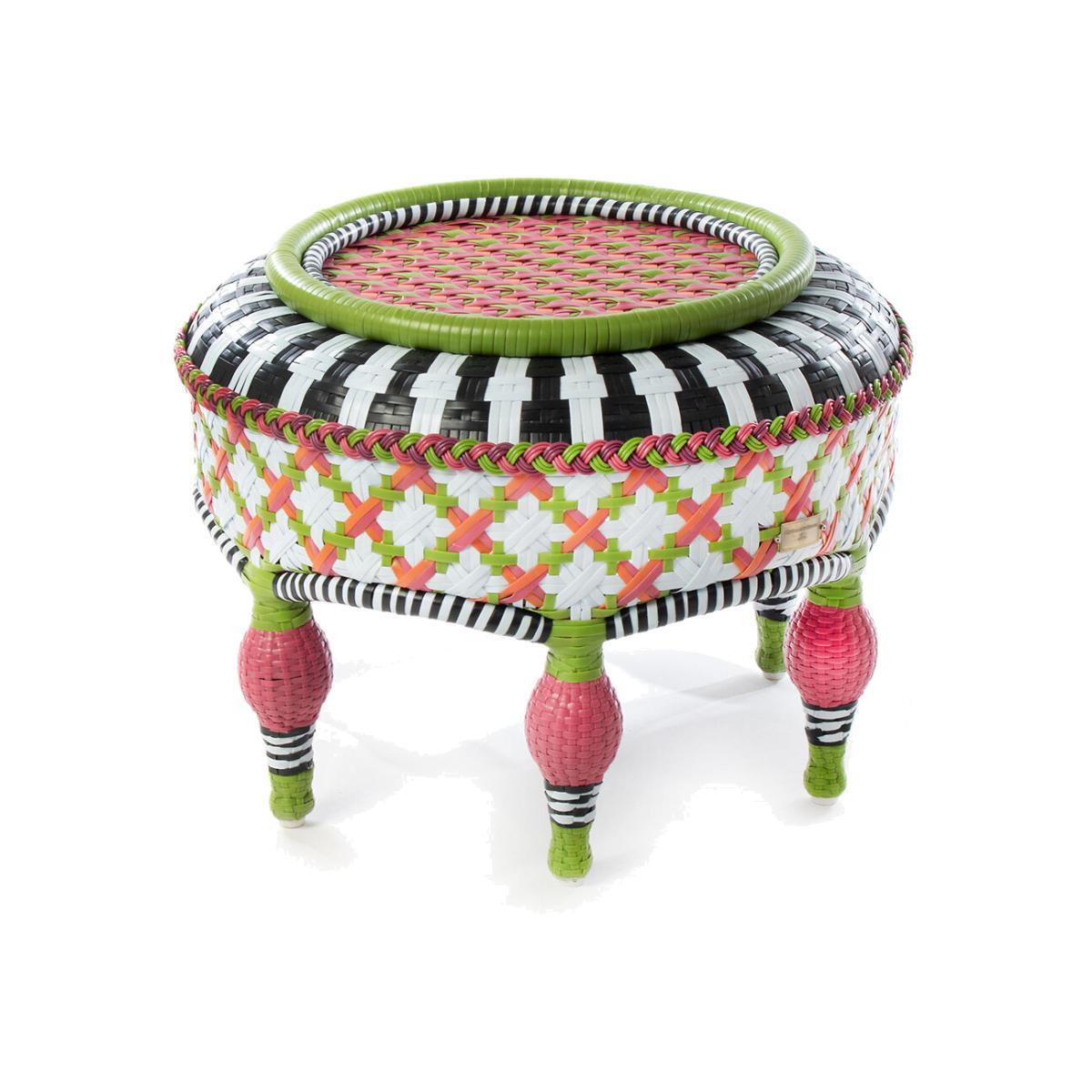 Kick back in style with this Breezy Poppy outdoor ottoman from MacKenzie-. Childs. Made from weather-ready hand-woven plastic wicker, it features bright and bold geometric pink, white, chartreuse, and salmon tones wrapped on a PVC frame. Pair with matching furniture available separately from MacKenzie- Childs to complete the look.