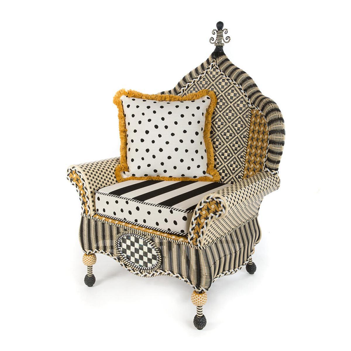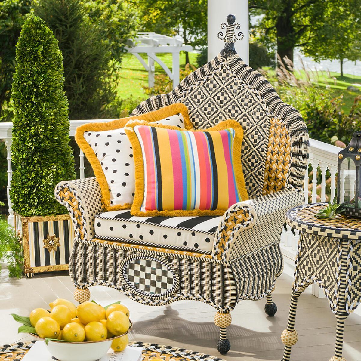 Take a seat all summer long on this Courtyard outdoor wing chair from MacKenzie-. Childs. M. Ade from weather-ready hand-woven resin wicker with a bold geometric pattern wrapped on powder-coated iron, this outdoor chair includes a Sunbrella cushion that features multicoloured stripes and reverses to a bold black and white stripe.