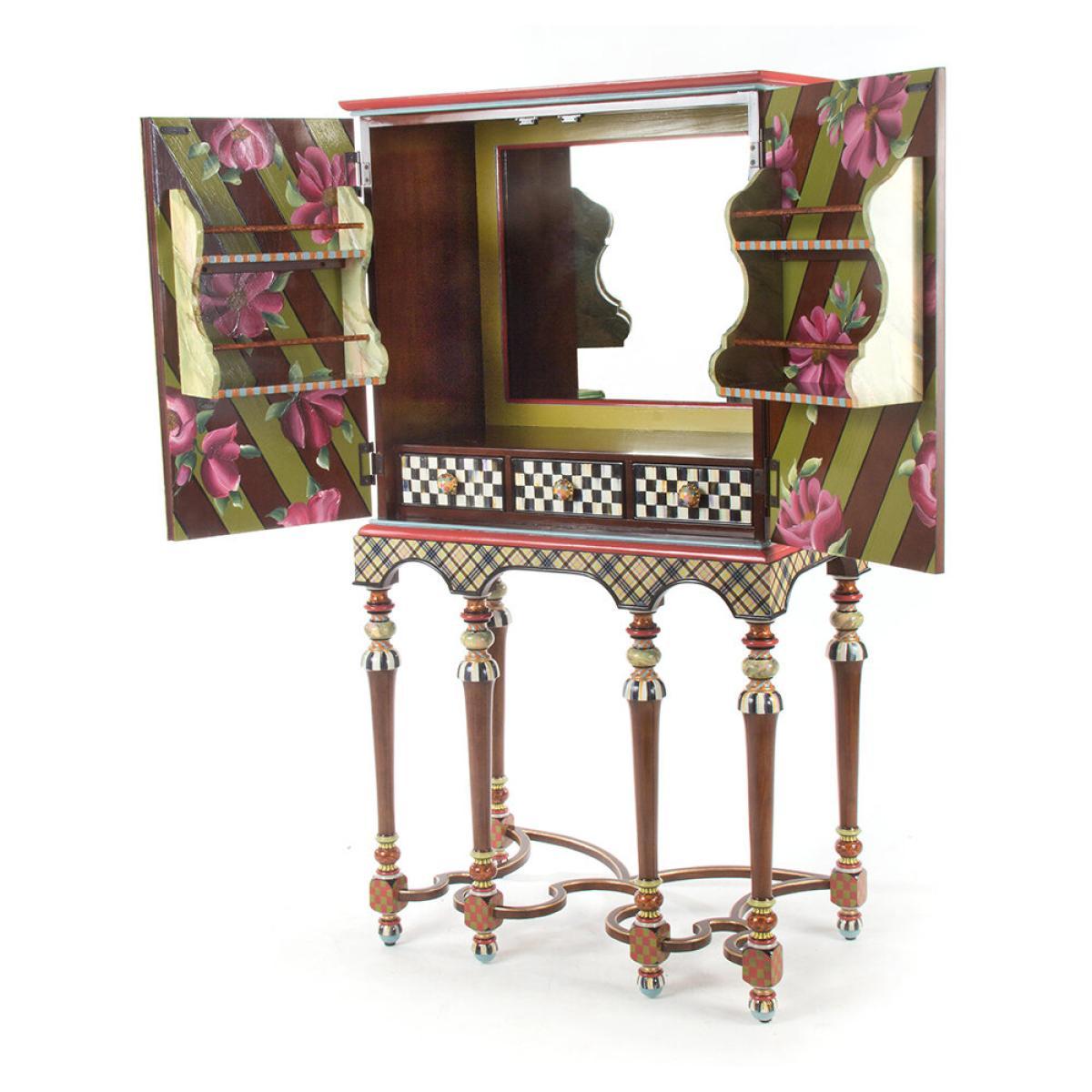 Cheers to this Foxtrot bar cabinet from MacKenzie-. Childs. Crafted from Gmelina, this charismatic cabinet sits upon four long graceful legs and features the iconic Courtly Checks and jauntily tasselled doors. Open the hand-painted doors to reveal a burst of colour and blooms and a mirror back panel with shelves and drawers for all of your bar tools.