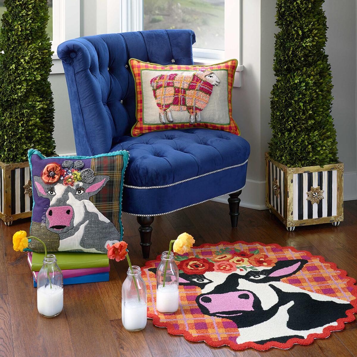 Add a touch of whimsy to your setting with this Frida Cowlo rug from MacKenzie-. Childs. Made from polyester, this rug features a beautiful bovine with a crown of flowers on a background of colourful checks.