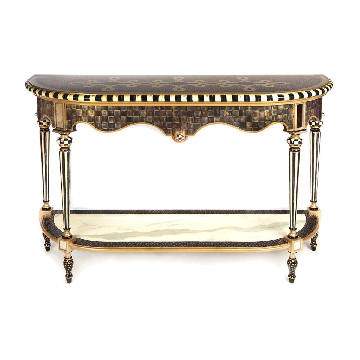 This Golden Hour cocktail console table from MacKenzie- Childs will bring some charm into your interior. Crafted from wood, it’s been hand-painted by skilled artisans in Aurora, New York, and features a scroll design on top and has been accented with dots and Courtly Stripes and a Courtly Check ceramic knob. For a touch of luxe, it’s been finished with antiqued mirror panels on the apron and a faux marble insert on the bottom shelf.