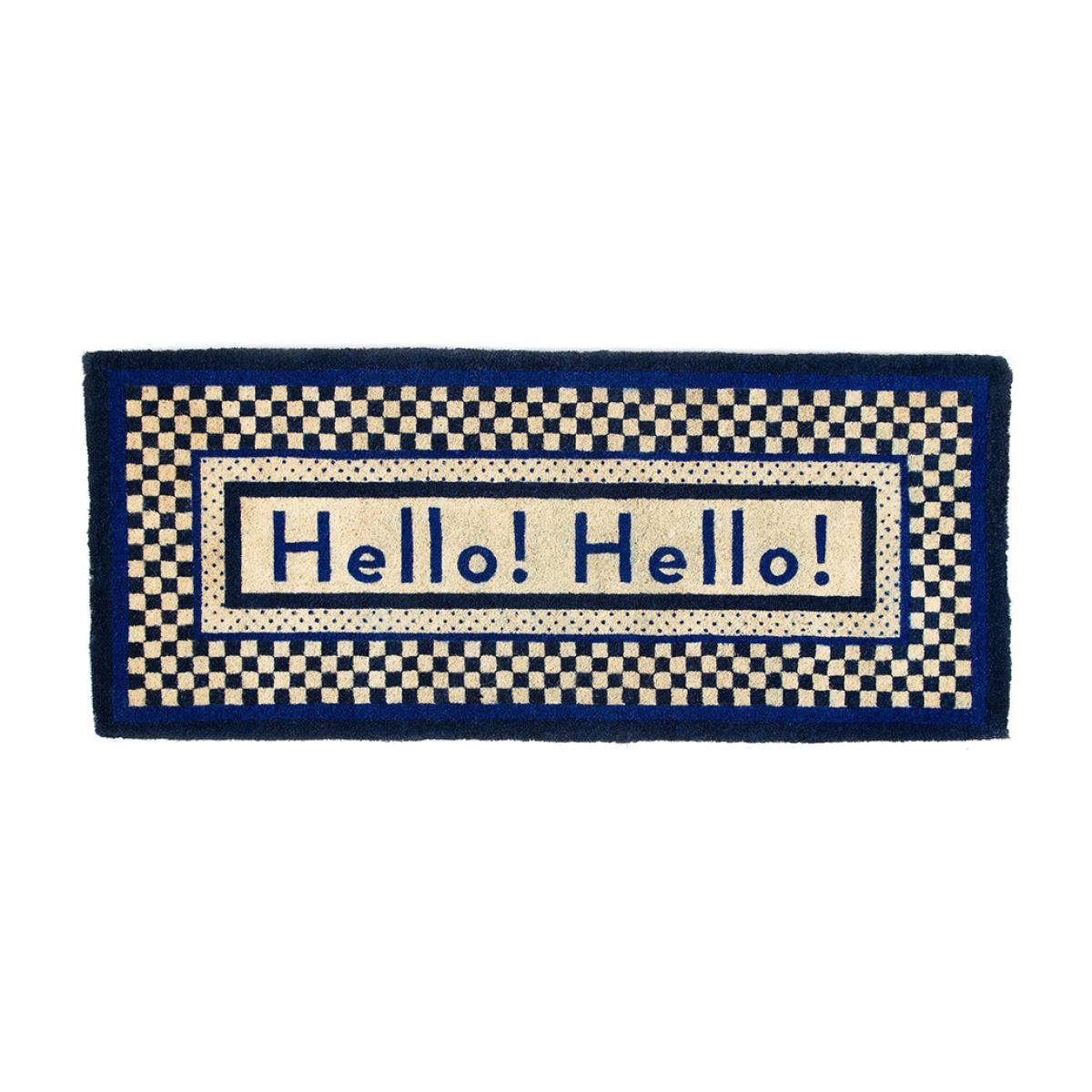 Greet guests in style with this double entrance mat from MacKenzie-. Childs. Made from natural coir, it features a friendly ‘Hello!’ welcome message and has been finished with the brand’s signature chequers in royal blue tones.