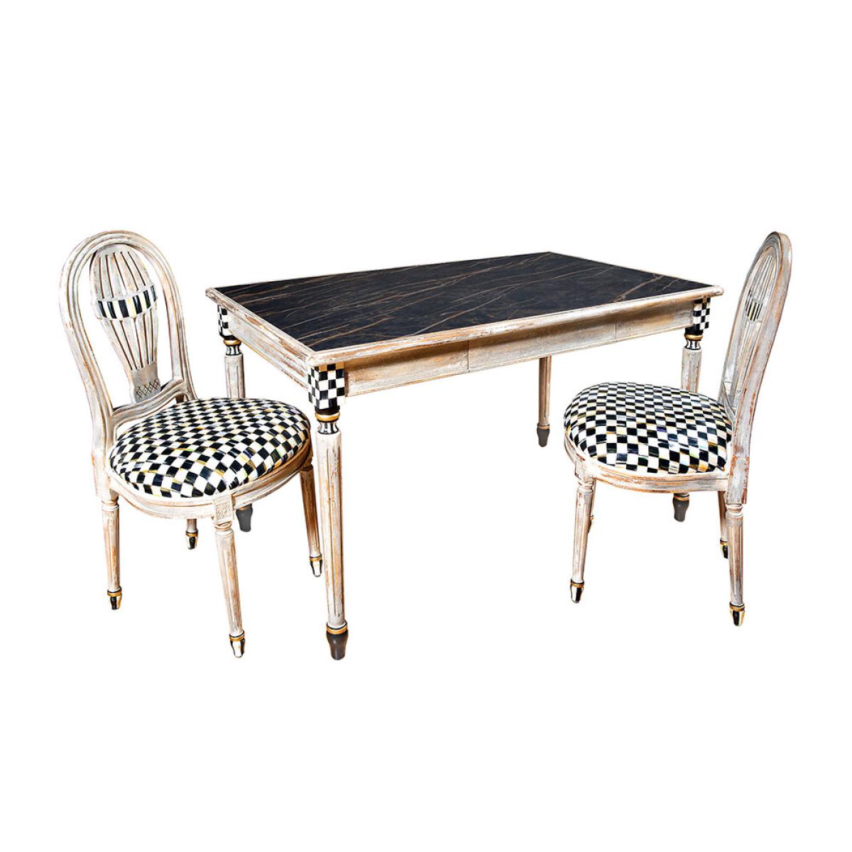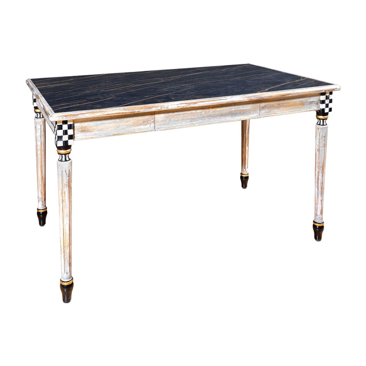 Make an eye-catching statement with this Tuscan Farm kitchen table from MacKenzie-. Childs. Made from hand-distressed beech wood, it is topped with a stain and heat-resistant tabletop that features a classic marble design. Complete with a hand-painted Courtly Check detailing, this beautiful table will make mealtimes more magnificent.
